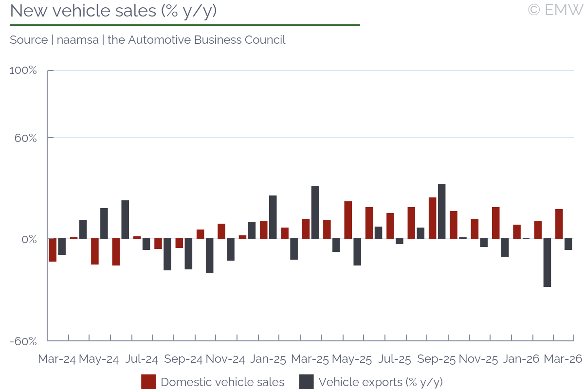 New domestic vehicle sales increased 17.3% y/y to 58,060 units in March, extending the strong upward momentum from February, according to data published by naamsa|The Automotive Business Council on Wednesday (Apr 1). This represents the strongest March performance since 2007, underscoring sustained resilience in domestic demand, naamsa said in the statement. Dealer sales accounted for 88.7% of volumes, with rentals at 5.5%, government 3.2% and corporate fleets 2.6%, indicating continued strength in retail demand and stable fleet activity. Passenger car sales increased 18.2% y/y to 39,370 units, while light commercial vehicle sales rose 15.7% y/y to 15,557 units. Medium commercial vehicle sales climbed 14.0% y/y to 823 units, and heavy trucks and buses increased 14.5% y/y to 2,310 units, which is linked to infrastructure spending, freight volumes, electricity costs, and business confidence, the industry body said. Exports, however, declined 5.3% y/y to 37,388 units, reflecting continued pressure from geopolitical tensions, rising protectionism, and structural shifts linked to decarbonisation in key export markets. While less severe than the contraction recorded in February, export performance remains weak on a three-month basis. According to naamsa, the domestic macroeconomic environment remained supportive in early 2026, aided by earlier interest rate cuts, improved consumer and business confidence, and previously moderating inflation. However, the outlook has deteriorated more recently due to rising global oil prices linked to geopolitical tensions in the Middle East, which have driven a sharp increase in domestic fuel prices. The resulting increase in transport and logistics costs is expected to generate an inflationary impulse, raising the total cost of vehicle ownership and potentially weighing on consumer purchasing power in the short to medium term. While temporary fuel levy relief provides some offset, it is unlikely to fully neutralise the underlying energy price shock. | ||||||||||||||||||||||||||||||||||||||||||||||||||||||||||||||||||||||||||||||||||||||||||||||||||||||||||||||||||||||||||||||||||||||||||||||||||||||||||||||||||||||||||||||||||||||||||||||||||||||||||||||