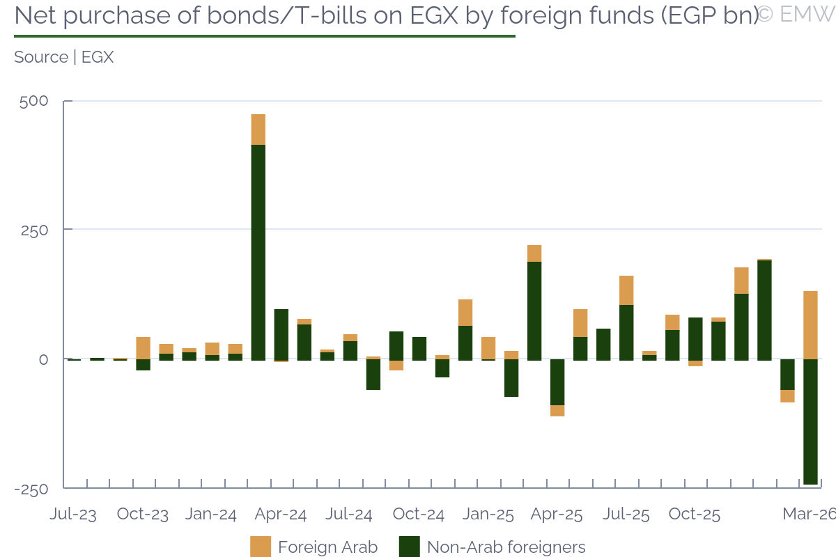 Foreign institutional investors bought EGP 674bn worth of T-bills and bonds through the local exchange (EGX) in March and sold EGP 784bn worth of the debt instruments, recording a net disposal of EGP 240bn (USD 2.1bn) in one of the most volatile months in recent years, according to data from the local bourse. The non-Arab institutional investors, who we believe are more sensitive to global and regional volatility, recorded a net outflow of USD 4.5bn in the month, while foreign Arabs were net buyers with USD 2.4bn, thus providing a significant support to the EGX amid the sell-odd triggered by the Iran War. Consequently, the pound which has been shored up by strong portfolio and remittance inflows over the past year, has lost around 11% of its value since the start of the war. On a positive note, the FX market appears to be liquid enough to accommodate a smooth and orderly exit, but there is still uncertainty how the war will end. It should be noted that the EGX does not provide a breakdown by type of instruments - bonds vs T-bills - but we believe that foreign demand is geared heavily towards the short-term notes. Foreign investors held USD 45bn worth of T-bills as of end-September, accounting for 42% of the outstanding stock and for 91% of CBE's official FX reserves. The CBE said that the foreign holdings include collaterals (contingent liabilities) worth USD 24.1bn, so the actual holdings are around USD 20bn.