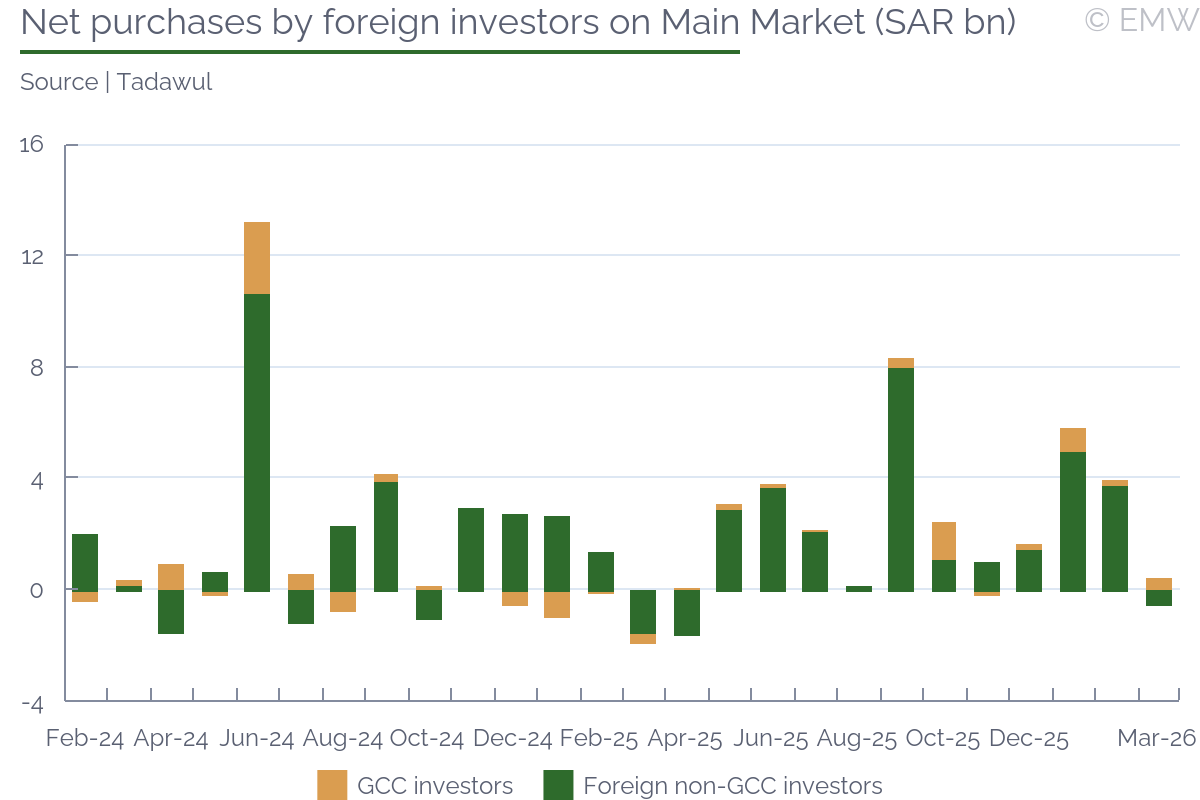 Foreign investors (excluding GCC funds) bought SAR 45.3bn worth of shares on Tadawul's main market in March and sold shares worth SAR 45.9bn, resulting in a net disposal of SAR 0.5bn (USD 140mn) worth of equity on the main market, according to data released by Tadawul. This is a relatively mild outflow when taking into account the severity of the regional crisis and the impact it has had on the GCC region and the global economy. Furthermore, the GCC funds were net buyers in the month, with a net inflow of SAR 0.4bn. One of the reasons for the relatively mild net outflow is that Saudi Arabia - unlike most of its GCC peers - has an alternative route for most of its crude oil exports via the Red Sea terminals. Consequently, Aramco's shares rallied in the month, which provided an overall boost to Tadawul's main market and masked the weakness in the other segments. It should be noted, though, that the Iranian attacks revealed the weakness in Saudi Arabia's economic diversification program, which was focused on real estate and tourism projects, as well as investments in advanced tech, such as AI data centers. These investments are based on manageable geopolitical risks and reliable security guarantees by the US. The daily average value of shares traded during March was SAR 5.8bn, rising by sharp 25.9% on the month. Meanwhile, the daily average number of trades rose by 10.4% to 452k, while daily average traded volumes rose to 268mn shares. As usual, bank shares topped the list for most value traded during the month, accounting for 22%, followed by Materials (18%), and Energy (10%). Total equity market capitalization rose by strong 11.8% year-to-date to SAR 9.86tn as of end-month, with foreign non-GCC investors holding 4.7% of all equities issued on the main market and 12.5% of free float. GCC's ownership was modest 0.8% and Saudi investors held 94.3% of all shares.