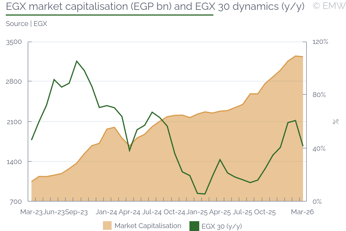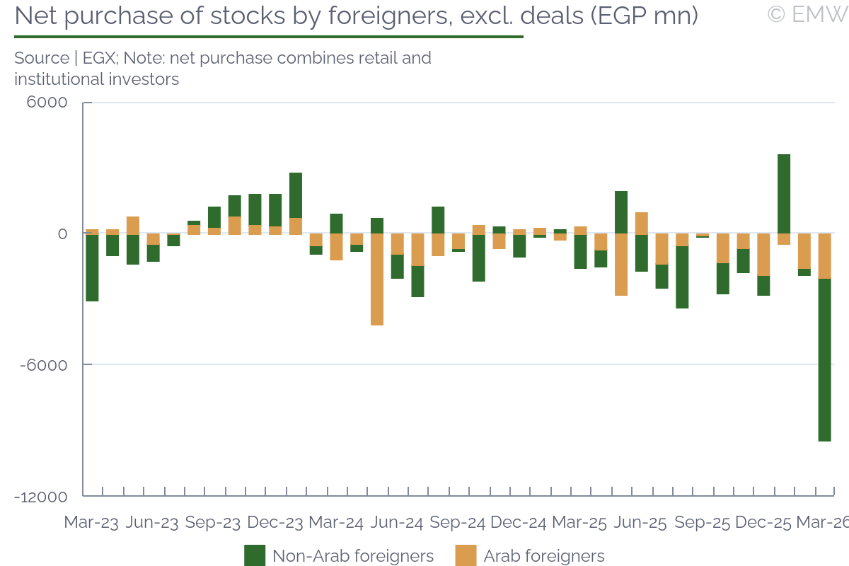 The benchmark EGX 30 index fell by strong 7.9% m/m in March as the war in Iran hurt the local equity and debt markets, according to data released by the stock exchange. Over the past two years, foreign investors were actively buying Egyptian T-bills on the EGX, and stocks accounted for less than 10% of the total value traded on the bourse. The Iran war triggered capital outflows, which hurt both the debt and the equity segments of the EGX. While net disposal of equity by foreign funds is relatively mild, the timing of this sell-off poses a severe challenge for Egypt - the government is about to restart the stalled divestment program and this time the program will focus on IPOs rather than searching for core investors who want to acquire majority stakes. Egypt has just announced plans to temporary list 20 state-owned companies in April. These companies will have six months to complete their paperwork for the upcoming stake sales. Foreign non-Arab investors remained net sellers of equity in March, recording a net outflow of EGP 7.4bn (USD 136mn), which is a record high, but pales in comparison to the USD 2.1bn net disposal recorded in the T-bill/bond segment. Foreign investors have been mostly net sellers since Feb 2020, worried by Egypt's large twin deficits and FX challenges, and the series of global and regional shocks that dragged on investor sentiments. Foreign non-Arab investors are likely to remain cautious about long-term investments in the country, until regional security improves and the government scales down its involvement in the economy. Foreign Arab investors remained net sellers as well, with a net outflow of EGP 2.0bn. GCC funds were expected to play a major role in acquiring stakes in state-owned companies when the IPO program resumes, but it remains to be seen how the Iran war affected their plans. Since the beginning of the year, non-Arab foreigners were net sellers of equity with EGP 4.0bn (accounting for 10.3% of all value traded in listed stocks after excluding deals), and Arab investors were net sellers with EGP 4.2bn. | ||||||||||||||||||||||||||||||||||||||||||||||||||||||||||||||||||||||||||||||||||||||||||||||||||||||||||||||||||||||||||||||||||||||||||||||||||||||||||||||||||||||||||||||||||||||||||||||||||||||||||||||