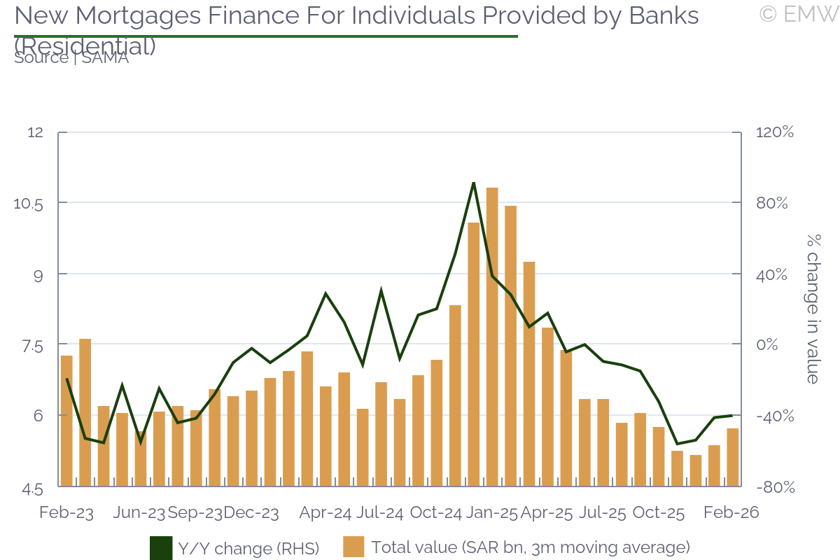 The value of new residential mortgage finance provided by banks to individuals fell for the eighth month in a row in February, by strong 39.7% y/y to SAR 5.4bn (USD 1.4bn) following another strong drop of 40.9% y/y in the preceding month, according to data released by the central bank (SAMA). The total number of new mortgage contracts fell by similar 29.0% y/y in the month, pointing towards prolonged slowdown in the mortgage financing segment. Meanwhile, the new mortgage finance provided by finance companies rose by sharp 38% y/y, but at SAR 267mn it remains negligible when compared to the mortgage loans provided by the banks. New mortgage financing reached its peak in late 2024 and has slowed sharply since then. This slowdown could be related to global and regional uncertainty, tightening liquidity, and high real estate prices. House prices in the capital have almost doubled over the past five years for certain units, and incomes levels have not risen at the same pace. Saudi Arabia opened its real estate market to foreigners on Jan 22, but we think the Iran War will drag on foreign investments as Iranian missile attacks showed the kingdom and the GCC countries as a whole are much more exposed to regional conflicts than previously thought. We remind that the value of new residential mortgage finances provided by the banks to individuals fell by 11.7% y/y to SAR 80.4bn in 2025. Growth in new mortgage financing rebounded in 2024, which was one of the reasons for the soaring prices in the real estate market. Indeed, residential prices - house rentals in particular - remain a major driver of consumer inflation and they are likely to remain elevated at least over the medium term as they reflect the limited supply that is struggling to catch up to strong demand from Saudis and expats. The government has taken measures to ease the limited supply of land, but we think that strong demand for housing will keep real estate prices and rentals elevated.