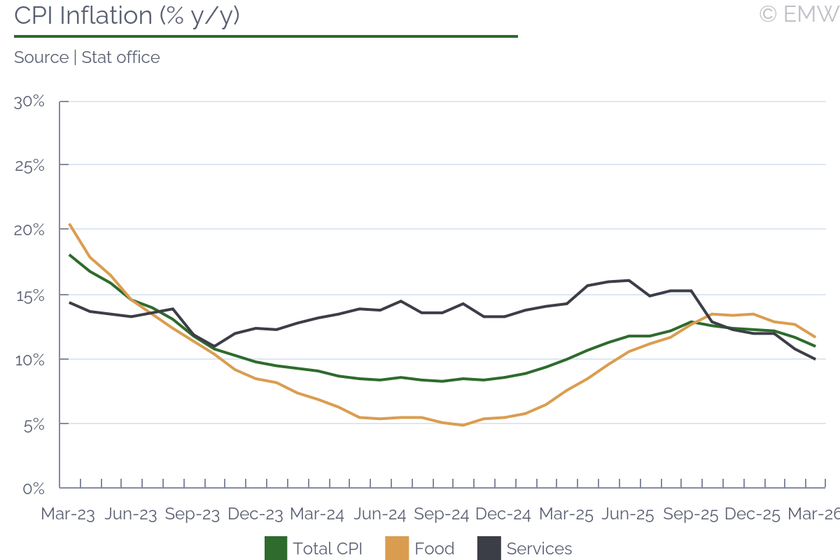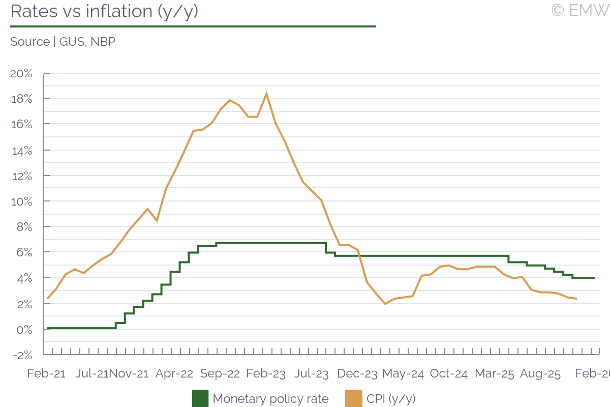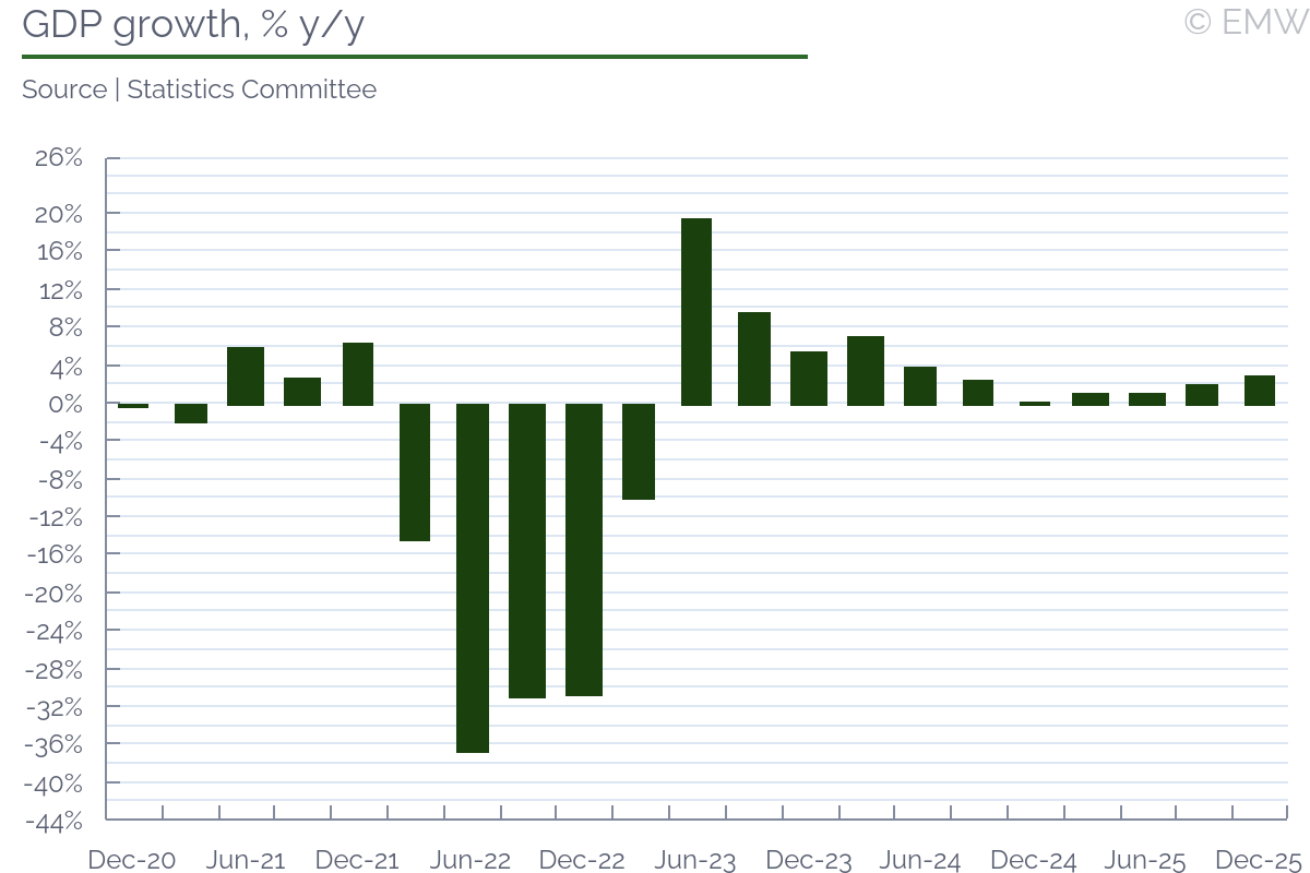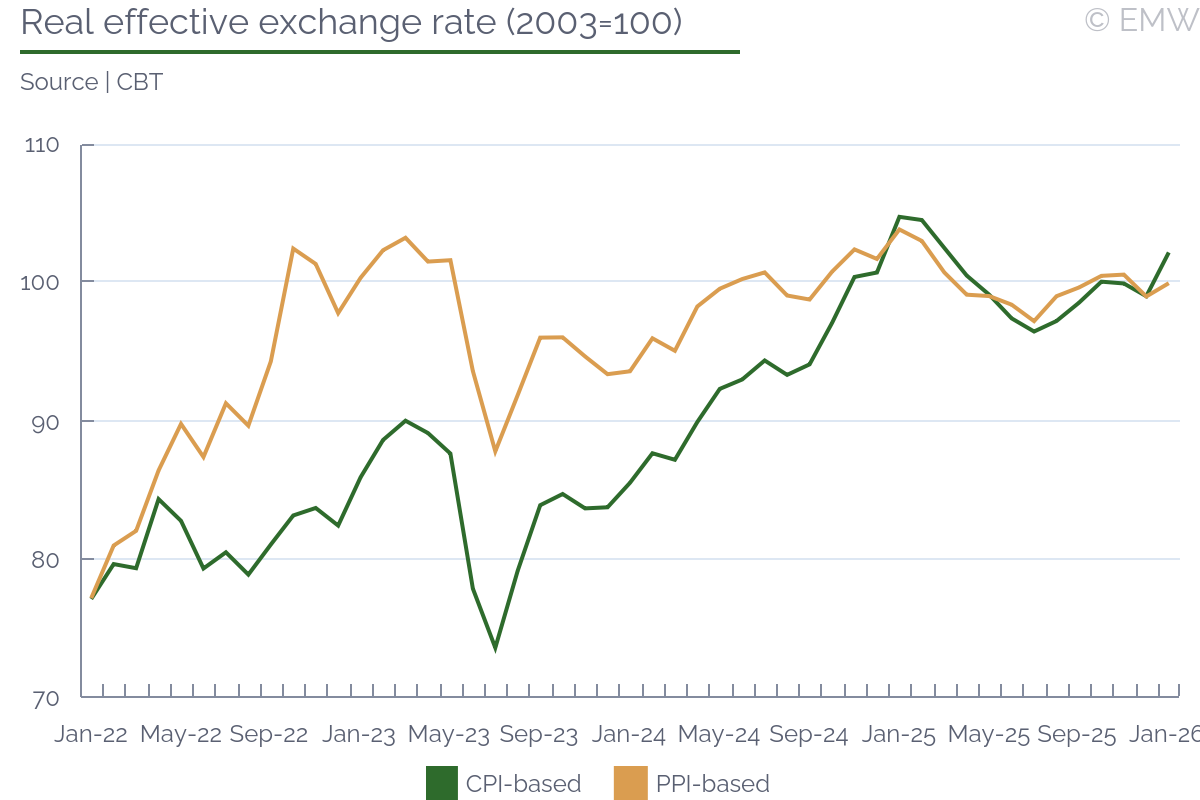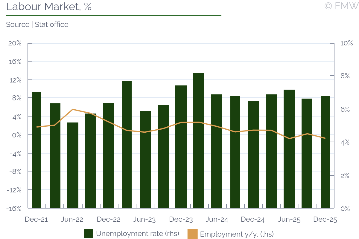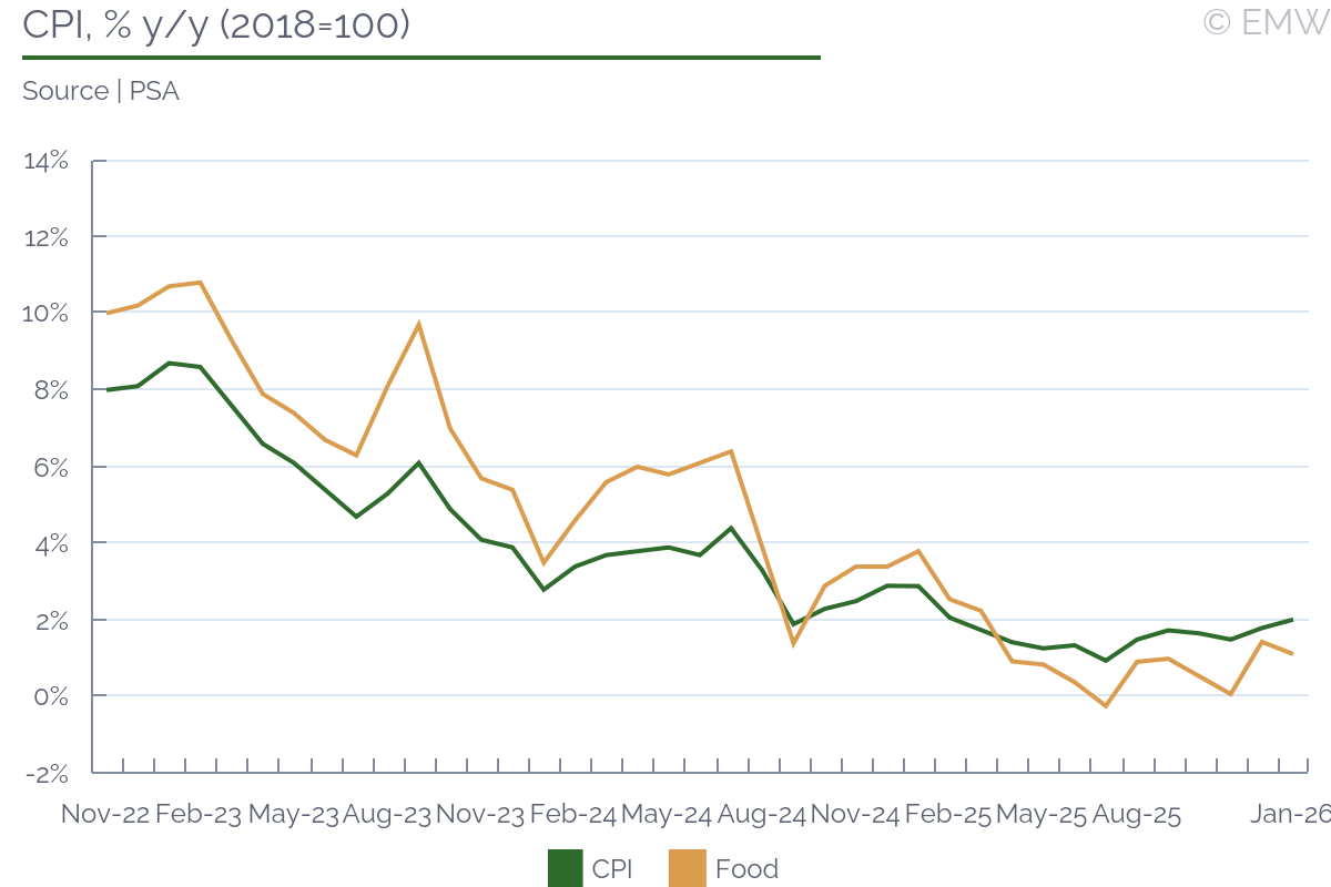 The country's CPI inflation rate slowed down further to 3.8% y/y in January from 5.4% y/y in December, hitting the lowest level since 1985. The VAT rate cut, from 21.9% to 20.0%, as of Jan 1 has had an effect on the headline print, but the biggest downward contributions came from food, clothing and footwear, housing and utilities, and alcoholic beverages and tobacco. Food inflation fell to 3.9% y/y from 4.9% y/y in December, reflecting annual drops in some vegetable, fish and egg prices. However, in m/m terms, food prices still rose by 1.1% m/m, unchanged from the preceding month. Non-food inflation fell even faster to 3.9% y/y from 5.8% y/y, which was due to monthly drop in prices of automotive and solid fuels, as well as of clothing and footwear, and alcoholic beverages and tobacco. The overall CPI rose by 0.2% m/m in January, slowing from 0.9% y/y in December, thanks to the 0.4% m/m drop in non-food prices. The drop in the inflation rate offers more scope for another rate cut by the central bank, possibly already at the next MPC meeting in March. At the meeting in January, it cut the rate by 250bps to 15.5%, after cutting it by a total of 1,000pps in 2025. The central bank said it expects inflation to stay within the medium-term target of 6-8% over the coming year, barring potential spillover from the hikes in utility prices and commodity market volatility. GDP growth is seen to remain strong this year and although this is seen to exert some demand-side pressures, the current monetary conditions are assessed as still tight relative to prevailing inflation dynamics.