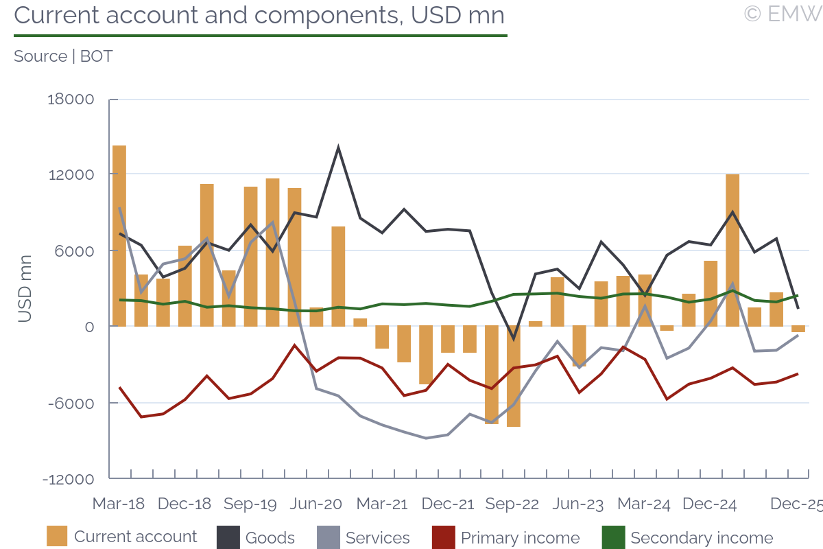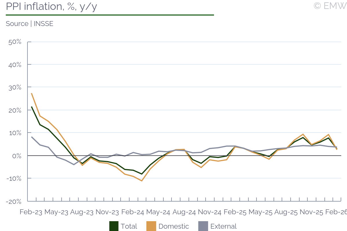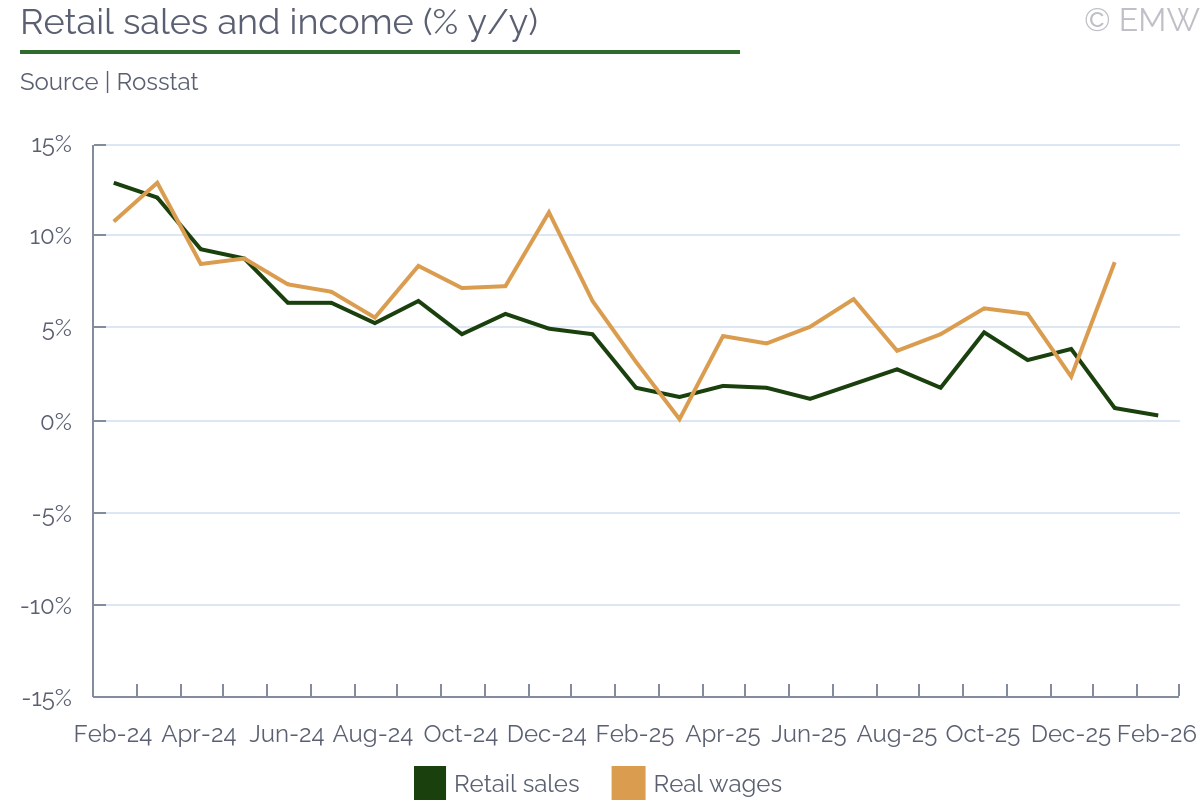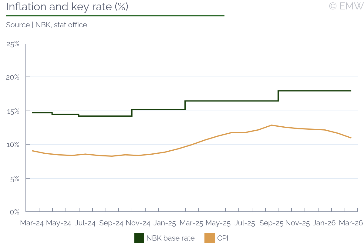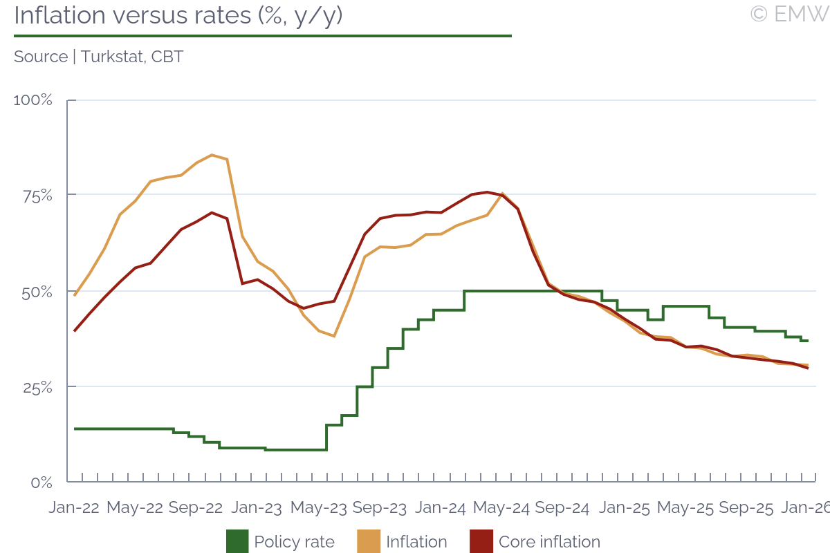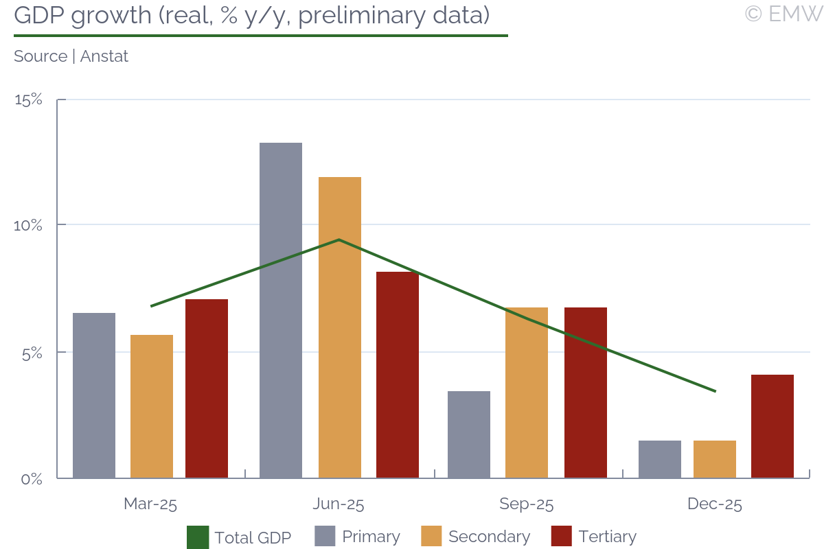 The country's CPI inflation rate slowed down further to 3.8% y/y in January from 5.4% y/y in December, hitting the lowest level since 1985. The VAT rate cut, from 21.9% to 20.0%, as of Jan 1 has had an effect on the headline print, but the biggest downward contributions came from food, clothing and footwear, housing and utilities, and alcoholic beverages and tobacco. Food inflation fell to 3.9% y/y from 4.9% y/y in December, reflecting annual drops in some vegetable, fish and egg prices. However, in m/m terms, food prices still rose by 1.1% m/m, unchanged from the preceding month. Non-food inflation fell even faster to 3.9% y/y from 5.8% y/y, which was due to monthly drop in prices of automotive and solid fuels, as well as of clothing and footwear, and alcoholic beverages and tobacco. The overall CPI rose by 0.2% m/m in January, slowing from 0.9% y/y in December, thanks to the 0.4% m/m drop in non-food prices. The drop in the inflation rate offers more scope for another rate cut by the central bank, possibly already at the next MPC meeting in March. At the meeting in January, it cut the rate by 250bps to 15.5%, after cutting it by a total of 1,000pps in 2025. The central bank said it expects inflation to stay within the medium-term target of 6-8% over the coming year, barring potential spillover from the hikes in utility prices and commodity market volatility. GDP growth is seen to remain strong this year and although this is seen to exert some demand-side pressures, the current monetary conditions are assessed as still tight relative to prevailing inflation dynamics.