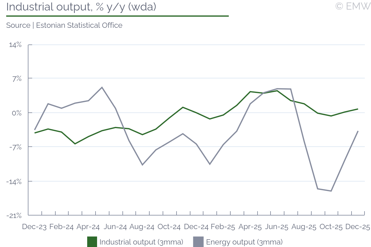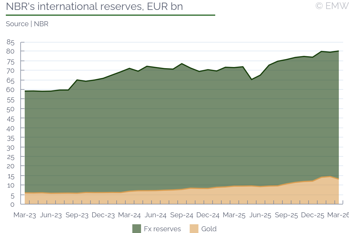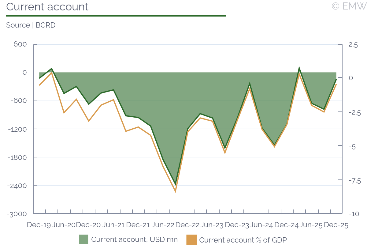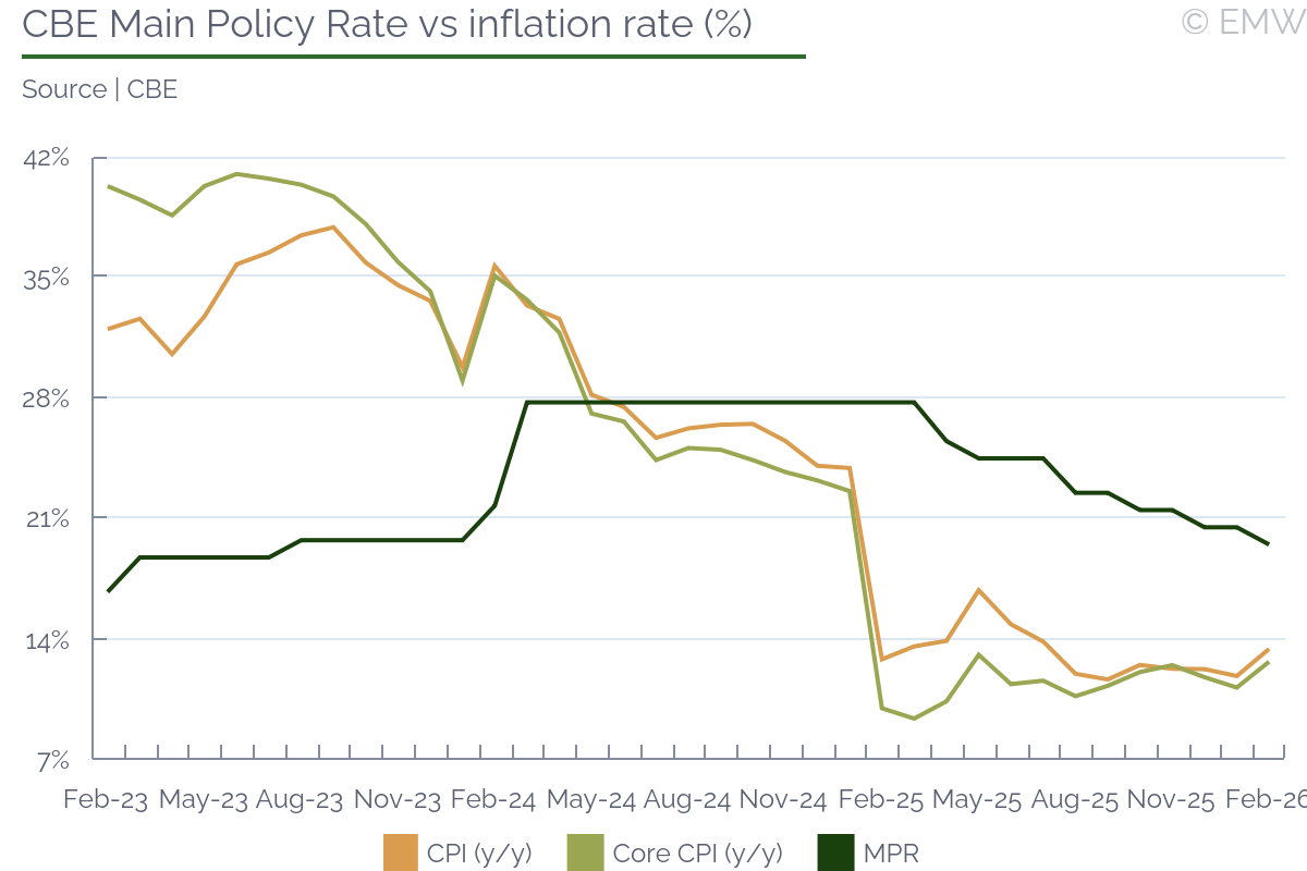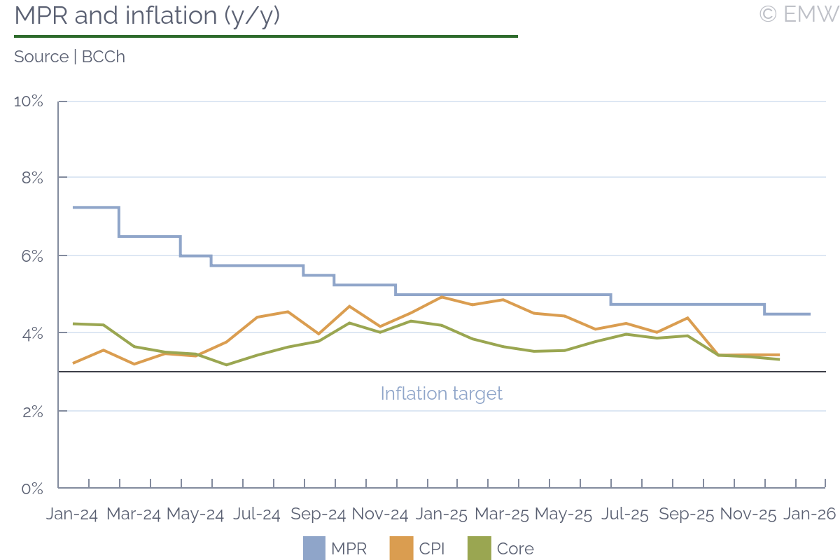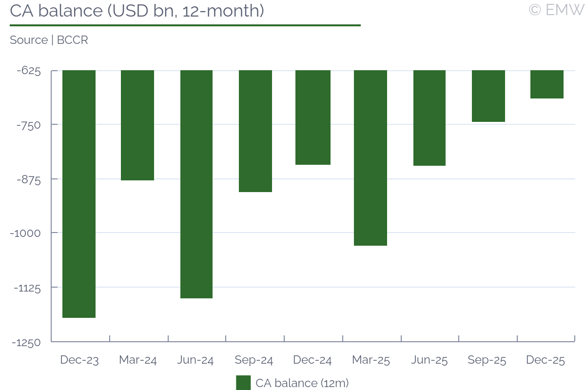 The country's CPI inflation rate slowed down further to 3.8% y/y in January from 5.4% y/y in December, hitting the lowest level since 1985. The VAT rate cut, from 21.9% to 20.0%, as of Jan 1 has had an effect on the headline print, but the biggest downward contributions came from food, clothing and footwear, housing and utilities, and alcoholic beverages and tobacco. Food inflation fell to 3.9% y/y from 4.9% y/y in December, reflecting annual drops in some vegetable, fish and egg prices. However, in m/m terms, food prices still rose by 1.1% m/m, unchanged from the preceding month. Non-food inflation fell even faster to 3.9% y/y from 5.8% y/y, which was due to monthly drop in prices of automotive and solid fuels, as well as of clothing and footwear, and alcoholic beverages and tobacco. The overall CPI rose by 0.2% m/m in January, slowing from 0.9% y/y in December, thanks to the 0.4% m/m drop in non-food prices. The drop in the inflation rate offers more scope for another rate cut by the central bank, possibly already at the next MPC meeting in March. At the meeting in January, it cut the rate by 250bps to 15.5%, after cutting it by a total of 1,000pps in 2025. The central bank said it expects inflation to stay within the medium-term target of 6-8% over the coming year, barring potential spillover from the hikes in utility prices and commodity market volatility. GDP growth is seen to remain strong this year and although this is seen to exert some demand-side pressures, the current monetary conditions are assessed as still tight relative to prevailing inflation dynamics.