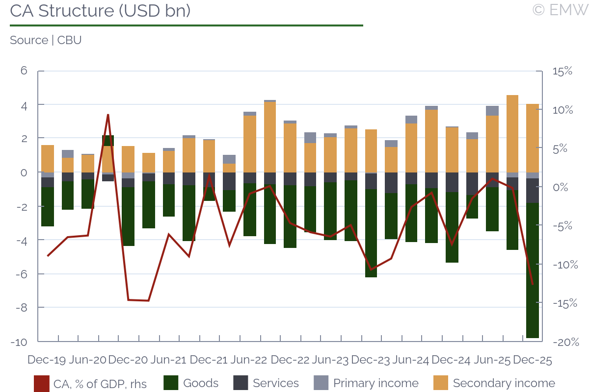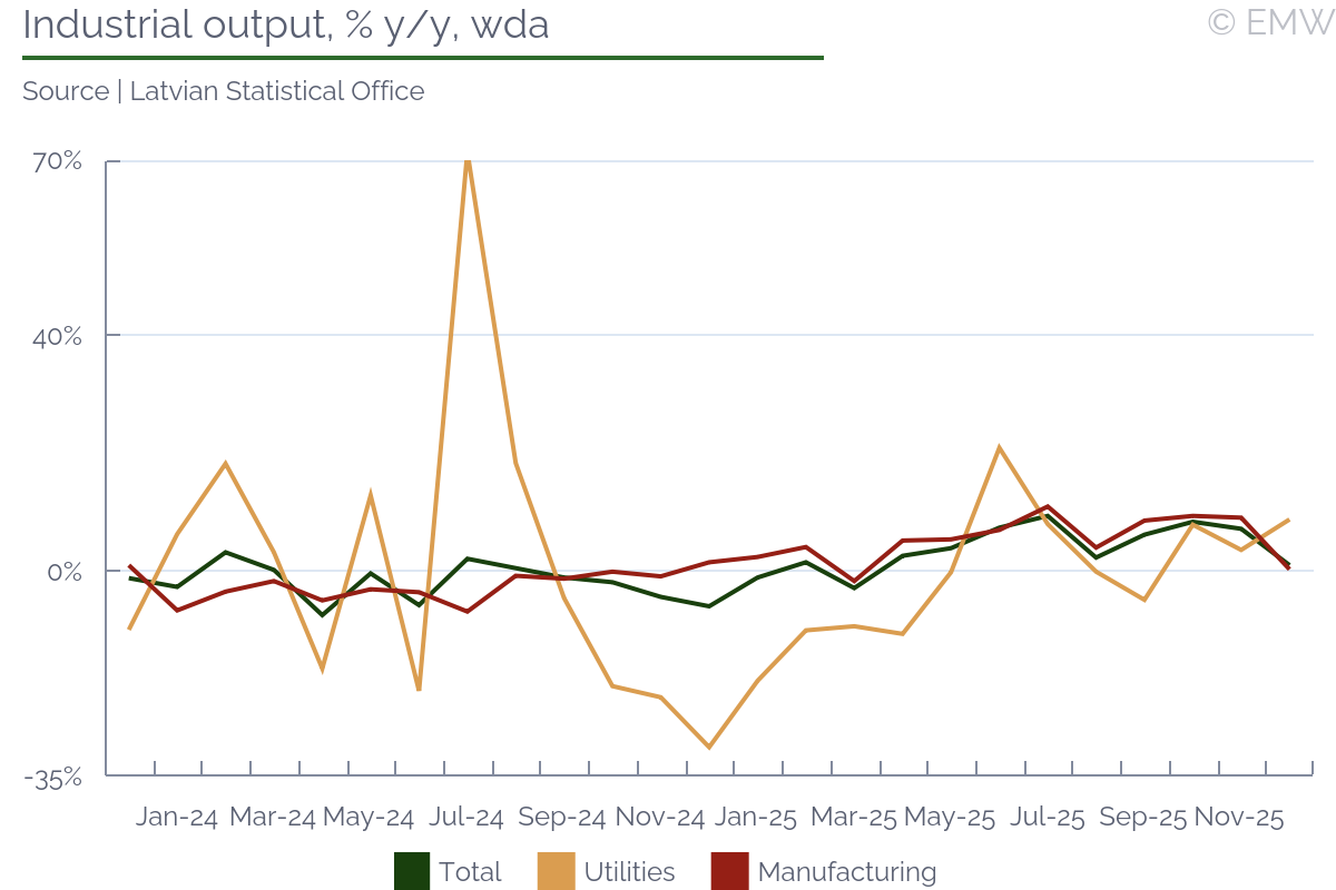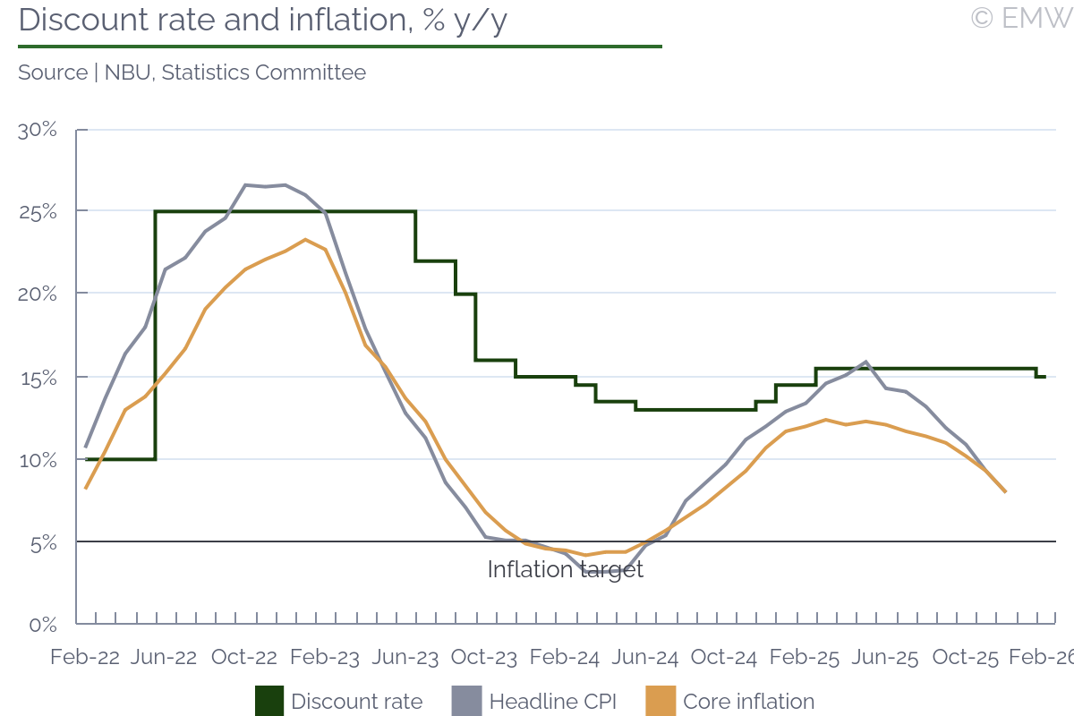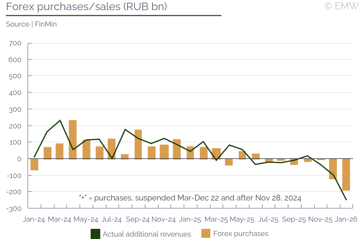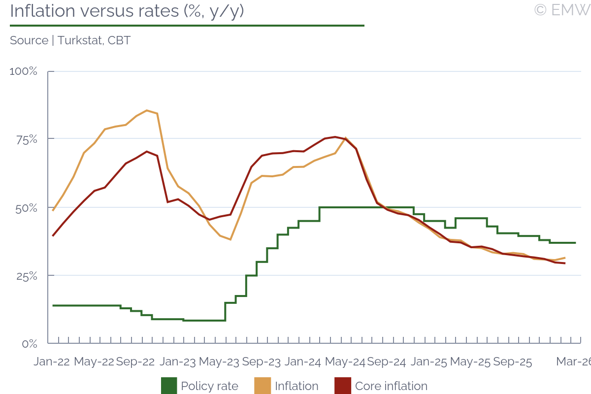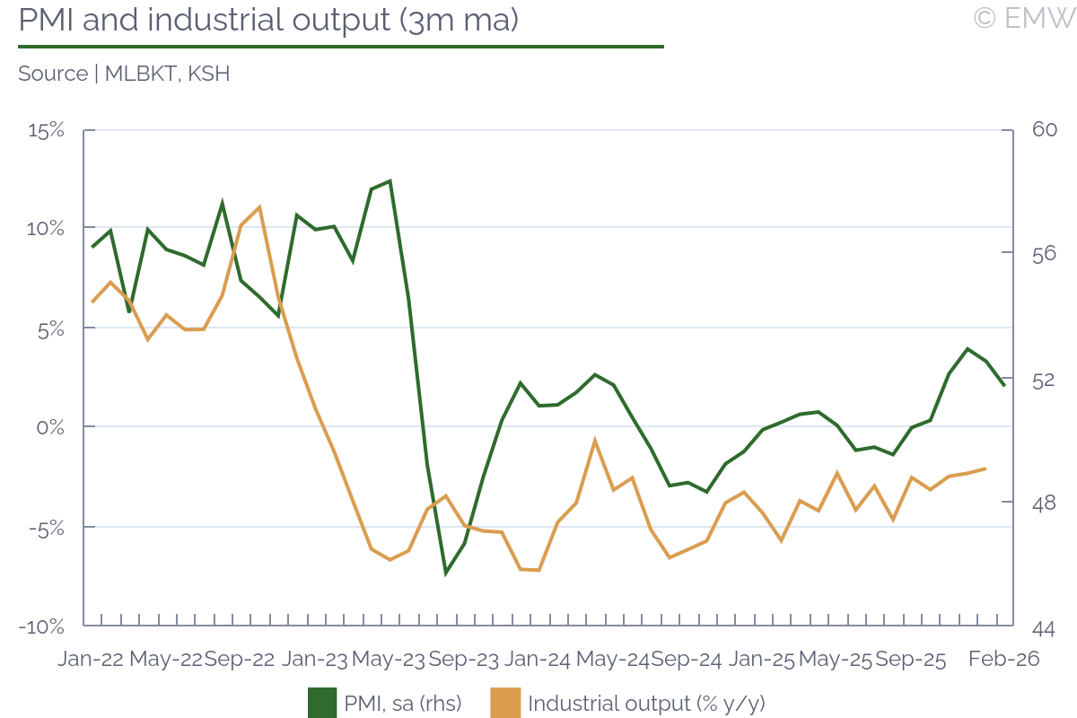 The country's CPI inflation rate slowed down further to 3.8% y/y in January from 5.4% y/y in December, hitting the lowest level since 1985. The VAT rate cut, from 21.9% to 20.0%, as of Jan 1 has had an effect on the headline print, but the biggest downward contributions came from food, clothing and footwear, housing and utilities, and alcoholic beverages and tobacco. Food inflation fell to 3.9% y/y from 4.9% y/y in December, reflecting annual drops in some vegetable, fish and egg prices. However, in m/m terms, food prices still rose by 1.1% m/m, unchanged from the preceding month. Non-food inflation fell even faster to 3.9% y/y from 5.8% y/y, which was due to monthly drop in prices of automotive and solid fuels, as well as of clothing and footwear, and alcoholic beverages and tobacco. The overall CPI rose by 0.2% m/m in January, slowing from 0.9% y/y in December, thanks to the 0.4% m/m drop in non-food prices. The drop in the inflation rate offers more scope for another rate cut by the central bank, possibly already at the next MPC meeting in March. At the meeting in January, it cut the rate by 250bps to 15.5%, after cutting it by a total of 1,000pps in 2025. The central bank said it expects inflation to stay within the medium-term target of 6-8% over the coming year, barring potential spillover from the hikes in utility prices and commodity market volatility. GDP growth is seen to remain strong this year and although this is seen to exert some demand-side pressures, the current monetary conditions are assessed as still tight relative to prevailing inflation dynamics.