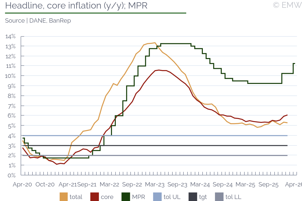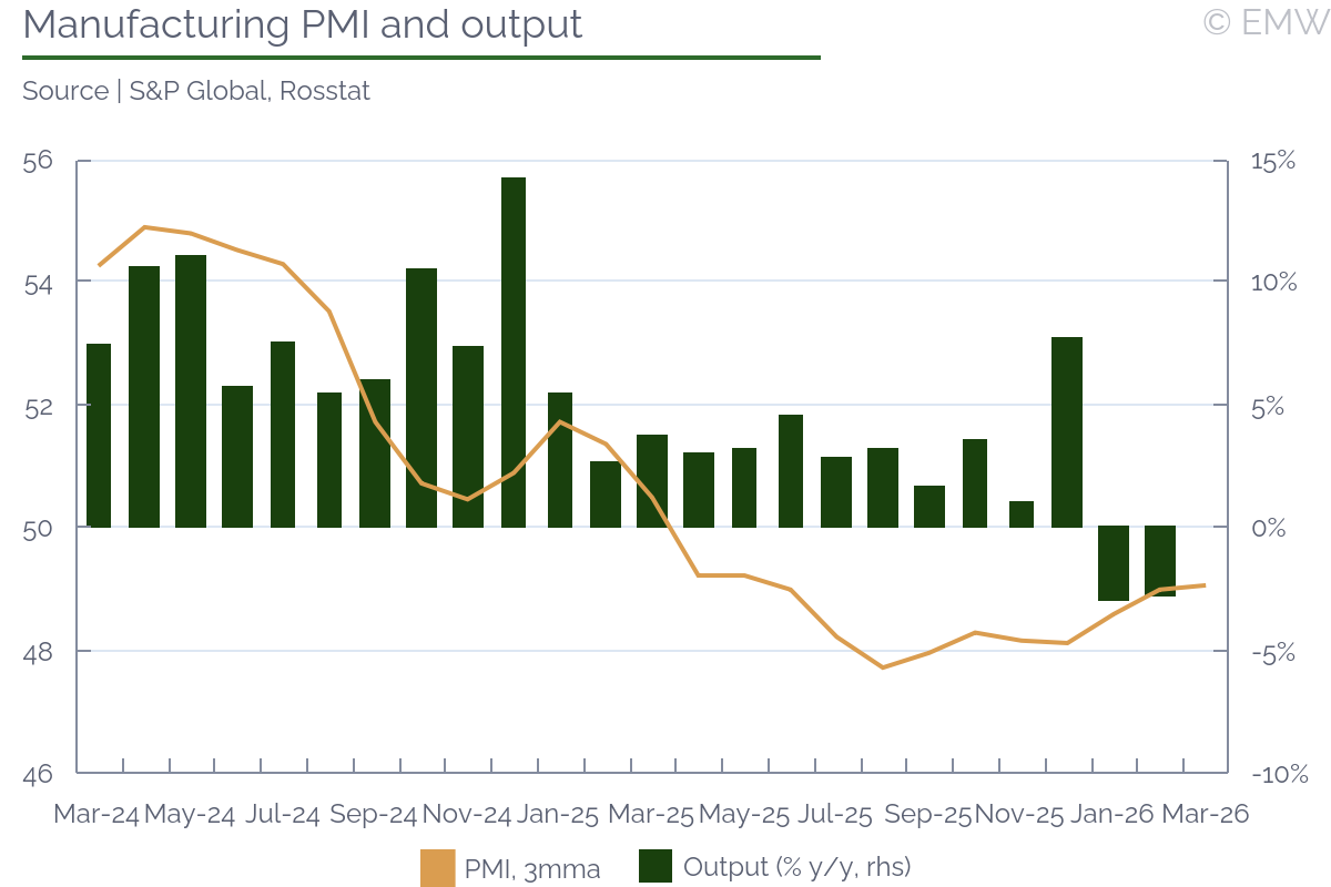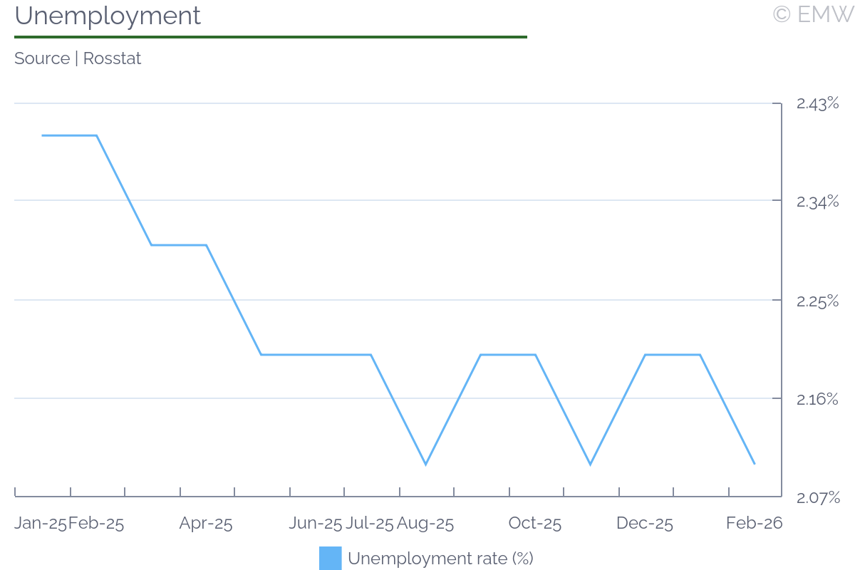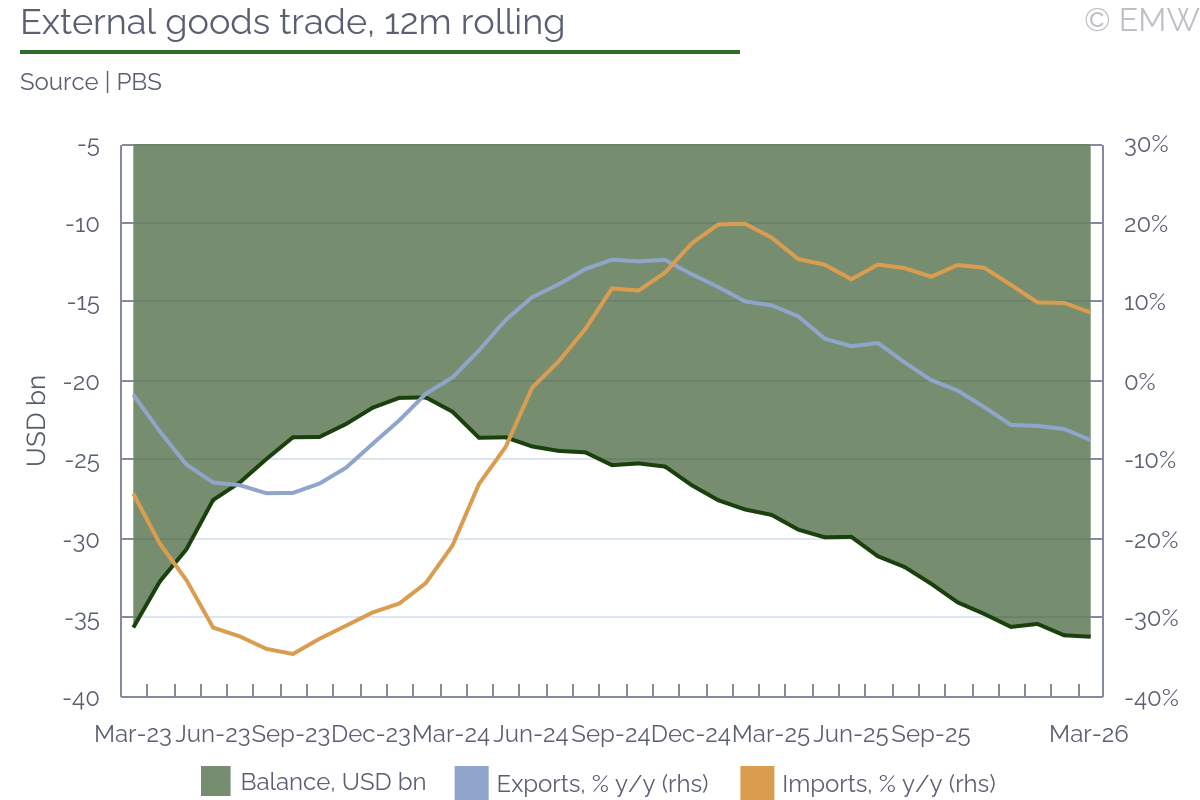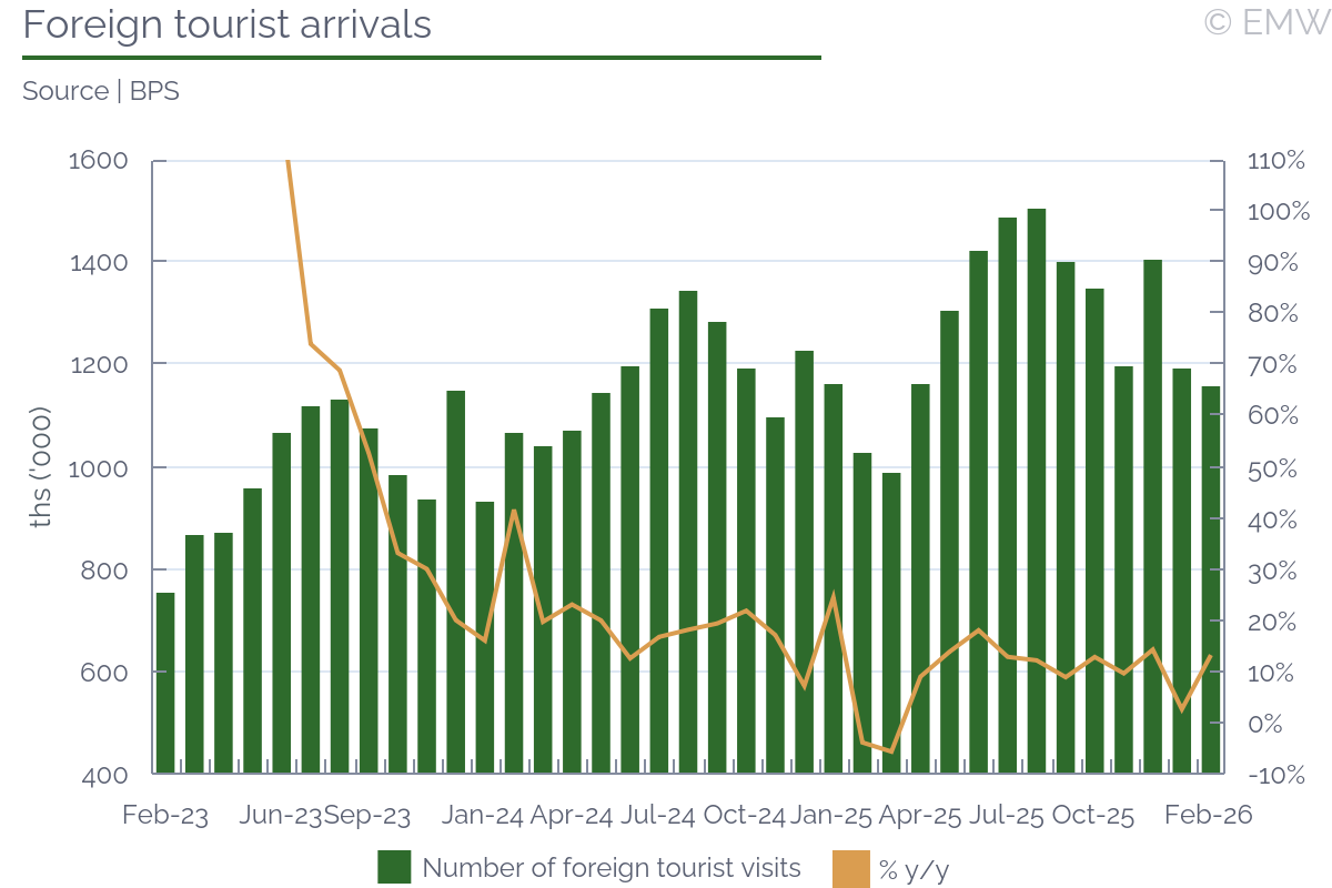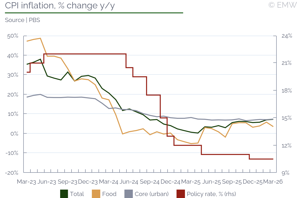 The country's CPI inflation rate slowed down further to 3.8% y/y in January from 5.4% y/y in December, hitting the lowest level since 1985. The VAT rate cut, from 21.9% to 20.0%, as of Jan 1 has had an effect on the headline print, but the biggest downward contributions came from food, clothing and footwear, housing and utilities, and alcoholic beverages and tobacco. Food inflation fell to 3.9% y/y from 4.9% y/y in December, reflecting annual drops in some vegetable, fish and egg prices. However, in m/m terms, food prices still rose by 1.1% m/m, unchanged from the preceding month. Non-food inflation fell even faster to 3.9% y/y from 5.8% y/y, which was due to monthly drop in prices of automotive and solid fuels, as well as of clothing and footwear, and alcoholic beverages and tobacco. The overall CPI rose by 0.2% m/m in January, slowing from 0.9% y/y in December, thanks to the 0.4% m/m drop in non-food prices. The drop in the inflation rate offers more scope for another rate cut by the central bank, possibly already at the next MPC meeting in March. At the meeting in January, it cut the rate by 250bps to 15.5%, after cutting it by a total of 1,000pps in 2025. The central bank said it expects inflation to stay within the medium-term target of 6-8% over the coming year, barring potential spillover from the hikes in utility prices and commodity market volatility. GDP growth is seen to remain strong this year and although this is seen to exert some demand-side pressures, the current monetary conditions are assessed as still tight relative to prevailing inflation dynamics.