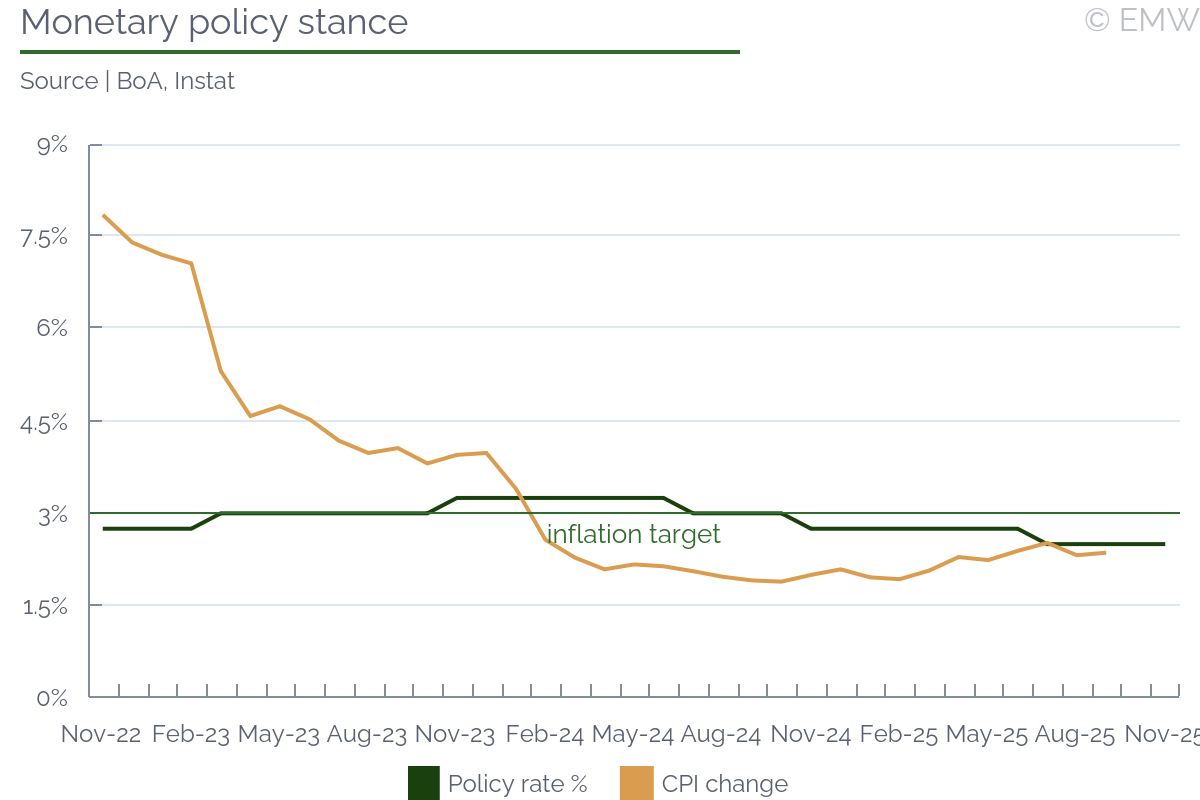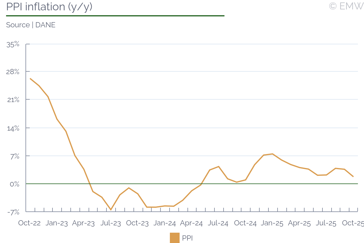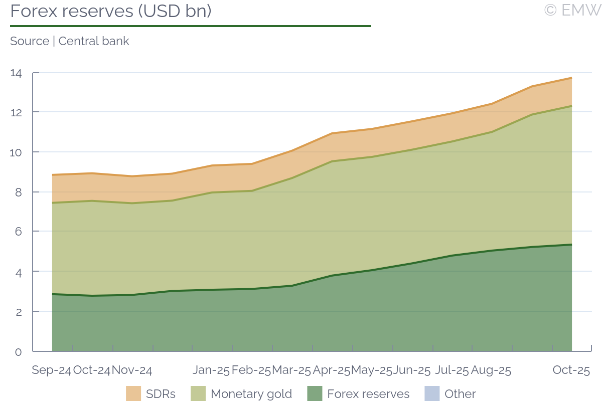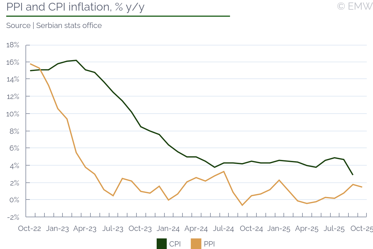 Ghana's consumer inflation eased to 8.0% y/y in October from 9.4% y/y in September, marking the tenth consecutive monthly decline and the lowest rate in more than four years, according to the latest data reported by the stats office. The print was a positive surprise to market consensus which projected a rate of 9.3% y/y. The moderation was broad-based across most divisions, with price growth slowing in both food and non-food categories. The CPI slipped by 0.4% m/m, reversing the 0.9% m/m increase recorded in September. The continued disinflation was primarily driven by easing food prices as the main harvest season improved market supplies, particularly for key staples such as plantain, yam, and vegetable oils. The Ghana Statistical Service (GSS) noted that food inflation fell to 9.5% y/y, from 11.0% y/y in September, lowering its contribution to the headline rate from 4.7pps to 4.1pps. Non-food inflation also softened, easing to 6.9% y/y from 8.2% y/y a month earlier, as housing, household equipment, and personal care categories recorded slower price growth. Services inflation declined marginally, suggesting that earlier cost pressures from utilities and education have largely dissipated. Transport inflation remained in deflationary territory at -4.0% y/y, implying relative stability in fuel and logistics costs. Still, operators in the sector continued to face elevated input costs in the past two months. The Ghana Private Road Transport Union (GPRTU) warned in mid-October that sustained increases in fuel and spare parts prices could force fare hikes if government interventions failed to stabilise pump prices. Those interventions appear to be having an effect as in the first pricing window of November, market leader Star Oil reduced petrol and diesel prices to GHS 11.97/litre and GHS 12.47/litre, respectively, representing one of the most significant cuts in months. Combined with favourable harvest conditions and contained non-food inflation, these developments strengthen the outlook for continued, though slower, disinflation into year-end, supporting the case for inflation to remain within the 6-10% target range in the near term. The Bank of Ghana made considerable progress in curbing inflation which allowed it to cut the main policy rate by 650bps since the peak at 28%. The IMF resident representative Adrian Alter urged the central bank to maintain the cautious approach and keep an eye on the real interest rate. He said policy discipline would be critical to sustain the disinflation progress and support investor confidence. In a related note, the central bank announced this week that the MPC meeting will be held in the last week of November and the rate decision will be announced on Wednesday, Nov 26.