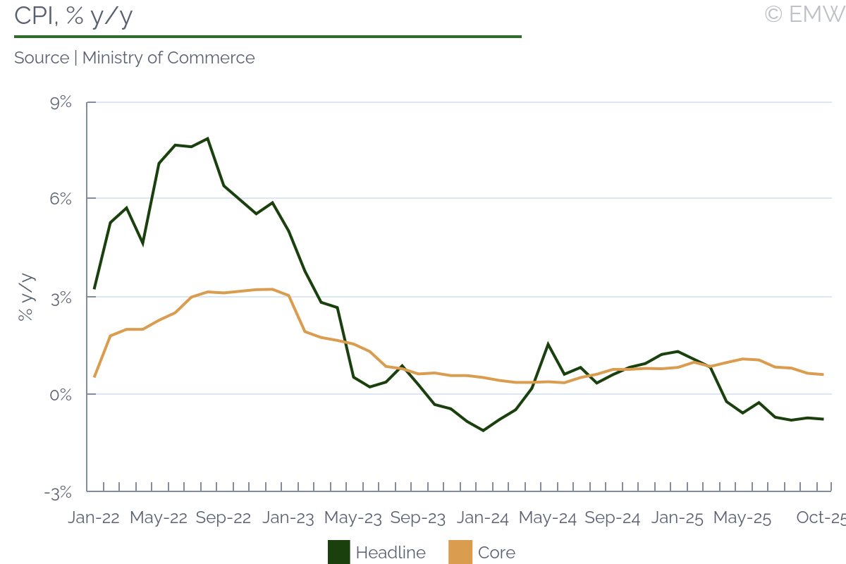 The headline CPI fell by 0.76% y/y in October, after dropping by 0.72% y/y in September, the commerce ministry said on Wednesday. The ministry noted the decreases in the prices of electricity, fuel and important food items, as well as personal care items. The y/y decrease in the CPI in October compares with a 0.70% decline projected in Reuters and Bloomberg polls. The headline inflation has been negative for seven consecutive months. The CPI growth has been below the target range of 1-3% for the eighth month in a row. Consumer prices edged down 0.11% m/m in October. The headline inflation was -0.09% y/y in Jan-Oct. The core CPI rose by 0.61% y/y in October, decelerating from 0.65% y/y in September. The core CPI increased by 0.87% y/y in Jan-Oct. Trade Policy and Strategy Office (TPSO) head Nantapong Jiralertpongs said that core inflation remained positive and added that demand was not an issue, Reuters reported. Consumption and higher inflation are helped by government measures, according to him. Prices in the non-food and beverages category fell by 1.10% y/y in October, after dropping by 0.99% y/y in September. Prices in the food and non-alcoholic beverages category declined by 0.17% y/y last month, after falling by 0.24% y/y in September. The ministry expects headline inflation to continue to decrease in November and reportedly added that there is a probability of negative inflation for the entire year. With regard to November, the ministry noted Dubai crude oil prices that are significantly lower y/y; government measures to ease the cost of living, particularly regarding the prices of diesel and electricity; prices of fresh vegetables and fresh fruits that are significantly lower y/y on the back of increased market supply and high base effects; the likely reduction in hotel room rates in line with the government's measures to stimulate domestic tourism. Factors potentially accelerating inflation include a likely increase in airfare due to the recovery in tourism, as well as the fact that the prices of some agricultural products and cooking ingredients tend to be higher y/y, like instant coconut milk, instant coffee, table salt and vegetable oil. All in all, the ministry continues to forecast headline inflation of 0.0% in 2025, according to the official press release. Last month, the BOT and the finance ministry announced their new macroeconomic projections. This year's headline inflation is forecast at 0.0% and -0.2% respectively. Both institutions predict headline inflation of 0.5% in 2026. In October, BOT's Monetary Policy Committee (MPC) voted 5 to 2 to keep the policy interest rate unchanged at 1.50%. Two MPC members favoured a 25bp cut. A hold decision and a 25bp policy rate cut both seem possible at the next MPC meeting on Dec 17, the last one for 2025, in our view. | ||||||||||||||||||||||||||||||||||||||||||||||||||||||||||||||||||||||||||||||||||||||||||||||||||||||||||||||||||||||||||||||||||||||||||