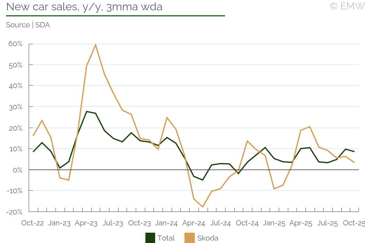 Motorway tolls will rise once more, as of the beginning of 2026, according to an announcement from the transport ministry. Tolls for regular cars will increase between 3.4% and 5.3%, except for the 1-day toll, whose price will rise by 9.5%. The increase for cars running on natural gas will be between 4.9% and 7.1%, with 1-day tolls up by 10%. Finally, plug-in hybrids should see an increase of 4.9% for annual tolls, 9.1% for 1-month tolls, while the rest (10 and 1 days) will remain without change. We estimate that the average increase will be around 4.5%, which is relatively modest. The weight of road tolls in the CPI basket is about 0.33%, which means the impact on CPI inflation will be marginal, at +0.015pps in January. This is part of regulated prices, so it will not impact core inflation. The transport ministry expects to raise an additional CZK 9bn from the new road tolls. | ||||||||||||||||||||||||||||||||||||||||||||||||||||||||||||||||||||||||||||||||||||||||||||||||||||||||||||||||||||||||||||||||||||||||||