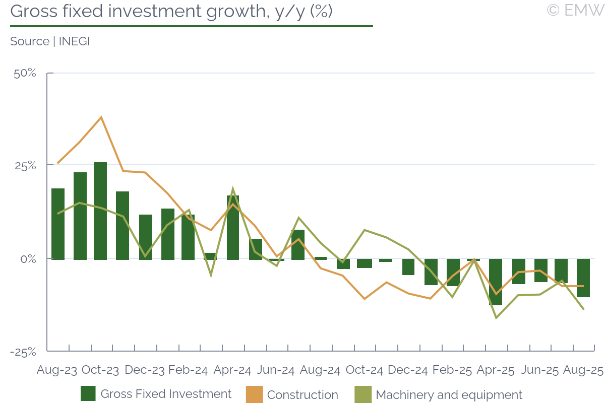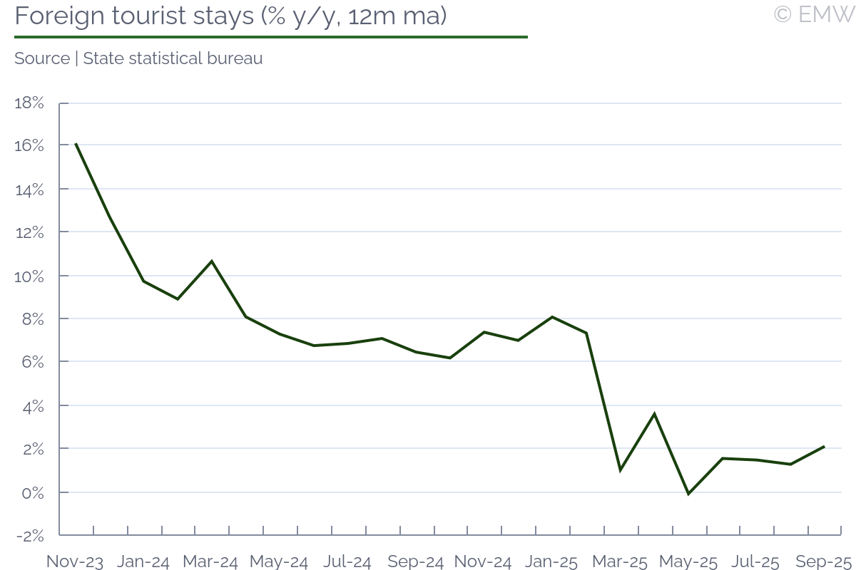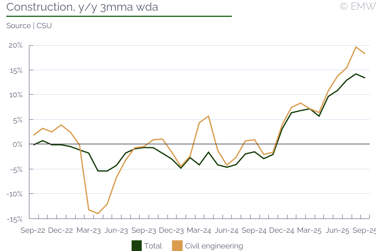 Construction activity eased its growth to 12.8% y/y (wda) in September, slowing from 17% y/y in August, according to figures from the statistical office. The slower increase was almost entirely due to civil engineering works, where activity rose by 15.9% y/y in September, slower by 11.4pps m/m. The latter comes despite a low base, and the decline was as much a 4.7% m/m (sa). This is mostly due to infrastructure projects wrapping up before the general election in October, a lot of them being aimed at motorway construction and flood repairs. On a positive note, the number of completed buildings jumped by 69.6% y/y in September, bringing the cumulative increase to 5% y/y in January-September. Completed multi-dwelling buildings were higher by 52.2% y/y in September, but their number was still lower by 10.7% y/y in January-September. The latter has been one of the main issues in the real estate market, since demand growth has not been met by a boost in supply. This goes for new projects as well, as the number of multi-dwelling buildings started fell by 37.8% y/y in September and by 16.4% y/y in January-September. Thus, while the CNB hopes that housing price growth will peak out soon, construction data suggests this might not be the case, as supply shortages are likely to persist. The number of building permits fell by 6.8% y/y in September, but it was mostly due to engineering works, where they fell by 15.4% y/y. Meanwhile, residential building permits rise by 0.7% y/y, posting a second consecutive month of growth. Still, that growth was marginal, as residential building permits were up 0.1% y/y in August. Even then, the last time residential building permits rose for more than one month in a row was in 2022, so it is an improvement, even if a negligible one. Given how the average period of construction is a couple of years, however, the odds are that we will not see a noticeable relief in the housing market before late 2026 or early 2027. Employment in construction rose by 1% y/y in September, seeing growth throughout the entire Q3. In cumulative terms, employment was still down by 0.1% y/y in January-September, but we expect the number will improve before the year is over. Nominal wages picked up growth as well, rising by 6.4% y/y in September, bringing cumulative growth to 5.8% y/y in January-September. This will be likely slower than what is seen in the service sector, but it is still robust. All in all, we expect that civil engineering works will keep easing activity, which will drag overall performance. Yet, all eyes will be on residential construction, which continues to lag. While there will be some improvement in the near future, we doubt it will be enough to meet current demand levels, which means housing price growth will ease, but not disappear.