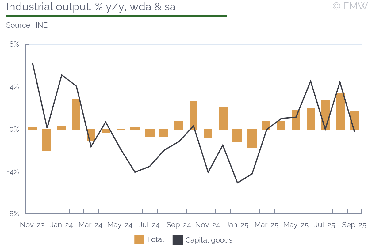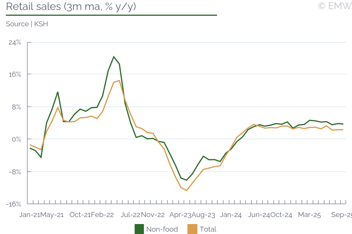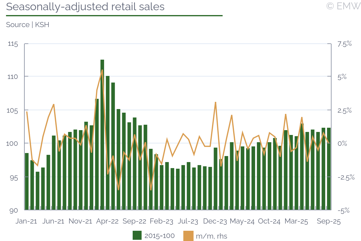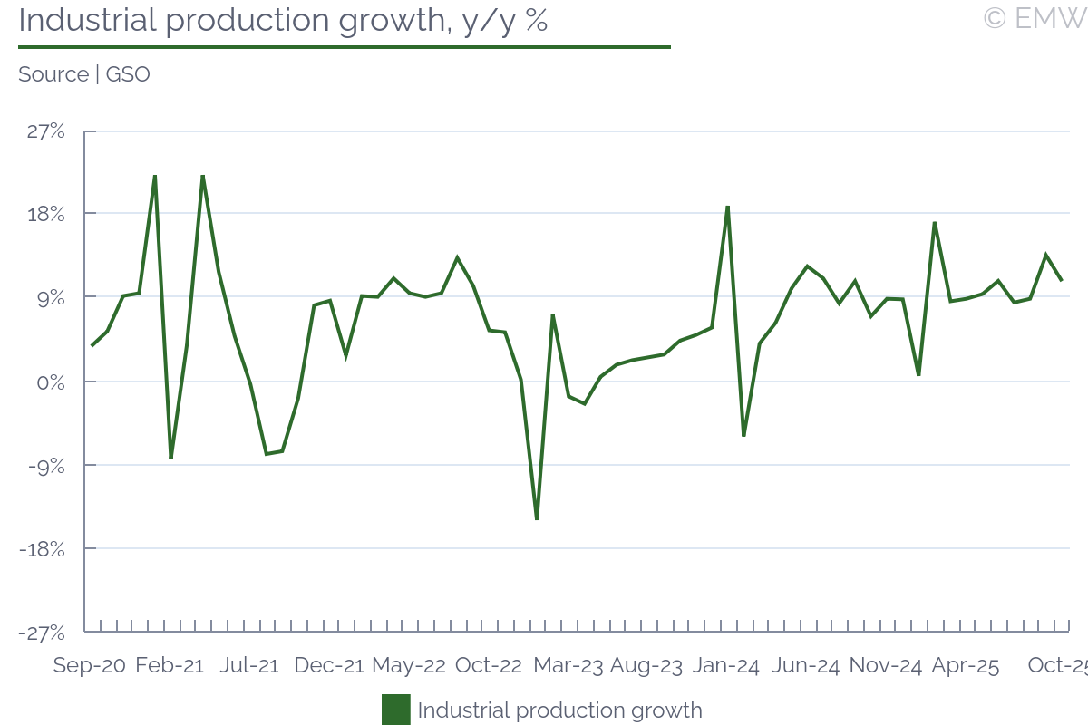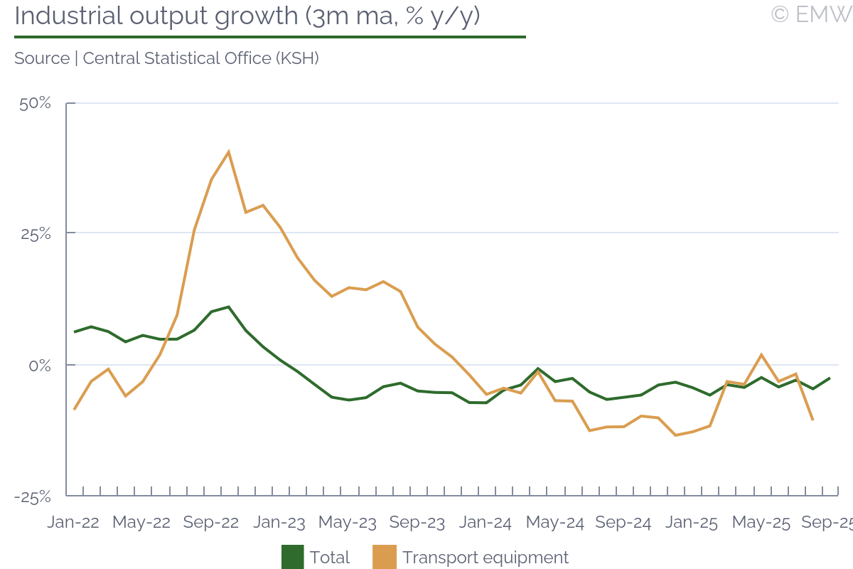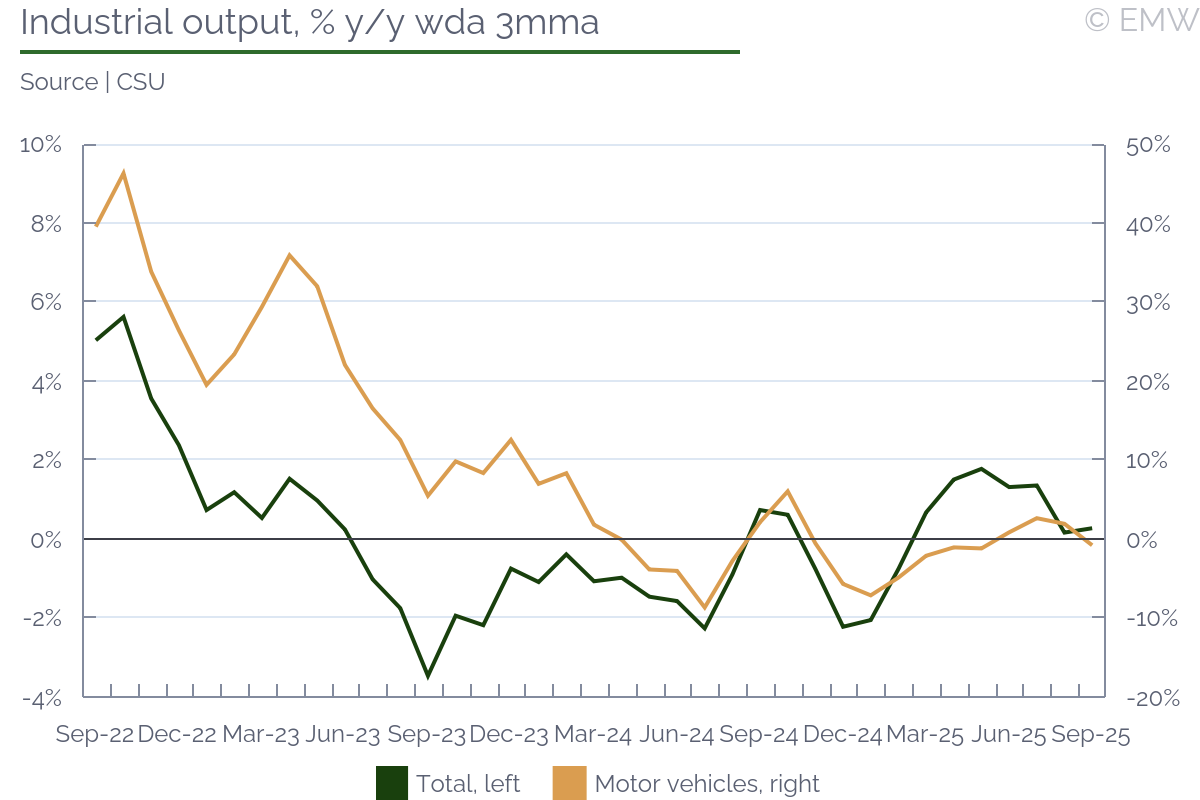 Industrial output rose by 0.4% y/y (wda) in September, swinging back from a 1.3% y/y fall in August, according to figures from the statistical office. The print was stronger than market expectations, which projected a decline of 0.3% y/y. Output also recovered in month-on-month terms, rising by 1.1% m/m (sa) in September, after a 1.1% m/m drop in August. Manufacturing was the sector to push headline production upwards, as it rose by 1.7% y/y in September, and it increased by 2.3% m/m (sa). As expected, the automotive sector worsened, and its output fell by 2.9% y/y in September, faster by 0.7pps m/m. This is largely due to production interruptions in Hyundai, the argument being weak external demand. Other sectors that did not do that well were power generation, where production fell by 9.2% y/y in September after rising by 5.8% y/y in August. Pharmaceutical production deteriorated as well, reporting a fall of 0.4% y/y in September after rising by 7.3% y/y in August. Yet, all this was made up by machinery & equipment and electrical products, as both sectors recovered from a noticeable loss in August to a decent increase in September. Computer & electronics also had an upward contribution to manufacturing growth, but it was mostly a softer decline, from 15.5% y/y in August to 4.5% y/y in September. Manufacturing of transport equipment other than motor vehicles was also on the rise, seeing a 15.3% y/y jump in September. The main issue with this is that we don't quite know how long it will last. Industrial sentiment has been on the rise, and the manufacturing PMI was at a steady level in September, until it sharply deteriorated in October. New orders improved again, rising by 4.4% y/y in September after a 5.1% y/y fall in August. Export orders had the biggest contribution, with a 5.5% y/y increase in September, after a fall of 5.8% y/y in August. By sector, the automotive industry led with new orders, followed by machinery & equipment, electrical, and parts & components. Computer & electronics also contributed, as well as basic metals. On the other end, transport equipment other than motor vehicles saw a major drop in new orders, so it appears the spike seen in September will not continue for long. Our point is that new orders have been quite volatile, and judging from the latest manufacturing PMI print, they will likely deteriorate noticeably in October. Mind that this could be sentiment-related, as the issue with China's export restrictions on rare earths may have impacted orders. Since the issue appears to have been averted, at least for a while, we may see a better performance in November and December. Yet, industrial sales remained unimpressive, falling by 0.8% y/y in September, their third consecutive decline. Given how demand remains weak, employment decline continued, and it fell by 1.6% y/y in September. While it was the softest rate of decline in the past 30 months, job shedding has been going on since mid-2022, without any interruption. Nominal wages rose by 6.7% y/y in September, and there was some upward revision to prints in July (up 6.9% y/y) and August (up 5% y/y). Unfortunately, the statistical office doesn't provide a series for this metric, so we don't know whether past wage growth was revised as well. In any case, nominal wages rose by 6.2% y/y in Q3, up from 4.8% y/y in Q2, their fastest growth in the past 4 quarters. Furthermore, wages in industry rose by 5.6% in January-October, which is likely slower than the national average, but still a sizeable growth rate. We attribute this to persisting shortages of skilled labour. Job shedding has been mostly through low-skilled positions, as well as through not filling in voluntary departures (like retirement, for example). Yet, this is so far industrial producers can afford to go, as they have no guarantee they will be able to find skilled labour if they need to scale up. Automation has been in progress, but it appears its implementation still fails to meet labour demand. All in all, industrial activity has clearly weakened, reporting a growth of only 0.3% y/y in Q3 2025, the weakest this year so far. The same goes for manufacturing output, which rose by only 0.6% y/y in Q3, easing from a 1% y/y growth in Q2. As a result, the robust economic activity seen in Q1-Q3 so far is likely still driven by a combination of household consumption and inventory accumulation. The outlook for domestic industry remains bleak, and downside risks have increased, mostly related to uncertainty around global trade.The automotive sector will likely push down output in October and November as well, though as we have seen there are other sectors that could occasionaly mitigate that impact.