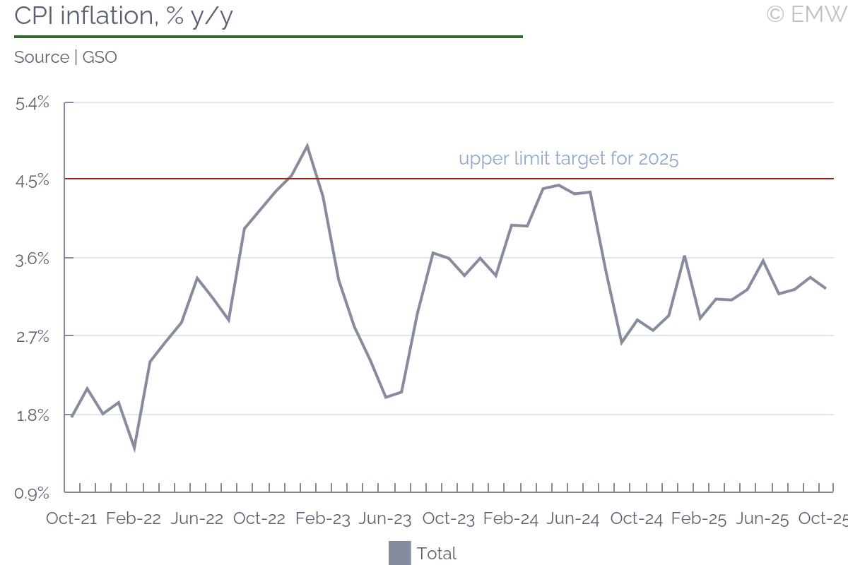 Headline consumer price index (CPI) inflation eased slightly to 3.25% y/y in October, down from 3.38% in September, according to the General Statistics Office (GSO). In contrast, core inflation-which excludes food and energy quickened modestly to 3.3% y/y. Housing and construction materials continued to be the main contributors to inflation, with prices surging 6.76% y/y in October. The increase reflected higher rental costs and persistent high prices in the property market. The housing category alone added 1.27 percentage points (pp) to overall inflation. Healthcare and medical services recorded the steepest price rise, up 12.63% y/y, contributing 0.68 pp to the headline rate. Food inflation remained contained, easing to 2.09% y/y in October. Grain prices fell 1.46%, while staple food prices rose 1.96% y/y, contributing 0.7 pp to overall inflation. Education inflation edged up slightly to 3.27% y/y from 3.24% in September, reflecting higher tuition fees for the new academic year. In contrast, transportation and postal services saw minor declines, down 0.02% and 0.54% y/y, respectively. Looking ahead, inflationary pressures are expected to pick up modestly in the final months of the year, supported by accommodative monetary conditions, a weaker VND, and seasonal demand. Nonetheless, inflation remains broadly contained and is likely to stay below the government's 4.5% target for 2025.