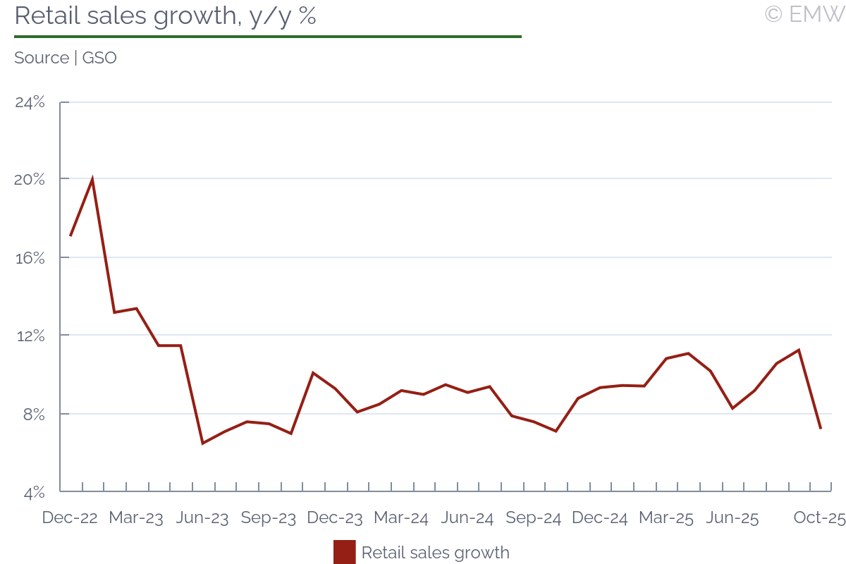 Retail sales increased 7.2% y/y in October to an estimated VND 598.4tn, according to the General Statistics Office (GSO). The deceleration reflected a moderation in goods consumption following strong growth in September, though services demand remained robust. For the first ten months of 2025, total retail sales rose 9.5% y/y, while real retail sales-adjusted for inflation-grew 7% y/y. The sustained gains underscore the government's continued efforts to boost domestic demand through stimulus programs and consumer-focused policies. By category, travel services recorded the fastest growth, surging 19.8% y/y, supported by tourism stimulus initiatives and an expanding range of travel products. Accommodation and catering services also performed strongly, rising 14.1% y/y. In contrast, goods retail posted a slower increase of 5.7% y/y, reflecting softer demand for household and consumer products. Looking ahead, retail activity is expected to regain momentum in the final months of the year, underpinned by accommodative fiscal and monetary conditions, improved labor market sentiment, and resilient domestic consumption.