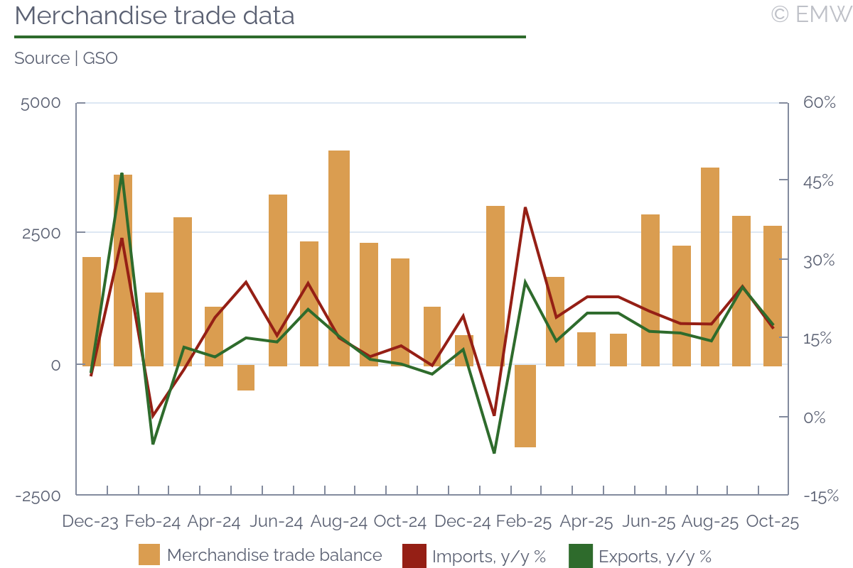Trade balance recorded a surplus of USD 2.6bn in October, up 31.3% from a year earlier, according to data from the General Statistics Office (GSO). Over the January-October period, the cumulative trade surplus stood at USD 19.56bn, marking a 12.2% decline from the same period in 2024 amid persistent external headwinds. Exports rose 17.5% y/y in October to USD 42.05bn, supported by robust performance in the FDI sector, while domestic exports fell 17.4% y/y. Electronics led the export growth, soaring 65.6% y/y, followed by mobile phones (+10.9%) and automobiles (+15%). Machinery exports increased modestly by 2.7%, while textiles and garments edged down 0.5% and 1.5%, respectively. On the import side, imports rose 16.8% y/y to USD 39.4bn, reflecting broad-based increases. Electronics imports surged 39.2% y/y to USD 13.1bn, and machinery imports climbed 22.8% y/y to USD 5.3bn. In contrast, petroleum product imports plunged 27.1% y/y, and fabric imports slipped 2.7% y/y. Looking ahead, export momentum is expected to gradually recover as the impact of tariff-related uncertainty eases. However, the pace of recovery may remain moderate, constrained by weak global demand and lingering trade policy risks.
