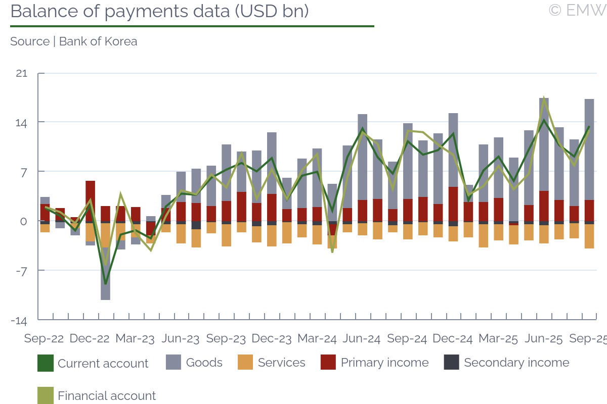 The current account surplus rose by 19.3% y/y to USD 12.9bn in September, data from the central bank BOK showed. At the same time, the seasonally-adjusted current account surplus fell by 13.7% m/m to USD 7.6bn, posting a second consecutive double-digit decline and reaching the lowest level in 13 months. The main driver of y/y growth in the current account were goods exports which rose by 9.6% y/y to USD 67.3bn, exceeding growth in imports which stood at 4.5% y/y. As a result, the goods balance expanded by 33.5% y/y to USD 14.2bn. Export growth was underpinned by both calendar effects due to the Chuseok holiday in Sep 2024 and the robust demand for semiconductors. Meanwhile, the services deficit expanded by 57.8% y/y to USD 3.3bn on the back of the recovery in domestic demand observed in late Q3. In particular, transport services posted a deficit of USD 121mn compared to a surplus of USD 737mn a year ago. The primary income surplus, meanwhile, slightly contracted by 4.6% y/y to USD 3.0bn. The financial account posted net outflows worth USD 12.9bn in Sep 2025 on the back of gains in net financial assets in both direct investment, portfolio investment, other investment and reserve assets. Net FDI outflows in particular grew by four-fold y/y to USD 3.86bn. Portfolio investment net outflows posted USD 2.1bn net outflows amid a very strong USD 11.1bn increase in assets compared to USD 9.1bn increase in liabilities. In particular, the portfolio inflows in South Korea reached the highest level since May 2025 due to the strong performance of the country's stock market. Finally, reserve assets increased by USD 3.98bn which was the strongest gain since Jan 2023.