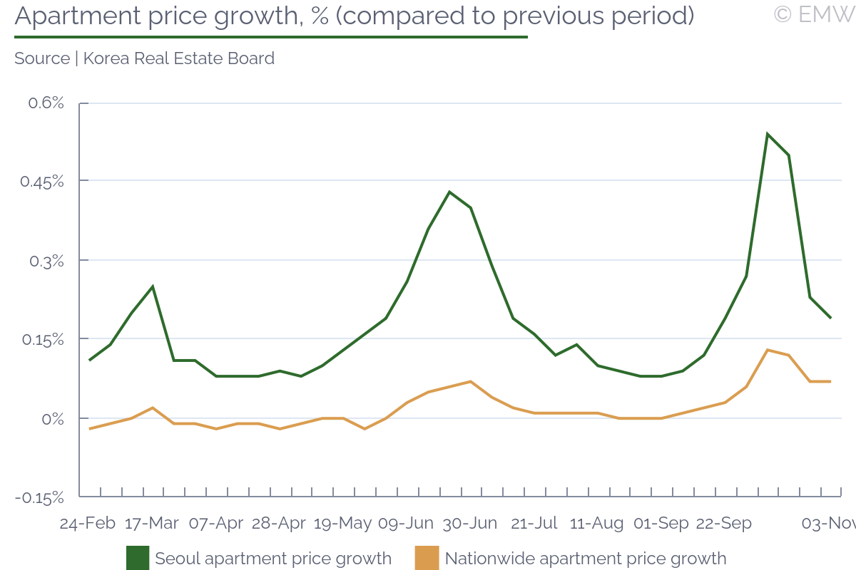 Seoul apartment price growth moderated to 0.19% w/w as of Nov 3 from 0.23% w/w in the week before that, according to data from the Korea Real Estate Board (REB). Nationwide apartment prices continued to increase by 0.07% w/w as in the previous week. Seoul apartment prices moderated for a second week in a row after the introduction of real estate stabilization measures on Oct 15, among which was the designation of the entire Seoul area as special overheating zone. However, the pace of the price deceleration slowed down markedly from last week. REB commented that both purchases and inquiries have decreased over the past week as participates remain in a wait-and-see mode. At the same time, rental prices in Seoul rose by 0.15% w/w compared to 0.14% w/w in the previous week due to shortage of properties in preferred complexes. Despite the easing of prices observed this week, it is unlikely that it will be enough for the central bank to resume rate cutting later this month. We remind that the BOK stayed in hold in its previous 3 meetings when apartment prices rose at even slower pace than the current rate. For the BOK to consider the Oct 15 measures to be a success, apartment price growth needs to fall well below the 0.10% w/w level, in our view. | ||||||||||||||||||||||||||||||||||||||||||||||||||||||||||||||||||||||||||||||||||||||||||||||||||||||||||||||||||||||||||||||||||||||||||