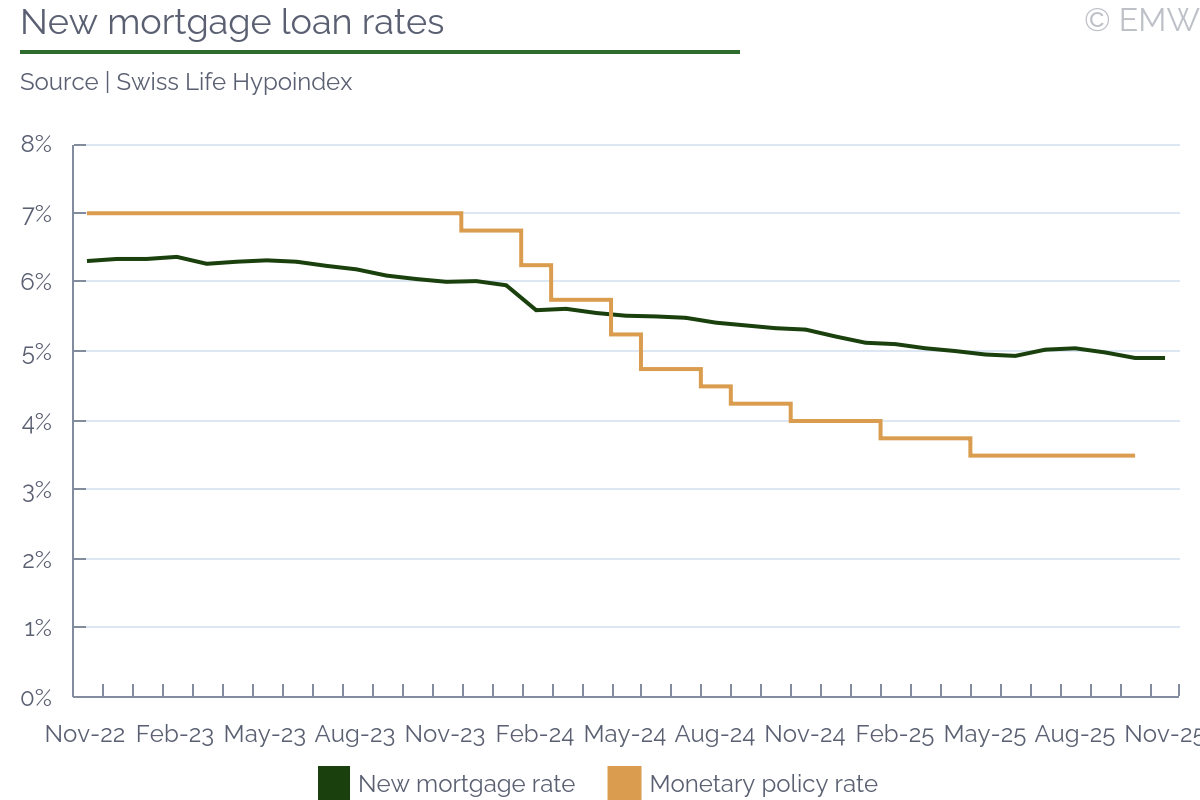 New mortgage offer rates remained stable in November, according to the latest SwissLife Hypoindex survey. Rates on mortgages with 3-year and 5-year fixation periods fell by 1bp m/m, while rates on 1-year and 10-year fixation remained unchanged. There is still a noticeable decline in year-on-year terms, but it is mostly due to a high base. Thus, rates on fixation periods between 1 and 5 years fell between 44bps and 48bps. CNB data shows that the most preferred fixation period is currently 3 years, and this is where offer rates match the CNB's numbers. To illustrate, the loan rate on pure new mortgages, as reported by the CNB, was 4.59% in September, while the rate on mortgages with a 3-year fixation period was 4.57%. CNB data also confirm that new mortgage rates have stabilised, as the rate remained flat in Q3 2025. Monthly mortgage payments continued to fall in year-on-year terms, between 4.3% and 4.7% for fixation periods between 1 and 5 years. The only exception is mortgages with a 10-year fixation period, where monthly payments fell by 2.6% y/y. We should reiterate that the survey uses an outdated proxy for a standard mortgage, namely a value of CZK 3.5mn and a repayment period of 25 years. We don't have an issue with the repayment period, as the average is slightly above 26 years currently, according to more precise surveys. However, the average mortgage value is much higher in reality, currently being around CZK 4.3mn. Thus, the calculations for mortgage affordability based on the Hypoindex survey are misleading. The data suggests that monthly mortgage payments were 38-41% of the gross average, and 44-48% of the median wage, depending on fixation period. However, if we use a more updated value for a standard mortgage, then payments become 46-50% of the gross average wage, and 55-59% of the median one, which is far more realistic. At this point, it is becoming evident that the mortgage market will not reach its levels from 2020-2021, in terms of borrowing costs. Thus, mortgage rates are likely to remain higher than 5 years ago, by about 200-250bps. This should ease housing lending growth a bit, though data indicates that borrowing costs are not currently the main factor. Instead, stagnant housing supply appears to play a much stronger role, with demand showing no signs of easing. The CNB has an excellent analysis of the local real estate market, published in its Monetary Policy Report in August.