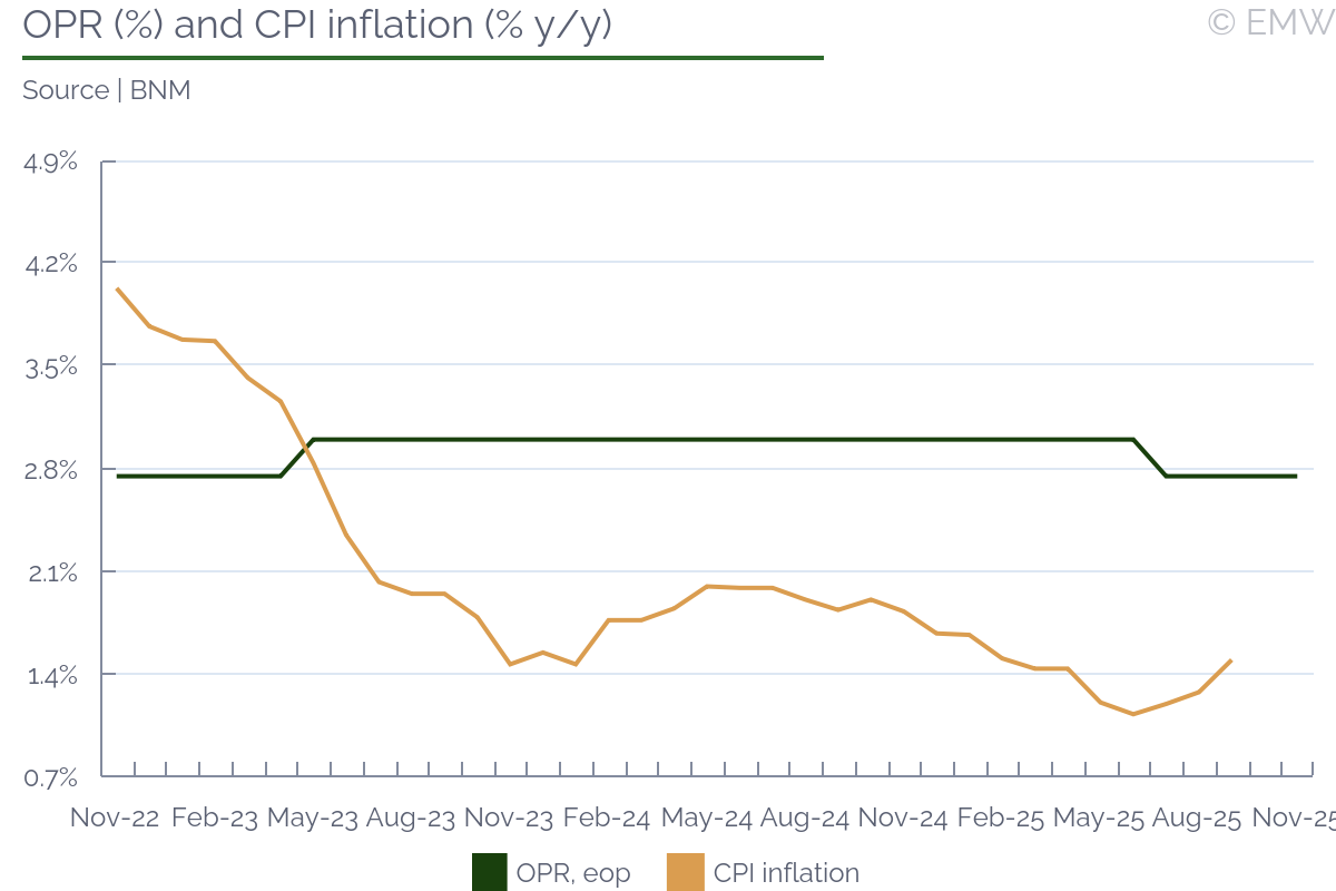 Bank Negara Malaysia's monetary policy committee on Thursday kept its overnight policy rate unchanged at 2.75% in its final meeting of this year, the central bank said in a statement. The decision was widely expected, with all 22 economists surveyed by Bloomberg and all 27 analysts polled by Reuters forecasting a rate hold amid stable economic growth, moderate inflation and a stronger ringgit. This marks the second straight meeting where the key rate has been maintained, following a 25bps cut in July. BNM projected better-than-expected GDP growth for the third quarter of 2025, supported by firm domestic demand, resilient electrical and electronics exports, strong tourist spending and improved commodity production. Recent data from the Department of Statistics Malaysia (DOSM) indicated the economy likely expanded by 5.2% y/y in Q3 - the fastest pace in a year and well above consensus estimates. For 2026, the central bank expected domestic demand to remain a key growth driver, underpinned by steady household spending and robust investment activity. Continued global demand for technology products and higher tourism receipts were also expected to support exports. However, BNM cautioned that slower global trade, weaker sentiment and lower commodity output could pose downside risks to the outlook. Last month, the government said it expects the economy to grow between 4% and 4.5% in 2026, compared with an estimated 4.0%-4.8% expansion this year. Meanwhile, BNM maintained its favourable inflation forecast for 2026, expecting both CPI and core inflation to remain moderate. It noted that subdued global commodity prices are likely to keep domestic cost pressures contained. Core inflation was seen remaining close to its long-term average, reflecting continued expansion in economic activity and the absence of excessive demand pressures. The central bank reiterated that domestic policy reforms - including subsidy rationalization and sales and services tax expansion - are expected to have limited impact on inflation. Apparently, BNM kept its 2025 inflation forecast at between 1.5% and 2.3%, which is higher than the Finance Ministry's projection of 1.0%-2.0%. CPI and core inflation averaged 1.4% and 1.9% during Jan-Sep, respectively. Overall, BNM considered its current monetary policy stance appropriate and supportive of the economy amid price stability. We expect the OPR to remain unchanged in the near-term, supported by contained inflationary pressures and improved growth prospects following a trade deal with the US and easing tensions between US and China. A stronger ringgit - which has gained more than 6% against the US dollar year-to-date - is also expected to give the central bank room to maintain its key rate. | ||||||||||||||||||||||||||||||||||||||||||||||||||||||||||||||||||||||||||||||||||||||||||||||||||||||||||||||||||||||||||||||||||||||||||