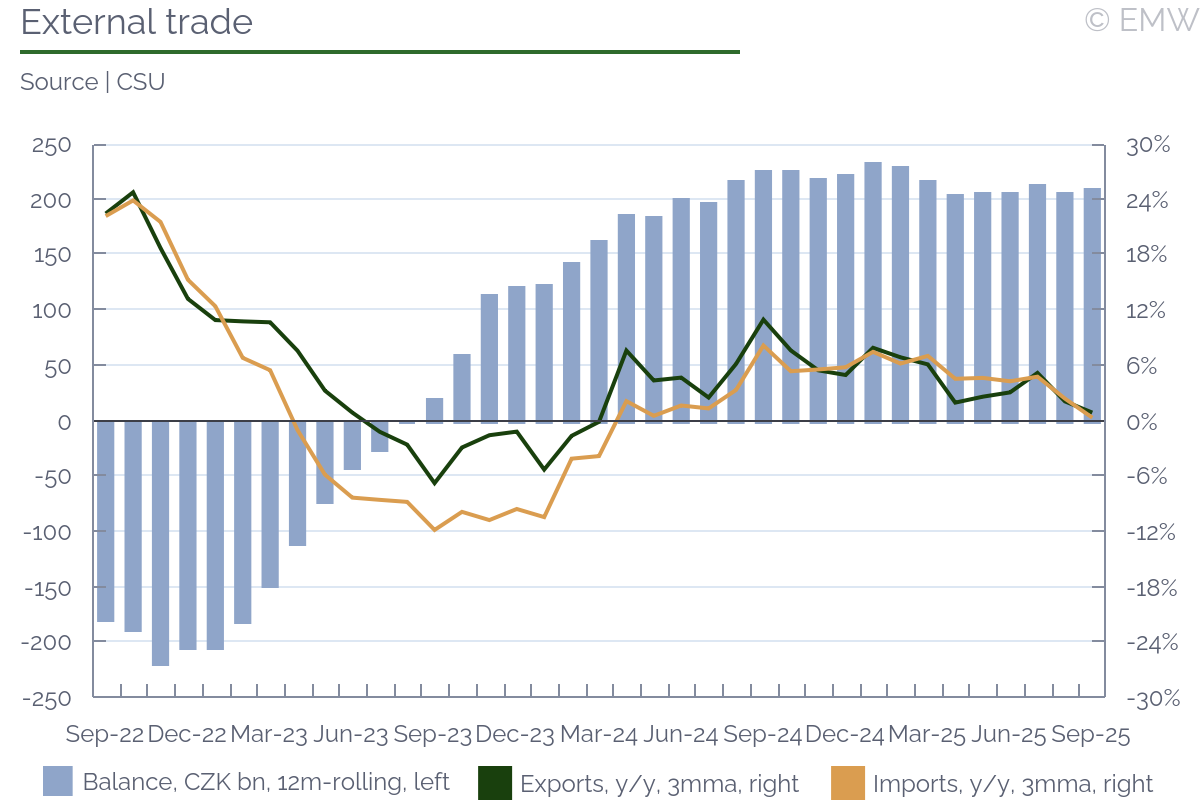 The external trade surplus reached CZK 29.7bn in September, up 27.7% y/y, according to figures from the statistical office. The print was slightly stronger than anticipated, as markets anticipated a surplus of CZK 23.5bn. In cumulative terms, the trade surplus reached CZK 170.8bn, lower by 5.4% y/y. Meanwhile, the 12m-rolling trade surplus added up to CZK 210.7bn, the second-strongest in the past 6 months. In seasonally adjusted terms, the trade surplus reached CZK 25.3bn in September, the strongest in the past 13 months. The improvement in the trade balance in September was due primarily to motor vehicle exports, which rose by 6.2% y/y, as well as various manufactured goods, up 3.3% y/y. On the other end, there was a deterioration in energy trade, which reflects somewhat higher oil prices, as well as trade with manufactured articles, which is mostly due to stronger Chinese imports. Other than that, there wasn't much of a variation. The situation was similar in cumulative terms, as motor vehicle trade was the main upward push. However, as Chinese exports were redirected from the US to Europe, this almost completely negated the gain from automotive exports. Apart from that, there was a more noticeable deterioration in food trade, as well as crude materials, whose prices have been rising due to higher transportation expenses. Trade with parts and components improved, but it was held back by chemicals and non-classified commodities. By region, trade consistently improved with the EU, most of all Germany. Meanwhile, trade with China showed stronger deficits because of the reasons listed above, even though the impact has softened recently. There was also a noticeable improvement in the trade balance with Russia, which still shows a deficit, but a surplus was reported in September, for the first time since 2020. This one is here to stay, as the main reason is the end of oil imports from Russia in April. As a reminder, the Czech government a financed an extension of the TAL oil pipeline that goes through Italy, and it has an alternative source of pipeline oil now. It couldn't have come at a better time, either, after the US imposed sanctions on Russian oil companies. Thus, unlikely Slovakia and Hungary, the Czech Republic faces zero political risk. On the downside, the Soviet-era Druzhba pipeline flows in only one direction, which means the Czech Republic cannot export oil to Slovakia and Hungary, unless the pipeline is completely reworked, which will take plenty of time and money. Exports recovered, as they rose by 3.7% y/y in September after falling by 6.4% y/y in August. The main reason was machinery & transport equipment, where exports rose by 3.6% y/y in September after falling by 7.6% y/y in August. The automotive sector had a decent contribution, with its exports rising by 6.2% y/y in September, recovering from a 3.1% y/y fall in August. There was also some improvement in exports of parts & components, as well as various manufactured articles, but it was much smaller than that of machinery & motor vehicles. Meanwhile, imports rose by 2.3% y/y in September after falling by 4.6% y/y in August. The main reason was stronger imports of machinery & equipment, followed by a stronger value of oil & gas imports. The latter reflects some base effect, as prices were much lower a year ago, and they spiked because of recent geopolitical tension. All in all, we are seeing some recovery, though it remains unclear how long it will last. While we are seeing some positive news from the manufacturing sector, volatility is still high. On the positive side, it appears that the exchange rate has started to stabilise, so we will no longer see a deterioration through a stronger REER. On the other hand, external demand remains weak, and this will inevitably reflect on export growth. Thus, the odds are that trade surpluses will continue to narrow, but possibly at a softer pace. China remains a wild card, though it might be willing to tighten its exports to the EU, which may provide a relief. The downside is that this will be through raw materials and components that the EU needs, which may hit the Czech manufacturing sector, itself heavily export-oriented. Thus, risks remain on the downside, though we don't expect a sharp fall in trade surpluses for now.