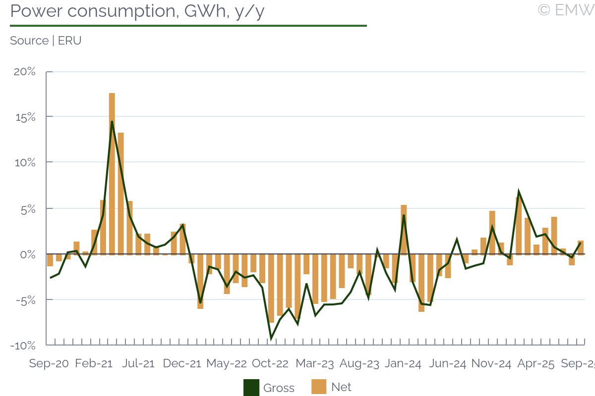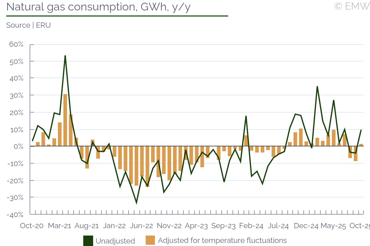 Energy consumption reported a modest increase in October, according to figures from the energy regulator (ERU) on power and natural gas consumption. Net power consumption, i.e. excluding transmission losses and energy used for other generation, rose by 5.7% y/y in October, its strongest monthly increase since February. It doesn't necessarily imply a stronger business activity, however, as October was colder than usual, and part of this could have been used for heating. As electricity-related technologies have become cheaper, there has been a shift towards using electricity rather than natural gas for heating, especially in smaller inhabited areas. Unfortunately, breakdown by consumer type is available only quarterly, so it will be some time before we can confirm our suspicion. Meanwhile, natural gas consumption adjusted for temperature changes was up 1% y/y in October, ending two months of decline. It goes in line with our speculation about more energy used for heating, as unadjusted natural gas consumption rose by 9.8% y/y. Here, we believe that the bigger part of the increase was due to households rather than business. In cumulative terms, net electricity consumption rose by 2.3% y/y in January-October, which was modest, but still better than a year ago, when consumption fell by 1.3% y/y. Thus, there is certainly some economic recovery, though not as extensive as many hoped for. The same goes for temperature-adjusted energy consumption, which rose by 2.7% y/y in January-October. As with electricity, it was decent, but not great.