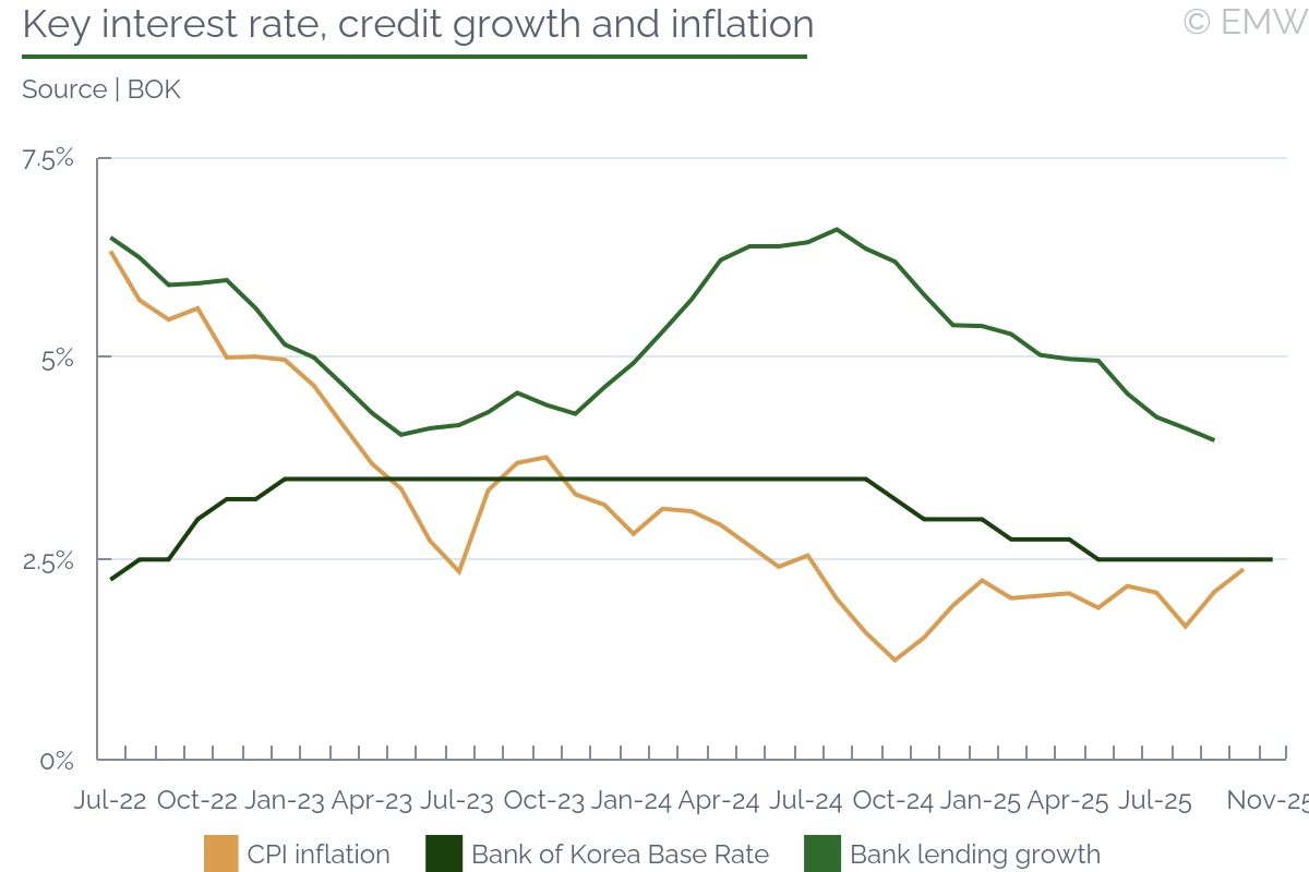 The Bank of Korea will likely stay on hold in its upcoming meeting on Jan 15 as housing prices remain hot and the recent weakening of the Korean won has pushed CPI inflation higher to 2.4% y/y in 2.4% y/y in October and November. The BOK has stayed on hold for 4 consecutive meetings since July as it saw little room to cut rates amid the surge of housing prices in the second part of 2025. The BOK maintained an easing stance in its last meeting on Nov 27, but it changed its tone somewhat and said that both rate holds and rate cuts are possible going forward. BOK's board was divided in the meeting on Nov 27, with 3 out of 6 members seeing a possibility for a rate cut in the next 3 months. However, the number of members predicting a rate cut fell from to 3 from 4 in the previous October meeting. The more hawkish tone can be explained by the fact that BOK upgraded its growth forecast to 1.8% in 2026 and saw diminishing downside risks to growth due to the US trade deal. BOK's governor Rhee Chang-yong said that despite the short period of time "multifaceted changes in economic conditions" have happened over the past month such as: (1) conclusion of US-Korea trade talks and easing of US-China trade tensions; (2) growth in exports and facility investment that exceeded expectations led by the semiconductor sector; (3) heightened increase of the exchange rate; (4) continued increase in housing prices. The economy is expected to grow by 1.8%, close to the potential growth rate of 2%, but both downside and upside risks to growth remain. Housing prices, mortgage loan growth remain key factors to watchDespite its continuing easing stance, the BOK is unlikely to cut rates while apartment price growth remains elevated. The central bank has highlighted multiple times in the past that it is unwilling to cut rates if this will fuel speculation about rising real estate prices. The latest data from the week ending Nov 24 showed a 0.18% w/w increase in apartment prices in Seoul which translates to around 10% annualized increase of prices. In our view, the current rate of housing price inflation remains too high and the BOK will be forced to stay on hold until the weekly inflation moderates further. On the positive side, mortgage loan growth has moderated considerably in recent months and stood at just KRW 2.1tn in October. Furthermore, there are indications that local banks have tightened their lending standards further or have even cancelled mortgage loan applications altogether in the last 2 months of the year. Thus, the moderating mortgage loan growth remains conducive towards rate cuts on its own, but the current housing price inflation remains too high. USD/KRW exchange rate to be closely monitored by BOKThe recent weakening of the BOK/KRW exchange rate is also likely to put brakes on BOK's easing plans. The BOK is likely to become very sensitive to the exchange rate going forward due to South Korea's pledge to invest USD 350bn over a period of at least 10 years into the US as part of the US-Korea trade deal. The annual investments into the US are likely to put additional pressure on the Korean won as the government will need to raise them from capital markets. Recently, authorities have put extra attention to the situation in the FX market where foreign investment outflows of Korean residents, including the National Pension Service, have been blamed for the weakening won. The government is currently mulling over a new framework for NPS's hedging strategy that will help to stabilize the FX market. Considering the close coordination between financial authorities, the government and the BOK, we think that the BOK is unlikely to embark on rate cuts while authorities are actively mulling over FX market stabilization measures. Growth surprised on the upside in Q3, but momentum seems to be easing in Q4The growth situation has surprised on the upside in Q3 as GDP expanded by 1.3% q/q in Q3 at the fastest pace in 15 quarters thanks to a much-needed recovery of domestic demand. However, growth momentum seems to be softening in Q4, partially on the back of base effects, after industrial production fell by 8.1% y/y in October and Manufacturing PMI stayed below the 50pts mark in both October and November. However, consumer sentiment remained upbeat in November and export growth has remained robust buoyed by memory chip exports. As the economy closes the negative output gap, the odds are rising that the BOK may eventually abandon its easing stance and adopt a neutral stance or even start considering rate hikes. Useful Links | |||||||||||||||||||||||||||||||||||||||||||||||||||||||||||||||||||||||||||||||||||||||||||||||||||||||||||||||||||||||||||||||||||||||||||||||||||||||||||||||||||||||||||