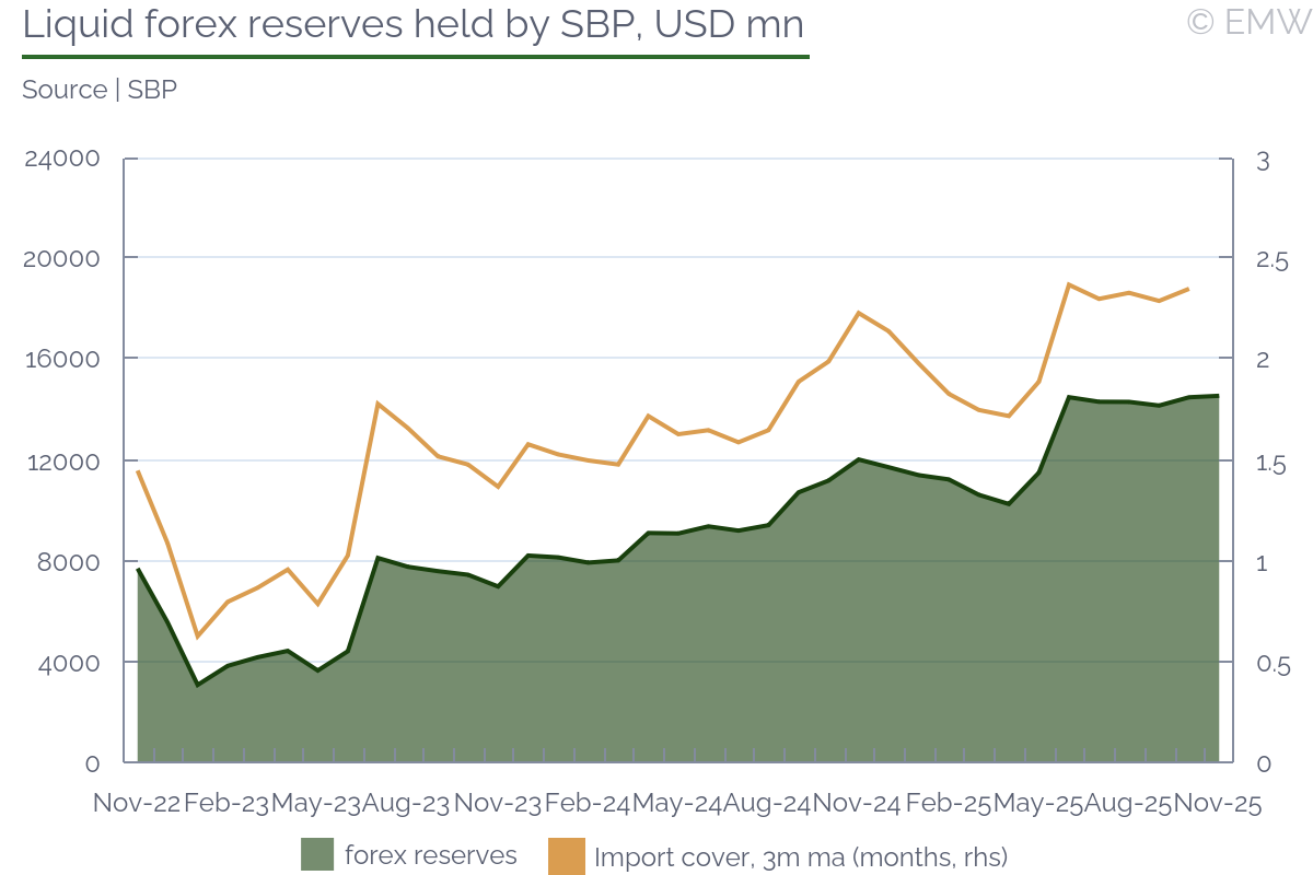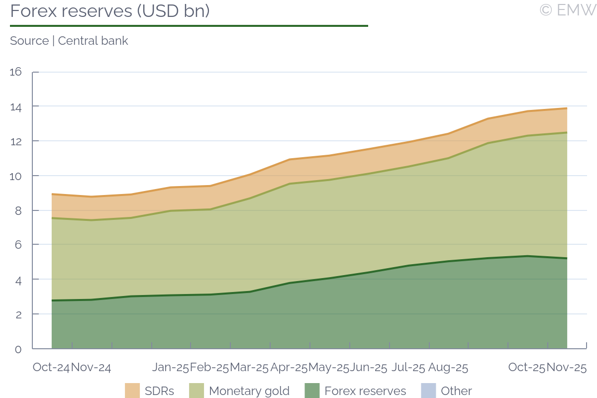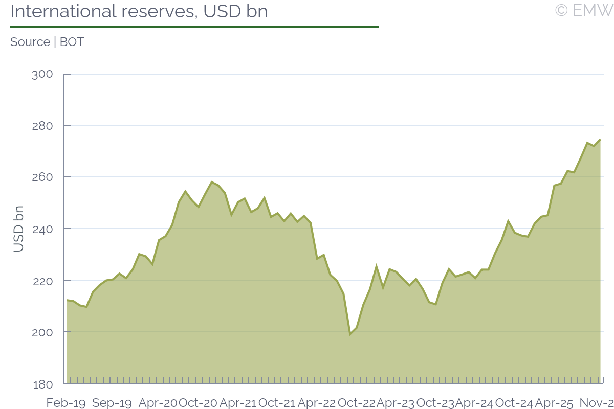 Gross international reserves rose by 1.0% m/m or USD 2.66bn m/m to USD 274.7bn as of end-November, a new record-high level, central bank data showed. In y/y terms, reserves increased by 15.7% y/y, accelerating from the 14.0% y/y growth in October. In particular, reserves in gold rose by 5.7% m/m to USD 31.9bn, explaining USD 1.7bn out of the USD 2.66bn in total reserves, which likely reflects the increase in the gold fixing rate. Foreign currency reserves rose at a more moderate pace by 0.4% m/m or USD 932mn to USD 235.96bn. Thailand's net forward position rose by 2.5% m/m to USD 24.0bn, indicating rising net obligations to buy foreign currency. Thus, net international reserves rose by 1.1% m/m to USD 298.7bn.