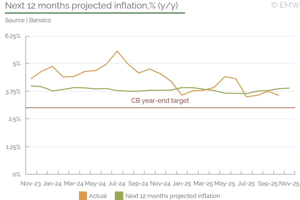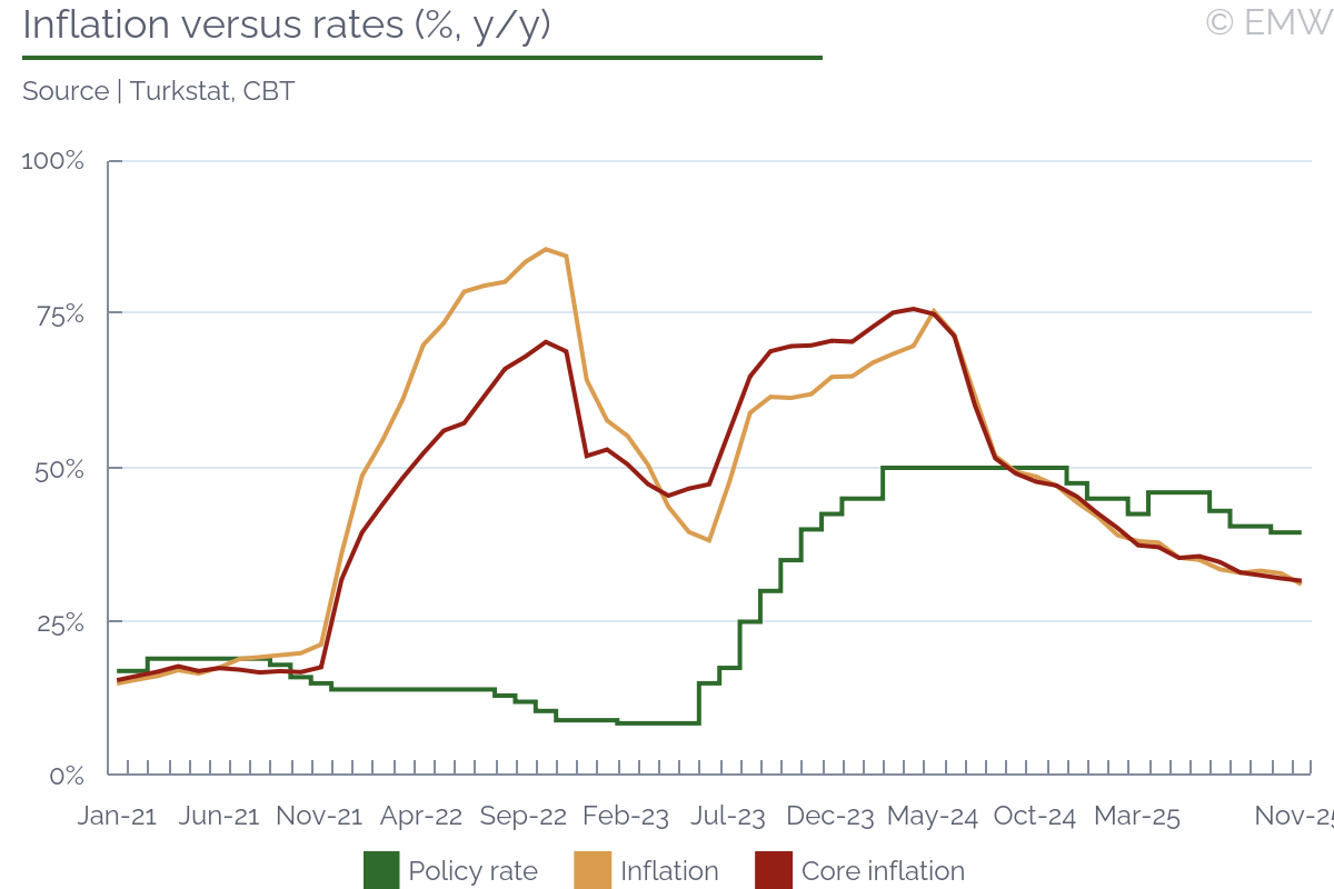 Next MPC announcement: 29 January 2026 Current policy rate: 6.75% EmergingMarketWatch forecast: 6.50% The SARB's November meeting delivered the widely expected 25bps rate cut, lowering the repo rate to 6.75% in a unanimous decision in a signal for the broad agreement that the conditions for resuming the easing cycle had been credibly met. The decision also reflected the MPC's increased confidence in the disinflation process, supported by lower-than-expected inflation outcomes, a firmer rand, softer oil prices, and steadier domestic activity. Importantly, the November meeting marked a further consolidation of the SARB's shift to the 3.0% point target with a 1% tolerance band, now firmly embedded as the centre of the policy framework. The MPC reduced both its near-term inflation and growth risks to balanced, reflecting a meaningful improvement in the macro-financial backdrop. The SARB revised headline inflation slightly lower to 3.3% for 2025 and 3.5% for 2026, while raising the 2025 growth forecast to 1.3% following stronger outcomes in Q2 and modest momentum into Q3. The structural shift to a lower point target is reshaping medium-term inflation dynamics. The SARB highlighted that the new framework is designed to anchor inflation expectations more firmly around 3%, influencing wage-setting, social-grant adjustments, and administered-price increases (with the notable exception of Eskom tariffs which continue to pose risks). Inflation has continued to undershoot SARB expectations, reinforcing the view that disinflation is becoming more firmly entrenched. While the MPC anticipated a temporary year-end acceleration, we expect the pick-up in December to be more modest, landing closer to 3.5% y/y rather than the 3.8% central bank projection. This means that January inflation would remain close to the 3% target, even under moderate monthly increases, indicating the absence of meaningful underlying price pressures. Core inflation also remains contained and aligned with the new point target supported by the firmer rand into year-end. If inflation expectations continue to converge toward 3% as suggested by market-based indicators and analysts' forecasts the SARB will have greater confidence that the disinflation process is durable, strengthening the case for another 25bps cut at the January meeting. The unanimous vote for a cut in November, coupled with the SARB's emphasis on the improved balance of risks and the ongoing convergence of expectations, suggests a broadening comfort within the MPC that additional easing can be delivered, subject to data confirming a sustained disinflation path. We therefore expect the MPC to deliver a 25bps cut in January, lowering the repo rate to 6.50%. A further gradual easing cycle through 2026 remains likely delivering at least 50bps and consistent with the SARB's aim to align the policy stance with inflation settling sustainably at the point target over the forecast horizon. Monetary Policy Committee Statement | |||||||||||||||||||||||||||||||||||||||||||||||||||||||||||||||||||||||||||||||||||||||||||||||||||||||||||||||||||||||||||||||||||||||||||||||||||||||||||||||||||||||||||