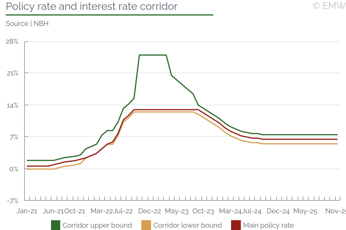 The MPC will maintain its current policy stance of keeping tight monetary conditions at least till December, we maintain our baseline scenario. The MPC did not budge from its monetary policy stance on its rate-setting meeting in October in a situation of rising government pressure to cut rates. We recall that PM Viktor Orban renewed the government calls for lower policy rate, saying that the inflation target was unnecessarily high and that there was room for rate cuts in the longer term. Economy minister Marton Nagy followed suit and argued that the inflation target could be achieved also by a lower policy rate. The real interest rate could still remain positive, but it could be lower, Nagy said, in our opinion implying room for rate cuts of around 1pp. NBH officials have insisted on keeping the current policy stance despite the government pressure, pointing to strong forint pass-through effect on inflation and elevated household inflation expectations. The NBH subsequently maintained the policy rate and its guidance in November, while the government pressure subsided anyway. The MPC did not revise its forward guidance on its meeting in November, fuelling our expectations that it will stick to its current policy stance in the near term. In the longer term, we believe that recent positive developments could create an opportunity for the MPC to reduce the policy rate without sacrificing its careful and patient policy approach. In particular, the Q3 Inflation Report of the NBH showed some improvement of the inflation outlook and the September inflation data showed an encouraging slowdown in food inflation, we note. MPC members were still wary that these developments might prove transient, according to comments from the November rate-setting meeting. In addition, the forint exchange rate has remained fairly strong and the MPC has already expressed satisfaction about its impact on manufacturing PPI and import prices. The inflation outlook, however, will benefit from a more sustained slowdown in import prices, so the MPC will need to continue supporting a stronger forint in the next month, we believe. Disinflation in the food sector will also need to become more firmly entrenched, which could contribute to moderating consumer inflation expectations. This process could eventually open room for credible monetary policy easing, but the appropriate conditions for this will not be present in the next months, we expect. Accordingly, the updated NBH forecast with the December Inflation Report will be more indicative whether a shift of the monetary policy stance will be possible, the MPC also indicated in the minutes of its November meeting. The MPC reiterated after its November meeting that tight monetary conditions were still warranted and monetary policy will continue to follow a careful and patient approach, together implying no change in the monetary policy stance in the short term. The MPC highlighted the increased importance of the forint for the inflation outlook and inflation expectations. The MPC noted some improvement in inflation expectations, but cautioned that they were still elevated, requiring stable forint in order to ensure they become anchored in line with the mid-term inflation target. It also sounded hawkish on the recent tame inflation data, pointing out that it reflected a strong downward impact from the government's price restrictions, while pricing behaviour remained excessive outside the scope of the price regulations. The MPC indicated a downward shift in the inflation outlook because of the government decision to extend and expand the margin cap, but implied that this was not sufficient to warrant a change in the monetary policy stance.