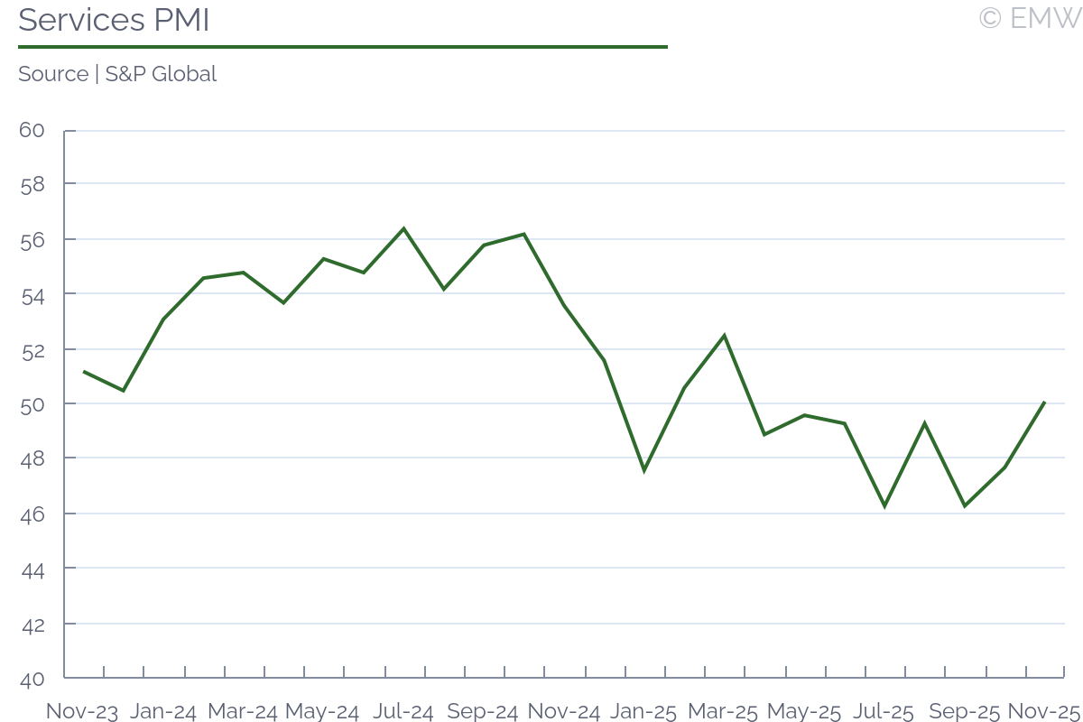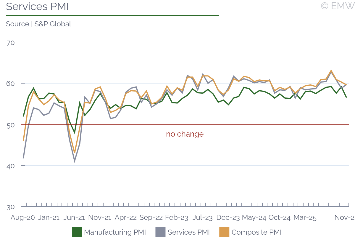 The S&P Global Ghana PMI inched down to 50.1 index points in November from 50.3 in October, signalling only modest growth in private sector activity during the month. New orders rose slightly but output was broadly unchanged as some businesses increased activity in line with new business and easing price pressures while others scaled back activity amid subdued demand. Employment and purchasing activity increased as input and output costs decreased. The decrease in input costs, which is the first in three months, reflected the strengthening of the cedi which lowered purchase costs. Companies responded by cutting selling prices for a seventh month in a row and at the fastest pace in three months. Business sentiment eased to a seven-month low but remained above the series average and indicated strong optimism about output growth over the next 12 months. Indeed, the disinflation, stable currency and the monetary policy easing are expected to support activity going forward. The PMI data signals continued albeit modest growth in private sector activity in H2 after the stronger results in H1. GDP growth averaged 6.3% in H1, up from 5.7% in 2024, driven by faster growth in agriculture and industry, in turn due to a rebound in cocoa and non-oil mining (mostly gold). The IMF forecast in its October WEO report that full-year growth will slow to 4% this year but the government's latest projection (2026 budget) is more optimistic, at 4.8%. Growth is seen to pick up moderately to about 5% over the next three years as economic reforms and fiscal consolidation take effect. | |||||||||||||||||||||||||||||||||||||||||||||||||||||||||||||||||||||||||||||||||||||||||||||||||||||||||||||||||||||||||||||||||||||||||||||||||||||||||||||||||||||||||||