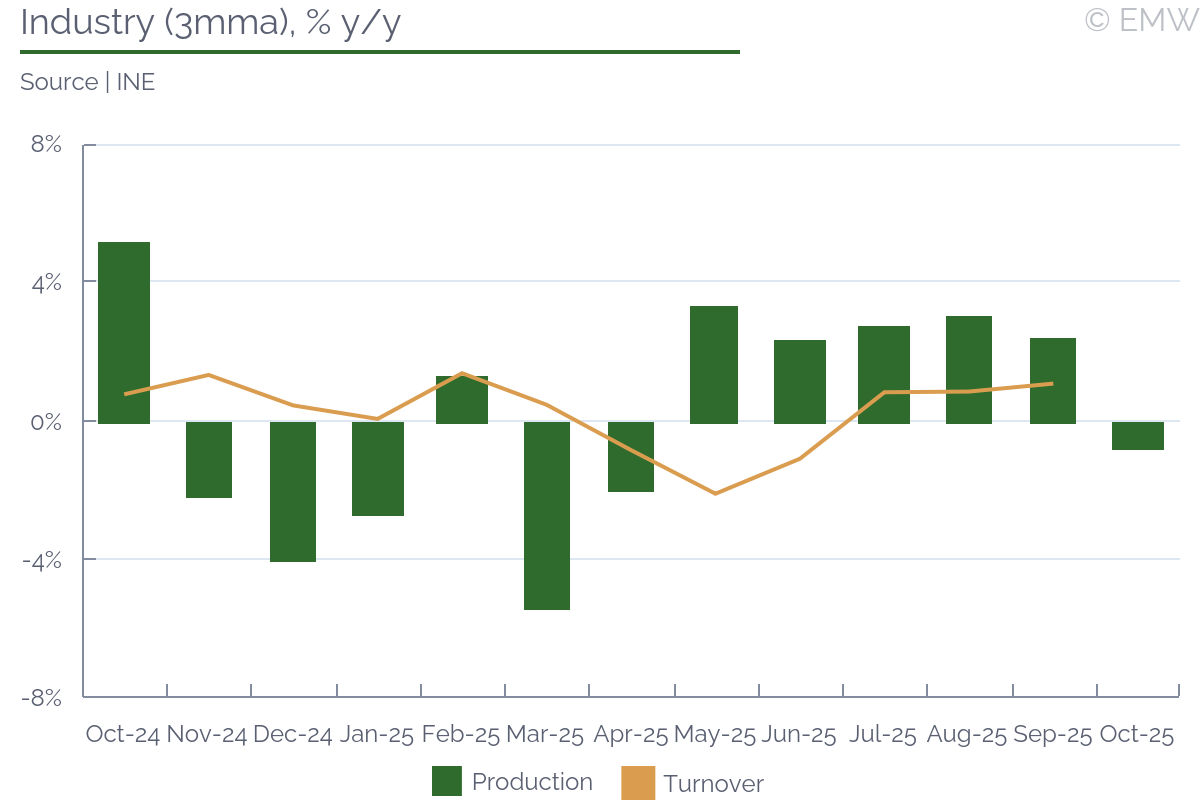 The overall economic climate deteriorated compared with a year earlier, mainly because expectations fell in extractives, tourism and transport, according to the quarterly business climate survey by the statistical office INE. Nonetheless, the aggregate indicator stayed slightly above its long-term average. Construction stood out as the strongest performer: confidence turned positive, employment and activity expectations improved, fewer firms reported operational constraints and public works accounted for roughly 71% of executed projects. The order book in public works ensured about 71 weeks of activity. Commerce remained weak, with a negative confidence trend driven by inventory pressures, even though activity indicators showed some resilience. A larger share of sold products was of domestic origin, and fewer firms reported constraints; demand weakness, financial stress and bureaucratic hurdles were the main issues. Manufacturing confidence held in positive territory but with signs of strain. Employment expectations supported the index, while production-related variables fell. More companies faced constraints, especially shortages of raw materials, mechanical failures and financial difficulties. Communication moved into negative territory as both current activity and expectations weakened. Financial constraints, competition and low demand were the key concerns, though firms reported fewer bureaucratic barriers and easier access to credit. Tourism suffered a drop in confidence due to weaker expectations for business and employment, despite a slight improvement in current activity. Constraint indicators eased but demand insufficiency, financial pressure and skills shortages continued to weigh on performance. Extractives showed favourable sentiment overall, supported by current production even as expectations for future production and exports fell. More firms faced operational difficulties, notably bureaucracy, equipment shortages, mechanical failures and lack of specialised labour.Transport remained in negative territory but showed a slight improvement relative to the previous year. All components of the indicator contributed negatively, and firms continued to report financial difficulties, competition, insufficient demand and regulatory barriers. Looking ahead, the economy appears to be stabilising around modest momentum. Public investment is providing short-term support to construction, while persistent structural issues such as financing constraints, bureaucratic barriers, equipment shortages and volatile demand continue to limit broader recovery. Conditions in extractives and trade will likely determine whether confidence can firm in the next quarters, especially if global commodity conditions improve and domestic credit conditions ease. | |||||||||||||||||||||||||||||||||||||||||||||||||||||||||||||||||||||||||||||||||||||||||||||||||||||||||||||||||||||||||||||||||||||||||||||||||||||||||||||||||||||||||||