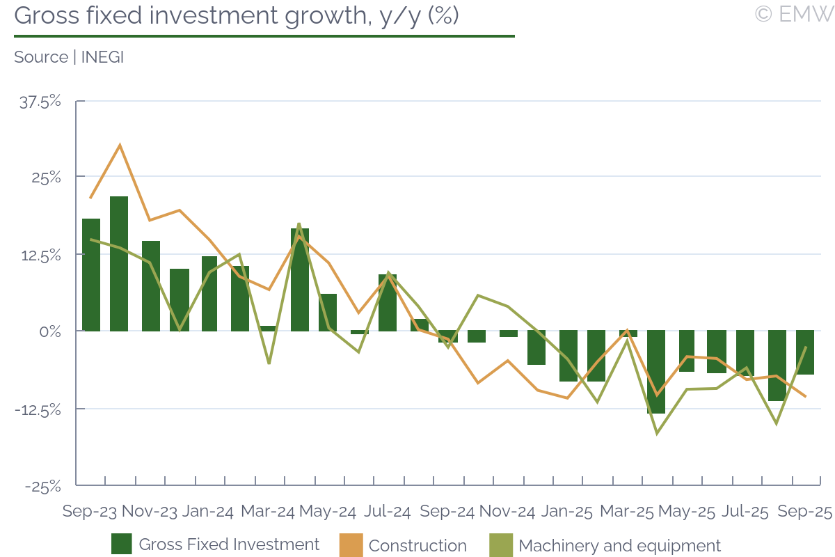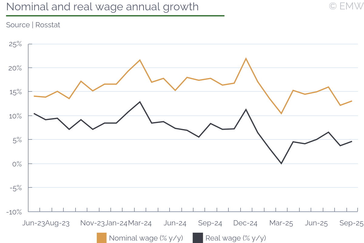 Real wages eased their growth to 4.5% y/y in Q3 from 5.1% y/y in Q2, according to figures from the statistical office. The slowdown was mostly due to nominal wages, whose growth reached 7.1% y/y in Q3, slower by 0.5pps q/q, while inflation picked up marginally, from 2.4% y/y in Q2 to 2.5% y/y in Q3. Furthermore, median wages reported a faster deceleration in growth, from 7% y/y in Q2 to 6.2% y/y in Q3 in nominal terms, and from 4.5% y/y in Q2 to 3.7% y/y in real terms. The print was in line with the CNB's staff forecast, which put nominal wages growing by 7% y/y, while real wages by 4.4% y/y. Market sectors remained the biggest source for the gap between the CNB forecast and the actual print, as market sector wages rose by 7.6% y/y, according to EmergingMarketWatch estimates. This was noticeably higher than the 7% y/y increase expected by the CNB, however. It is a strong indication that skilled labour shortages remain acute in the service sector, and that service providers are no longer digging into profit margins to make up for higher wages. It is likely the main reason why service price inflation has remained sticky for so long, and the odds are this will be the case for a while longer. Furthermore, the discrepancy between industry and the rest of the economy has continued, as industry was responsible for most of the slowdown in headline wage growth. Nominal wages in industry rose by 5.7% y/y in Q3, their softest increase over the past 3 years, and accounted for almost 90% of the headline slowdown. Industry continued to report a shrinking employment, down by 1.4% y/y, the consequence of weak external demand for local manufacturing, as well as producers retrenching and letting go auxiliary personnel. Meanwhile, employment in services rose by 1% y/y, and by 1.1% y/y in construction. Admittedly, service sector wages eased their growth as well, but by a marginal 0.1pps q/q to 7.4% y/y, still considerably above the average. Thus, industry remains behind most of the slightly softer wage growth, which will likely not matter that much for monetary policy. Monetary policy impact The latest wage print is overwhelmingly supporting the current hawkish stance of the CNB board. While headline inflation has eased, according to the latest flash estimate, it was still primarily because of volatile prices. Meanwhile, robust wage growth in the service sector promises that service price inflation will remain sticky, likely longer than currently anticipated by the CNB. Given recent remarks made by CNB board members, we cannot imagine anyone moving towards easing monetary conditions in the current environment. Inflation risks remain elevated, and service prices have the bigger weight in core inflation. With all that in mind, we believe that another hold decision at the coming MPC meeting on Dec 18 is practically guaranteed. Furthermore, we expect stable interest rates at least until Q3 2026, as the labour market momentum will take plenty of time to ease, especially if skilled labour shortages persist.