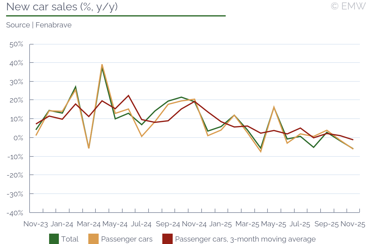 New passenger car sales rose by 14.1% y/y (wda) in November, up to 21, 317 units, according to figures from SDA, the car importers' association. In non-adjusted terms, car sales rose by 3.3% y/y, but the main reason was that there were two more working days a year ago than in 2025. In January-November, new car sales increased by 6.7% y/y, reaching 227,052 units. The sales of Skoda Auto, the largest local producer, did in line with the average, as they rose by 13.9% y/y (wda) in November, and by 7.1% y/y in January-November. Skoda was responsible for about a third of cumulative growth in passenger car sales, as the make has not lost its popularity. Skoda sales had a market share of 34% in November, and they are still more than the next 4 make report in sales combined. By type of fuel, petrol car sales remained in the lead in November, reporting an increase of 15.7% y/y. However, sales of plug-in hybrids also had a significant contribution, more than doubling in year-on-year terms. Meanwhile, sales of battery electric cars continued to stall, rising by only 1.1% y/y in November, while diesel car sales fell by 1.5% y/y. In cumulative terms, petrol cars now have a vast lead, seeing an increase in sales of 10.1% y/y in January-November. The EV sector has continued to expand at a robust rate, but its contribution to growth was half that of petrol cars. Battery electric car sales increase by 27.3% y/y in January-November, while sales of plug-in hybrids were up 80.4% y/y over the period. The EV sector had a market share of 9.9% in January-November, up from 7.2% a year ago. Meanwhile, used passenger car sales rose by 18.2% y/y in November, bringing its cumulative increase to 5.1% y/y in January-November. After a poor start, this year has shown a solid performance for used car sales, likely due to more budget offerings. Total vehicle sales, including buses, motorcycles, trucks, tractors, and trailers, reported a 13.5% y/y increase in November, out of which new vehicle sales rose by 11.6% y/y. As a result, total vehicle sales were higher by 4.7% y/y in January-November, with new vehicle sales rising by 4.3% y/y. Passenger cars were clearly the driving factor, as sales outside that segment were still declining. Overall, this is good news for the automotive sector, indicating that households and firms are increasingly spending on new vehicles. While growth rates are not spectacular, performance will be likely stronger than in 2024, showing that the market has returned to normal. There are naturally some structural shifts, namely the emergence of the EV sector, which was practically non-existent in 2019, at 0.5% of total passenger car sales.