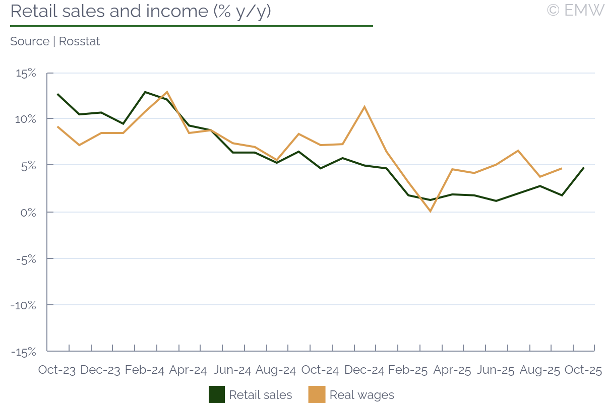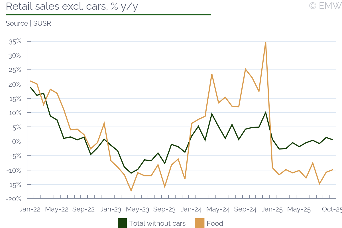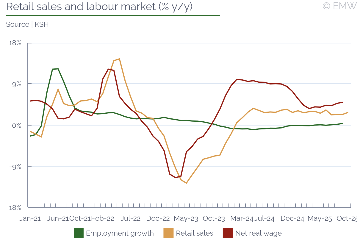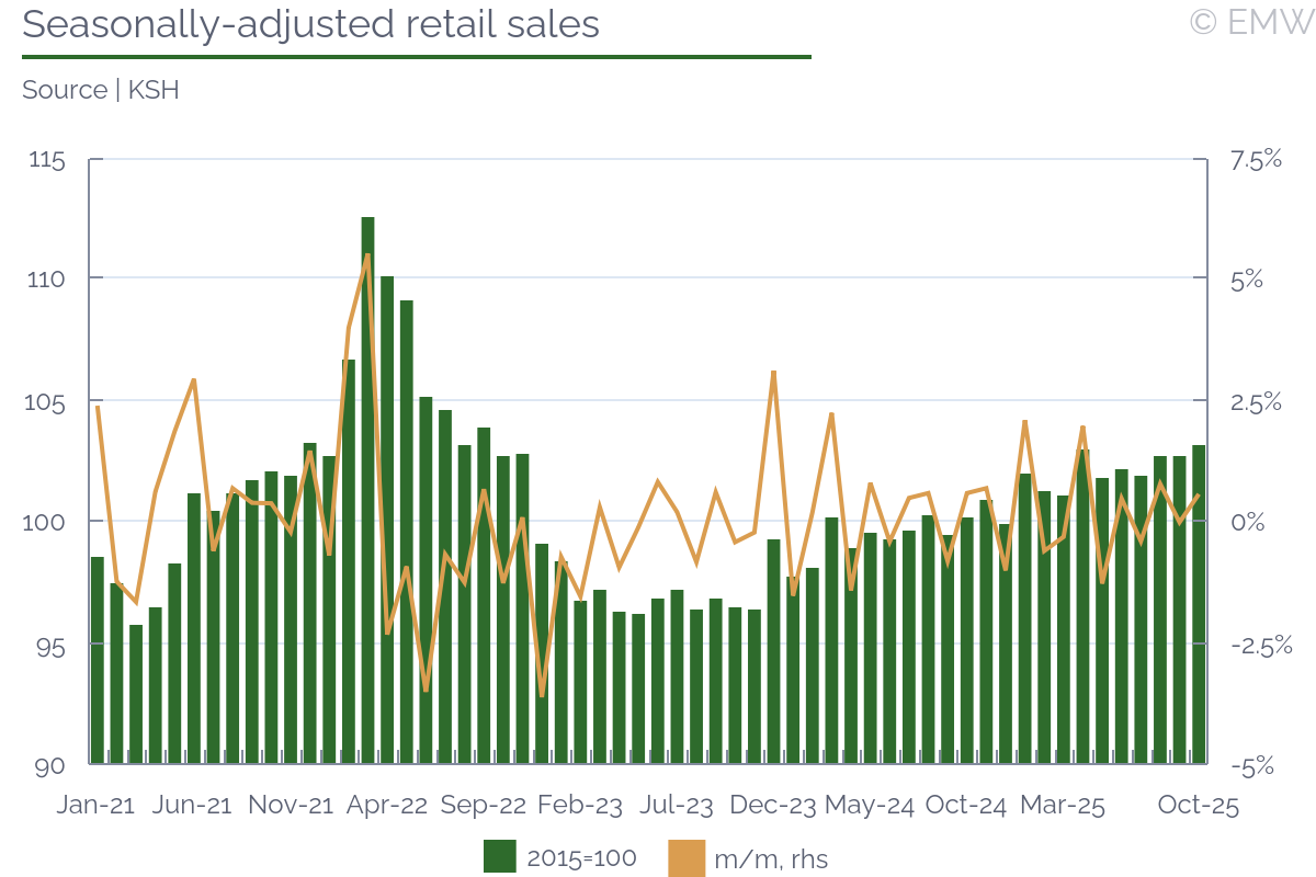 Retail sales growth accelerated to 3.1% y/y in October, compared to the 3.0% y/y increase in the previous month, the statistical office (KSH) reported. Growth picked up only mildly and was still the strongest print since February. It was slightly above the 2.9% y/y average increase since the beginning of the year, in our opinion highlighting the generally stable trajectory of retail sales growth over the year so far. Seasonally-adjusted retail sales rose by 0.5% m/m, which extended the recovery in retail sales since the local trough from 2023. We think the data indicated sustained, but unspectacular, growth of household consumption going into Q4, supported by real wage growth and low overall indebtedness, supporting an upturn in borrowing appetite. The stronger headline print in October was mainly on account of non-food sales. Non-food sales picked up to 5.2% y/y growth in the month and was one of the strongest increases in the year so far. Sales of manufactured goods in non-specialised shops and sales of clothing improved visibly during the month. Clothing sales, however, have been significantly volatile in the past few months, so we are not convinced that the observed strong growth could be sustained. We are rather inclined to see the figures as temporary spike, driven by seasonal differences in discount campaigns. Non-durable good sales slowed to 0.6% y/y growth in October - the weakest increase since Mar 2023, which could be due to exhausted impact from deferred purchases, in our view. Our overall impression from the data is for stable but cautious growth in retail sales, but without potential for further strengthening. Food sales slowed to 1.2% y/y growth in October, which can be also considered as a weak print in view of the recent history. Fuel sales rose by 0.6% y/y, practically in line with the average performance since the beginning of the year.