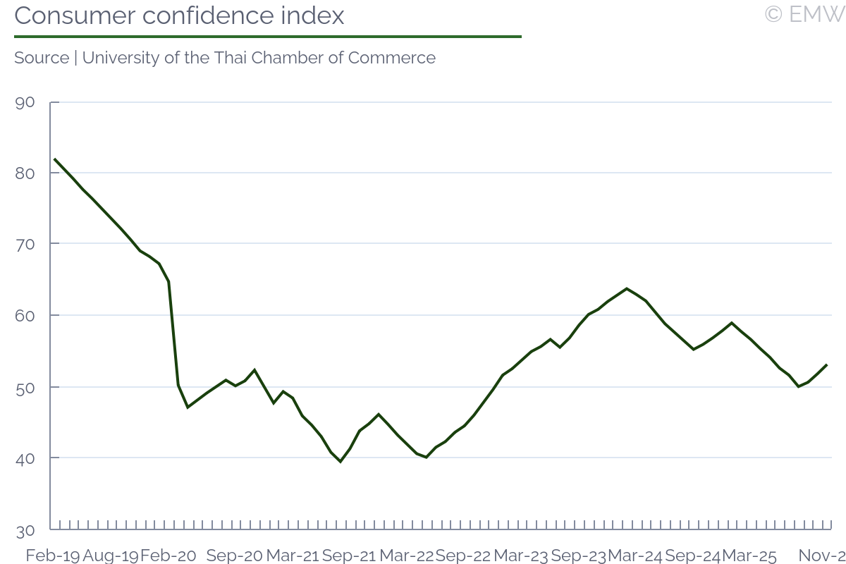 Consumer confidence rose to a 6-month high of 53.2 in November from 51.9 in October, data from the University of the Thai Chamber of Commerce (UTCC) showed. The headline consumer confidence improved for the third month in a row after reaching the lowest level in 32 months in August. That said, consumer confidence remains well-below the neutral level of 100. UTCC noted that government economic stimulus measures have helped consumer confidence recover as consumers are hopeful that stimulus will bring short-term recovery. On the other hand, the high costs of living, the flood problems, and the Cambodia border situation are all impacting negatively sentiment. Looking at the components of the index, the economic sentiment index, the overall job opportunities index, and the future income index all improved slightly compared to the previous month. Despite the improvement, consumers are still not confident about their job opportunities, while the cost of living remains high. UTCC also noted that flooding in the South, the trade war, and Thailand-Cambodia border tensions continue to pose risks that could undermine consumer confidence both now and in the near future. | |||||||||||||||||||||||||||||||||||||||||||||||||||||||||||||||||||||||||||||||||||||||||||||||||||||||||||||||||||||||||||||||||||||||||||||||||||||||||||||||||||||||||||