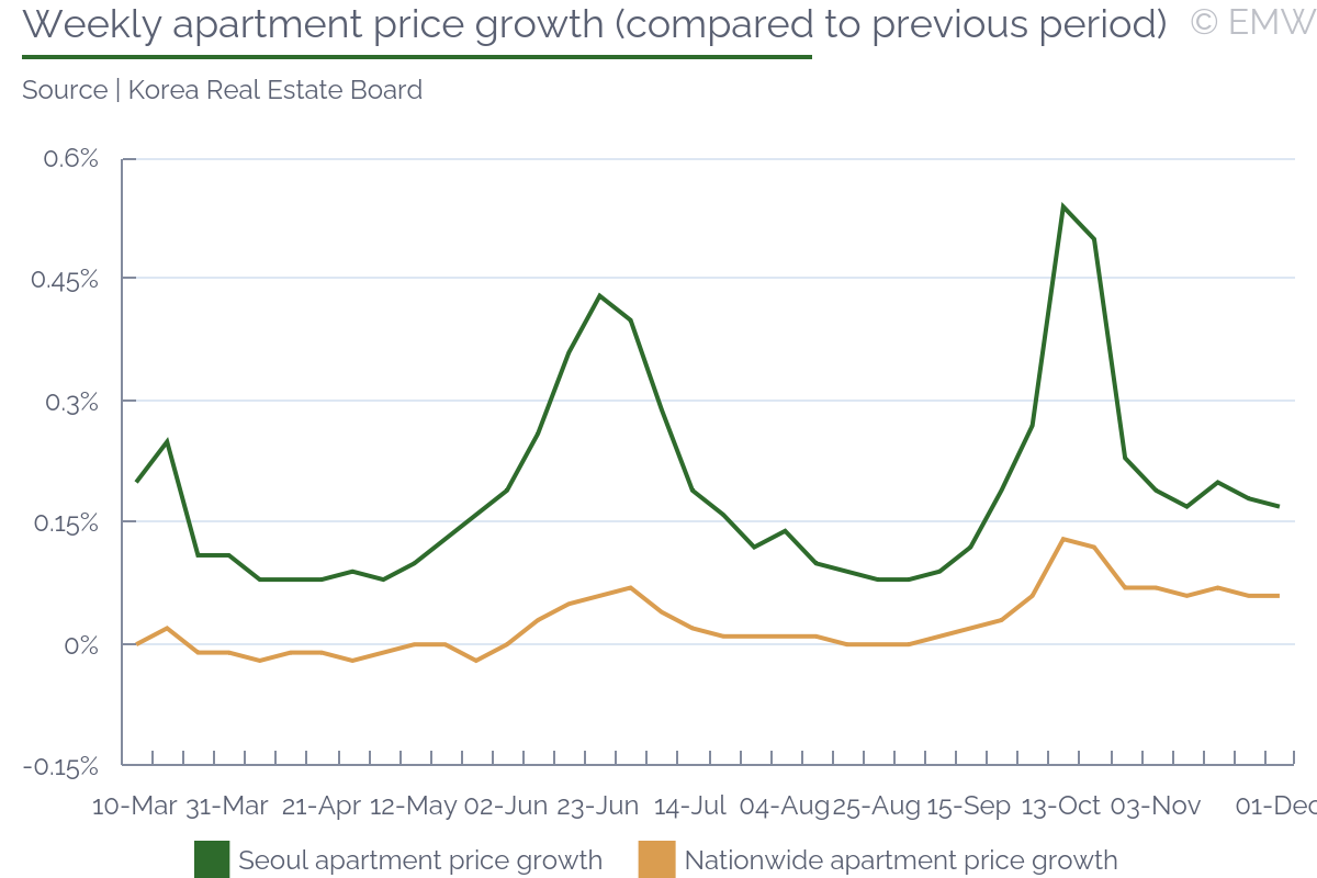 The weekly apartment price growth in Seoul eased marginally to 0.17% w/w in the week ending Dec 1 from 0.18% w/w in the previous week, data from the Korean Real Estate Board showed. At the same time, nationwide prices continued to rose by 0.06% w/w as in the previous week, with prices in five metropolitan cities excluding the capital area rising by 0.02% w/w compared to 0.01% w/w earlier. Jeonse prices also showed no signs of easing and rose at an unchanged pace by 0.14% w/w in Seoul and 0.08% w/w nationwide. The market atmosphere remains in a wait-and-see mode, with transactions and inquiries both falling. However, shortages of properties in preferred complexes are still causing prices to rise. For instance, prices in the 11 districts south of the Han river rose by 0.22% w/w compared to 0.11% w/w for the 14 districts North of the river. The high-flying district, Songpa-gu, saw an increase by 0.33% w/w. Overall, we still think that price growth remains too high for the BOK to cut rates as it happened in the previous 4 BOK meetings. The Seoul apartment price growth remains stubbornly high even though the government introduced a new package of housing stabilization measures in mid-October. | |||||||||||||||||||||||||||||||||||||||||||||||||||||||||||||||||||||||||||||||||||||||||||||||||||||||||||||||||||||||||||||||||||||||||||||||||||||||||||||||||||||||||||