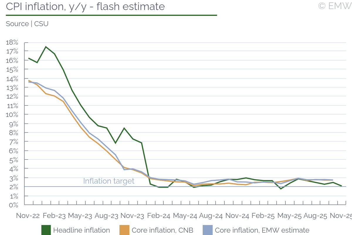 CPI inflation eased to 2.1% y/y in November from 2.5% y/y in October, according to the latest flash estimate from the statistical office. The print was visibly below market expectations, which put headline inflation at 2.5% y/y. However, it was only slightly below the CNB's forecast, according to which headline inflation should be at 2.2% y/y. Consumer prices fell by 0.3% m/m, while markets expected an increase of 0.1% m/m. Food prices were again behind the surprise, as food, alcohol, and tobacco prices eased their growth from 3.9% y/y in October to 2.8% y/y in November. Non-processed foods eased their increase to 1.9% y/y, the softest since last December. Besides, some base effects may be in play, as food & non-alcoholic beverage prices rose by 0.4% m/m in November 2024, so a decline a year later will push down year-on-year growth noticeably. Based on the same development, however, we may see another swing upwards in December, as food & non-alcoholic beverages saw a 0.7% m/m price increase in December 2024. Meanwhile, service prices rose by 0.1% m/m, which was the same rate of increase as a year ago, which kept their year-on-year growth flat at 4.6% y/y. Thus, there has been no easing in service price inflation, and the breakdown shows that the entire slowdown in headline inflation came from goods' prices, which eased their growth to 0.6% y/y, the softest in the past 7 months. In all fairness, goods' prices did not ease only because of food prices, as goods' prices excluding food, alcohol, and tobacco fell by 1% y/y in November, faster by 0.4pps m/m. The detailed CPI breakdown and core inflation numbers will be published on Dec 10, at 9:00 CET. Monetary policy impact Even though service price inflation remains sticky, we still expect a slight slowdown in core inflation, by about 0.1pps, to 2.7% y/y in November. This is still an elevated level, however, and we doubt it will change the CNB board's stance. Slowdown of headline inflation is still exclusively driven by goods' prices, aided by a strong CZK, and these can be volatile. Meanwhile, the labour market remains tight, as nominal wages continued to rise significantly above the CNB's expectations, which will likely keep fuelling service price inflation. Besides, if our expectations about food prices are accurate, we may observe another upward swing in December, which will erase the slowdown in headline inflation seen now. As a result, we expect that interest rates will remain stable for a while. There is nothing to indicate that the structural factors behind elevated core inflation will disappear. If anything, data implies that inflationary conditions may stick around longer than originally anticipated. Thus, our expectation remains unchanged, namely that the CNB will keep its policy rate at 3.50% at least until Q3 2026.