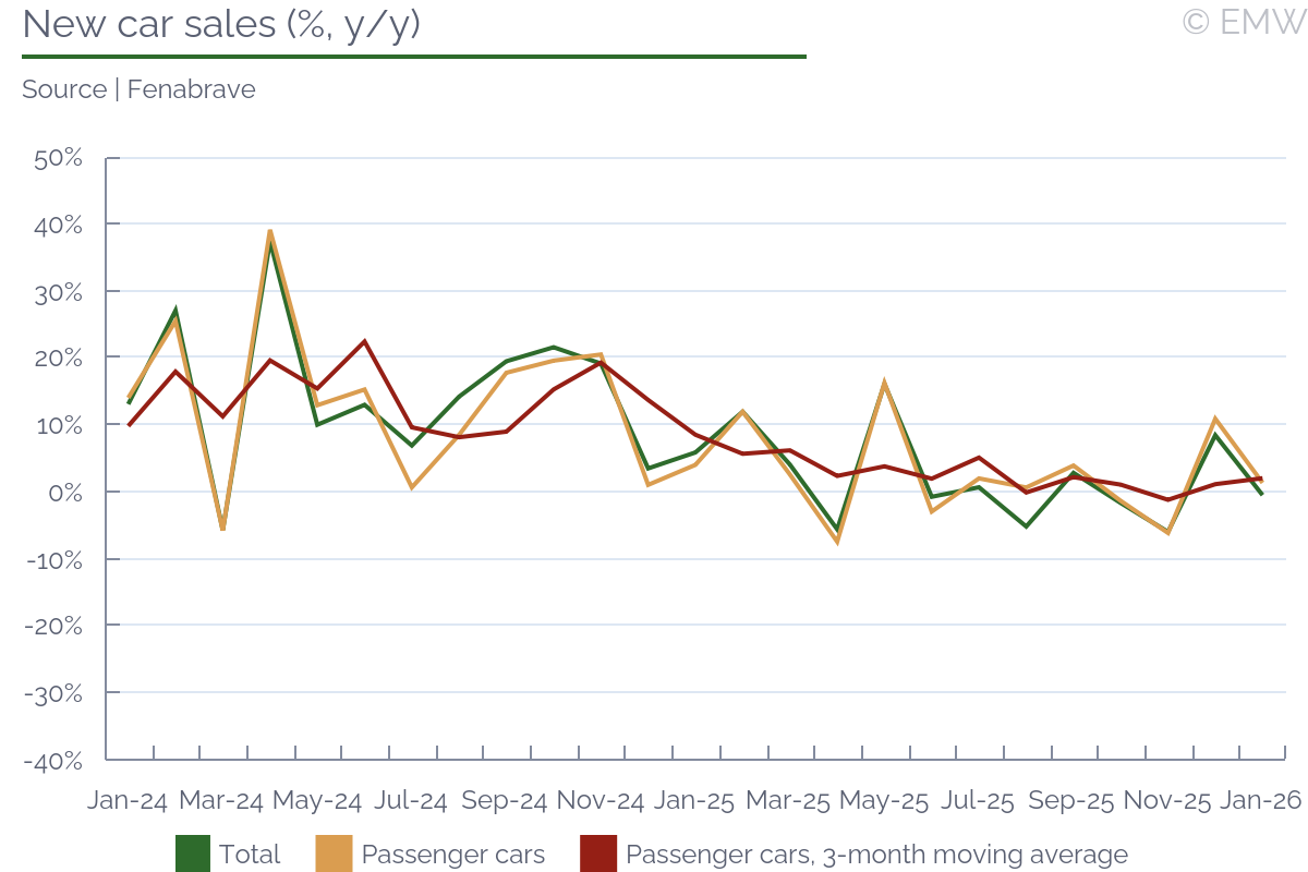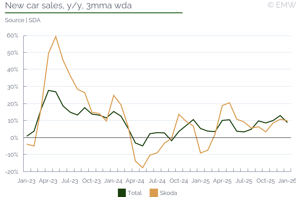 New passenger car sales fell by 2.3% y/y (wda) in January, down to 18,043 units, according to figures from the SDA, the car importers' association. In non-adjusted terms, sales fell by as much as 6.7% y/y, mostly due to there being one fewer working day in 2026 than in 2025. Still, Skoda Auto did better than the market, reporting an increase in sales by 5.9% y/y (wda), taking almost a 40% market share. By fuel, it was petrol cars that drove sales downwards, falling by 5.7% y/y in January. Meanwhile, sales of plug-in hybrids were the only larger segment to report a noticeable growth, up by 38.9% y/y. In all fairness, diesel and battery electric cars reported calendar-adjusted growth as well, but it was muted. As a result, the EV segment preserved a 10% market share, which has been the case since mid-2025. Used passenger car sales rose by 2.3% y/y in January, though they remained far behind new car sales. The used car segment has been reporting relatively steady monthly sales since 2024, and year-on-year changers have remained muted. Total vehicle sales, including buses, motorcycles, trucks, tractors, and trailers, rose by 1% y/y in January, out of which new vehicle sales increased by only 0.2% y/y. As a reminder, used vehicle sales rose by 14.5% y/y in 2025, mostly due to vehicles other than passenger cars.