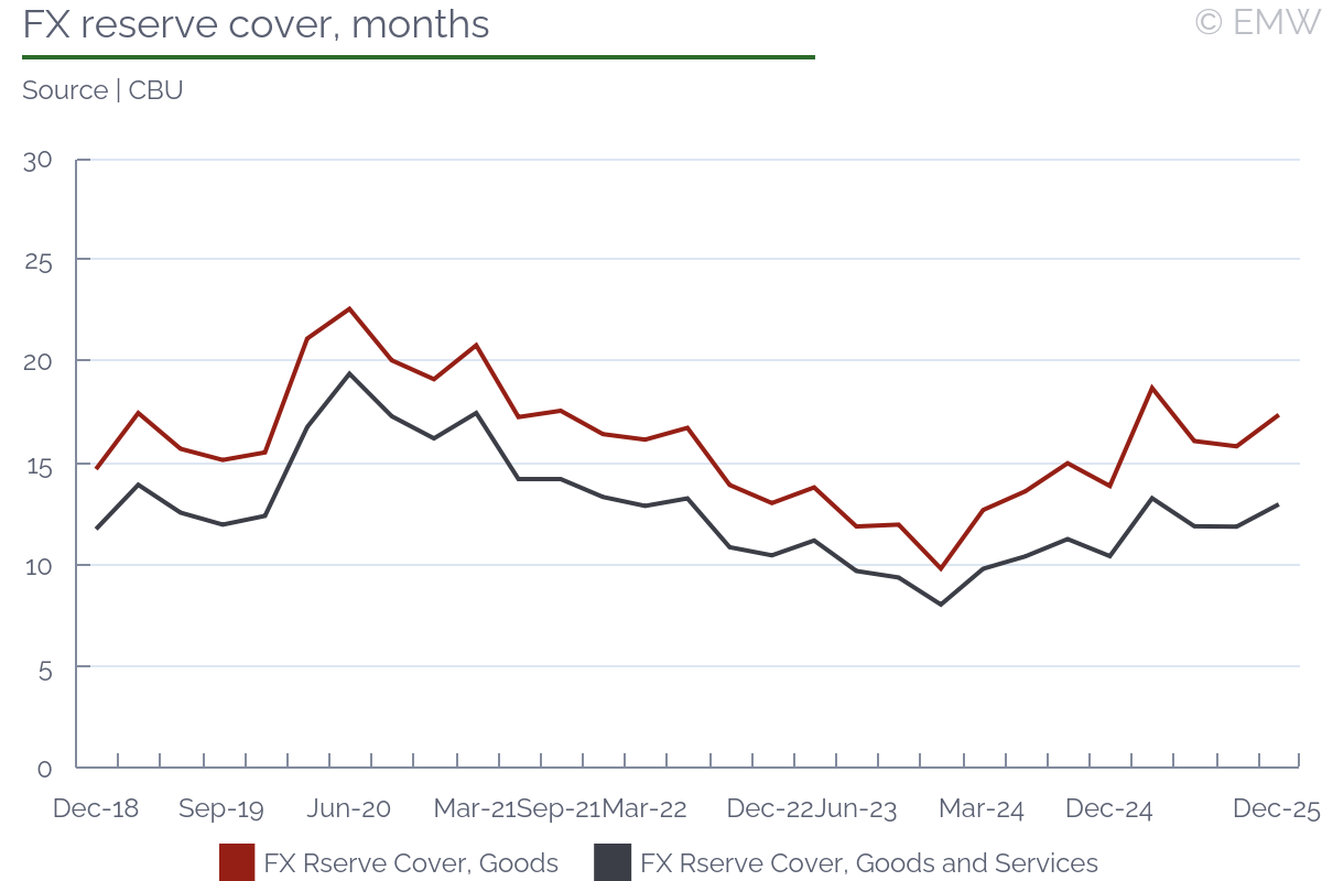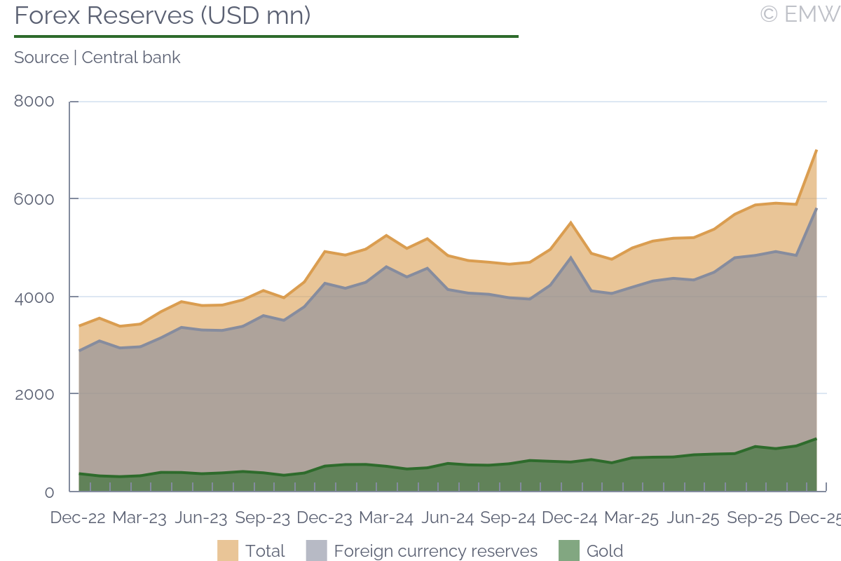Mongolia's FX reserves rose to USD 7bn in December after posting USD 5.9bn in November, according to data published by the central bank. The significant m/m expansion was mostly driven by an increase in the foreign exchange assets category. Overall, the data shows a decisive impact from the 'securities' item. We think this is a combination of the valuation effect and reallocation, as the 'deposits' item shows a broadly comparable reduction. As a whole, the central bank's foreign exchange assets reached USD 5.8bn. Gold reserves rose as well, posting USD 1.1bn (from USD 947mn) amid higher global prices. As a whole, the current level of FX reserves exceeds year-end projects. It is also above the medium-term target set by the central bank (USD 6.5bn). A level of volatility may be possible in the future, depending global market conditions. | |||||||||||||||||||||||||||||||||||||||||||||||||||||||||||||||||||||||||||||||||||||||||||||||||||||||||||||||||||||||||||||||||||||||||||||||||||||||||||||||||||||||||||||||||||||||||||||||||||||||||||||||||||||||||||||||||||||||||||||||||||||||||||||||||||||||||||||||||||||||||||||||||||||||||||||||||||||||||||||||||||||||||||||||||||||||||||||||||||||||||||||||||||||||||||||||||
