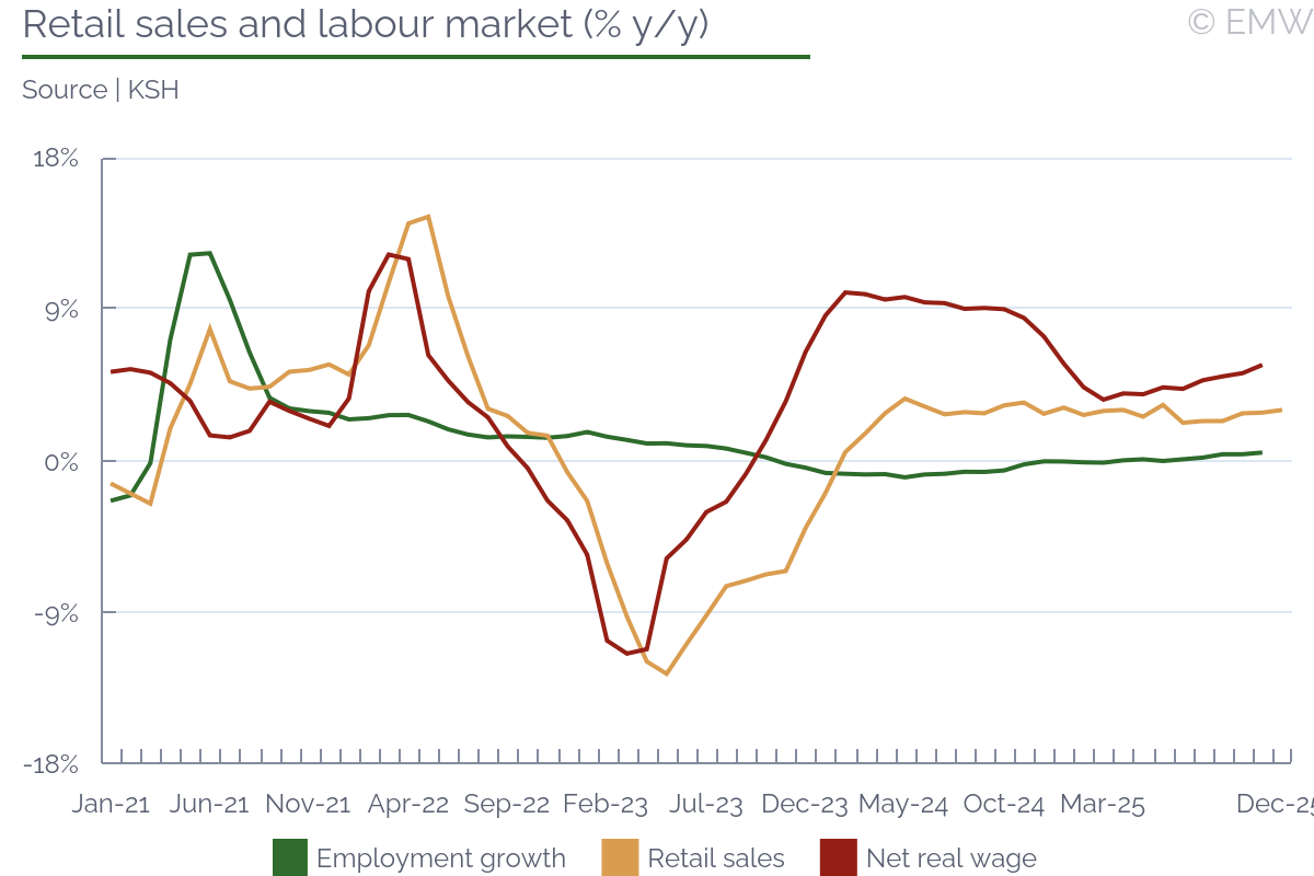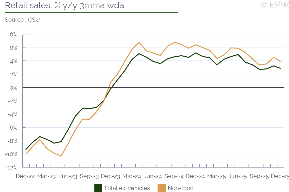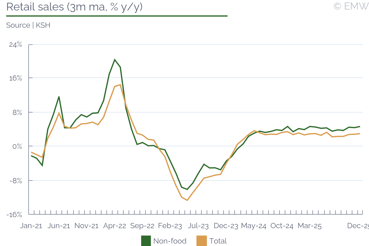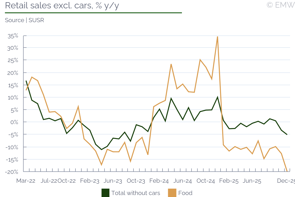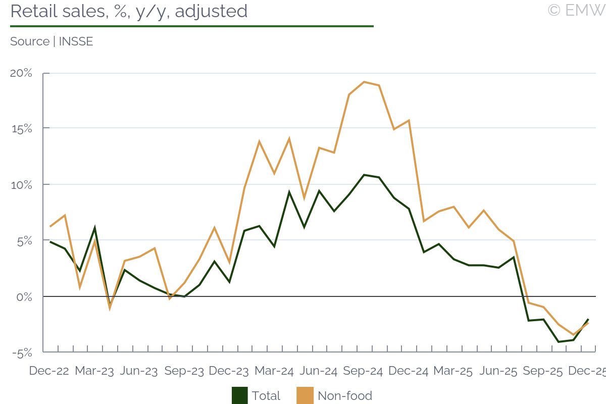 Retail sales, excluding vehicles, eased their growth to 1.8% y/y (wda) in December from 4.5% y/y in November (revised from 4.6% y/y), according to figures from the statistical office. The print was significantly worse than market expectations, which put retail sales growth at 3.4% y/y. Retail sales also fell by 0.1% m/m (sa), which is pretty untypical for the end of the year. The biggest swing was again in online sales, which moved from a 15.4% y/y jump in November to a modest 3.8% y/y increase in December. It appears that discount campaigns were not extended at the expected rate, leading to much less holiday shopping. As a result, non-food sales eased their growth from 6.3% y/y in November to 2% y/y in December, being the main reason behind weaker headline performance. Fuel sales weakened as well, as their growth went from 6% y/y in November to 3.9% y/y in December. Regarding in-person shopping, the biggest deterioration was observed in sales of cultural & recreational goods, which fell by 1% y/y in December after rising by 3% y/y in November. There was weaker performance in other categories, but not nearly as impactful as the items listed above. Monetary policy impact Thus, it appears that households did most of their pre-holiday shopping in November when discounts were bigger. In all fairness, online sales performed strongly in December 2024, so there was a high base. Still, it appears that online shops really pushed the envelope with Black Thursday promotional campaigns this time, which reflected on year-on-year comparison. Thus, we believe this didn't reflect as much on household consumption growth, it just shifted it within the quarter. Retail sales rose by 2.9% y/y in Q4, similar to a 2.8% y/y increase in Q3, so no major change in patterns. Moreover, retail sales rose by 0.8% q/q (sa) in Q4, improving from a 0.1% q/q (sa) fall in Q3. As a result, we don't believe the December retail print will have any major impact on monetary policy.