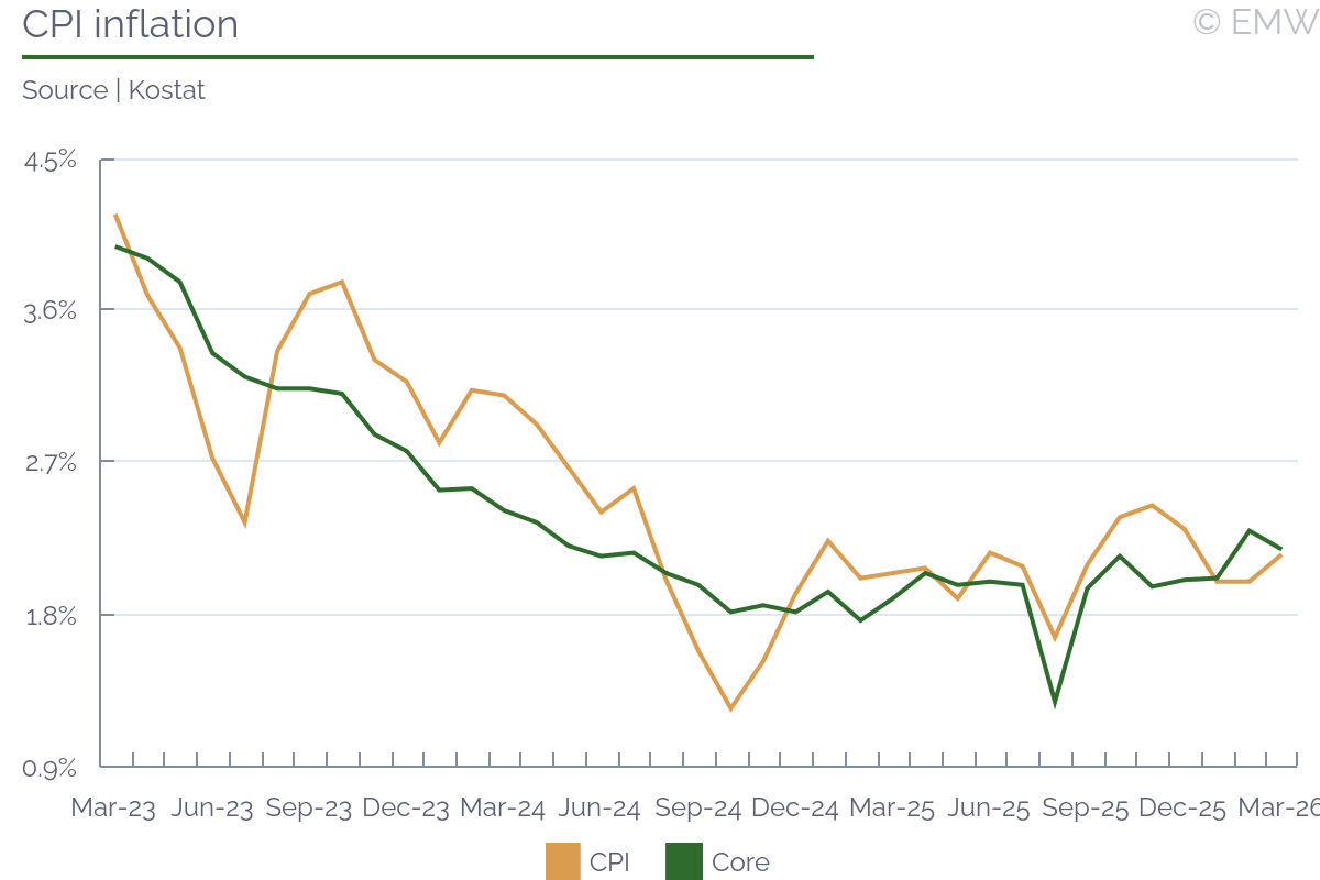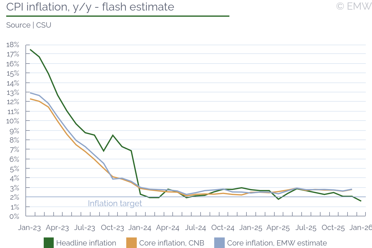 CPI inflation eased to 1.6% y/y in January from 2.1% y/y in December, according to the latest flash release from the statistical office. The print matched market expectations, largely impacted by energy price cuts. Consumer prices rose by 0.9% m/m in January, slightly stronger than the expected 0.8% m/m, but the increase was softer than the 1.3% m/m reported a year ago. Unsurprisingly, energy prices had the main impact on headline inflation, as they fell by 3.7% m/m and by as much as 7.9% y/y. They were responsible for almost the entire deceleration in headline inflation, though there was downward pressure from food prices as well, whose growth eased from 1.7% y/y in December to 1.3% y/y in January. As a reminder, the statistical office broke down the category that included, food, alcohol, and tobacco prices, and now alcohol & tobacco prices are in a separate chapter. This was just in time, as alcohol & tobacco prices reported a stronger increase, up to 4.7% y/y in January, faster by 0.6pps m/m. It reflects the 5% increase in excise tax rates, effective as of the beginning of the year. Thus, the tax impact mostly negated the downward push coming from food prices. Change in CPI basket gives a stronger weight to core goods and services Another thing to note is that the CPI basket has been revised, and services now have a bigger weight, up from 38% to 41.3%. Meanwhile, energy's weight was reduced, from 12.29% to 11.23%, which explains why the impact from removing the renewable energy surcharge and declared energy price cuts was lower than we estimated. Moreover, food & non-alcohol beverages had its weight reduced from 17.7% to 16.9%, which also mitigates the downward impact from lower food prices. While the flash release doesn't provide a very comprehensive look, it appears that the weight of core goods and services has increase, which means that core inflation will likely see a stronger weight as well. Core inflation likely to remain flat at 2.8% y/y Speaking of core inflation, we estimate that it remained flat at 2.8% y/y in January. Service price growth eased only marginally, from 4.8% y/y in December to 4.7% y/y in January, though the easing appears to have been mostly on the back of regulated services. Meanwhile, core goods' prices saw their growth slow down from 0.3% y/y in December to 0.2% y/y in January (EmergingMarketWatch calculation). Thus, it appears that core inflation will remain significantly elevated, though the gap with headline inflation is largely due to energy prices. As a reminder, energy prices are included in the goods' category, and are classified as regulated prices, even though they have some market component. Therefore, lower energy prices will have zero impact on core inflation, though there may be some indirect effect, through lower production costs. Monetary policy impact Given the persisting divergence between headline and core inflation, we expect that the CNB board will keep the policy rate at its MPC meeting later on Thursday (Feb 5). While headline inflation is now noticeably below the 2% target, the main reason is the government's move to eliminate the renewable energy surcharge. As a reminder, the CNB board stated clearly it will not consider that decision during monetary policy considerations. If energy prices are excluded, inflation actually accelerated slightly, from 2.9% y/y in December to 3% y/y in January, so inflation pressure has not abated outside that one-off effect. Future CPI prints may change this view, but as long as inflation number look like this, we don't see a room for monetary easing. The CNB will need to work harder than usual to argue its position, though, as the odds are many will expect that interest rates should decrease, at least slightly. There is a new staff forecast to be published this week, a summary coming on Thursday, and the full forecast on Friday (Feb 6), and it will be interesting to see how the projected inflation path has changed. There will also be adjustments to GDP forecasts, to the upside, so the odds are that core inflation projections will not be that favourable. In any case, we believe our expectation of stable rates throughout H1 still stands. There may be some window of opportunity to lower interest rates later, starting in Q3, but it will largely depend on inflation developments and price growth structure. The full CPI release, along with the new CPI basket, will be published on Feb 13.
