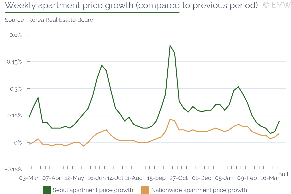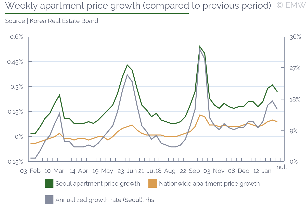 Seoul apartment price growth slowed down marginally to 0.27% w/w in the week ending Feb 2 from 0.31% w/w in the preceding week, data from the Korea Real Estate Board (REB) showed on Thursday. The annualized growth rate thus moderated slightly to 15.1%, which is still much higher than the cumulative increase of 8.7% in 2025. Prices nationwide rose by 0.09% w/w compared to 0.1% w/w previously, while Jeonse rental prices nationwide rose by 0.08% w/w compared to 0.09% w/w previously. Overall, the government's announcement that it will end the exemption of the capital gains tax surcharge of 20-30pps for multiple home owners from May 2026 hasn't impacted the market tangibly so far. In that vein, the government also announced on Feb 5 that it will announce measures to ease impact of capital gains tax on multiple-home owners from next week. The end of the exemptions could potentially force many multiple home owners to sell before May. However, the current momentum driving prices higher in the Seoul real estate market remains quite strong. | |||||||||||||||||||||||||||||||||||||||||||||||||||||||||||||||||||||||||||||||||||||||||||||||||||||||||||||||||||||||||||||||||||||||||||||||||||||||||||||||||||||||||||||||||||||||||||||||||||||||||||||||||||||||||||||||||||||||||||||||||||||||||||||||||||||||||||||||||||||||||||||||||||||||||||||||||||||||||||||||||||||||||||||||||||||||||||||||||||||||||||||||||||||||||||||||||