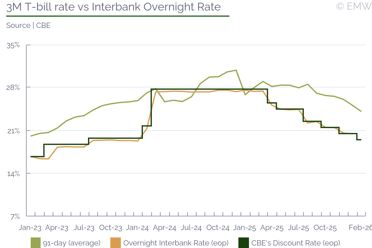 Ethiopia and the European Investment Bank (EIB) signed a EUR 110mn loan agreement aimed at expanding access to finance for rural financial institutions, reinforcing concessional funding flows amid tight domestic credit conditions. The agreement was signed by Finance Minister Ahmed Shide and EIB public sector division head Diederick Zambon. According to the Ministry of Finance, the loan will finance a Rural Finance and Development Project designed to improve access to credit for micro-enterprises and small businesses, particularly those linked to agriculture and rural value chains. The funds will be channelled through the Development Bank of Ethiopia (DBE) to microfinance institutions and cooperatives operating across the country. The EIB loan forms part of a broader co-financing package that includes a USD 35.1mn grant and USD 4.8mn loan from the International Fund for Agricultural Development (IFAD), alongside EU support comprising €8.5mn in technical assistance and EUR 8.26mn in additional grants. We note that the operation aligns with Ethiopia's strategy of prioritising concessional external financing while limiting non-concessional borrowing under the IMF-supported programme. However, credit transmission risks remain, given capacity constraints among rural financial institutions and DBE's growing balance sheet exposure. | |||||||||||||||||||||||||||||||||||||||||||||||||||||||||||||||||||||||||||||||||||||||||||||||||||||||||||||||||||||||||||||||||||||||||||||||||||||||||||||||||||||||||||||||||||||||||||||||||||||||||||||||||||||||||||||||||||||||||||||||||||||||||||||||||||||||||||||||||||||||||||||||||||||||||||||||||||||||||||||||||||||||||||||||||||||||||||||||||||||||||||||||||||||||||||||||||