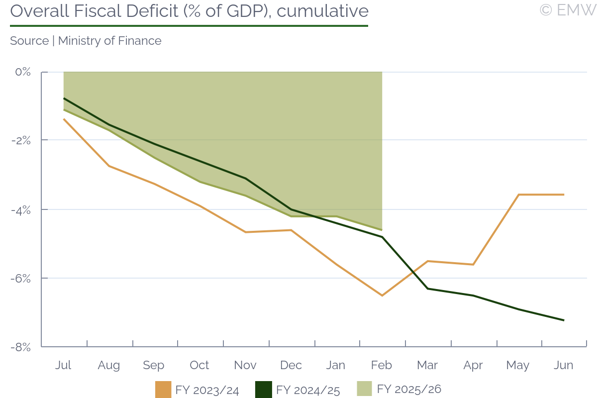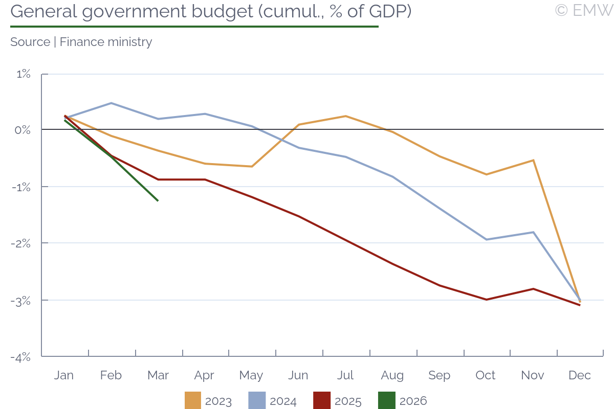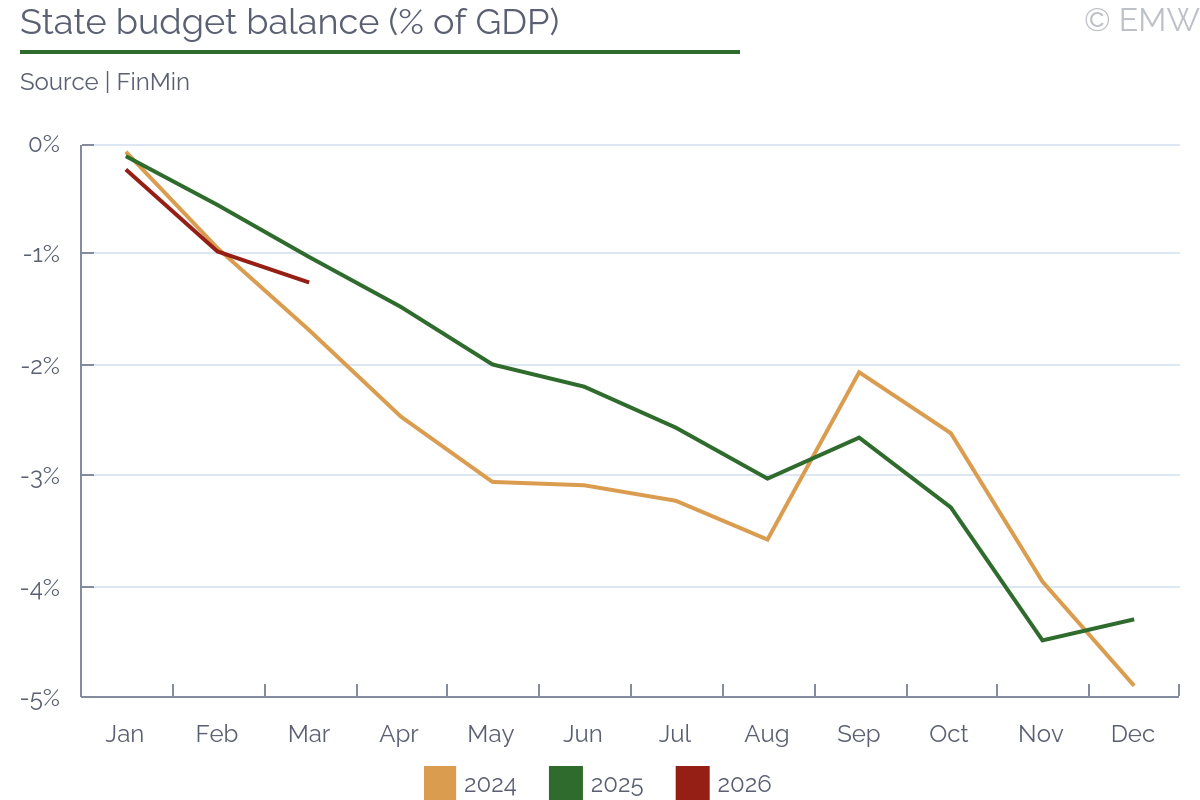 Fiscal loosening to remain modest in 2026, financing needs to rise Fiscal loosening is projected to remain modest in 2026, as the new government has decided that it will implement the bulk of its fiscal policy commitments in 2027. Thus, the general government deficit will reach 2.2% of GDP in 2026, up from 2% of GDP in 2025. It is indicative that the structural balance will also deteriorate, to 2.2% of GDP, which is in line with IFI projections of a modest negative fiscal impulse in 2026. Given medium-term risks to the fiscal framework related to ageing, this is hardly an advisable policy. Yet, it has been a conscious choice on behalf of the new government, which decided that voter anger with fiscal consolidation is more dangerous than a fiscal deterioration in the medium to long term. It is why pension reform will be rolled back, which will not have an immediate fiscal impact, but will deny future savings. The effective tax burden will decrease, from 33.2% in 2025 to 32.4% in 2026, largely due to the expiration of windfall tax. There are some residual payments due in early 2026, but this doesn't matter on an accrued basis, which is how general government parameters are calculated. In any case, the new government will have a reason to brag that it reduced the tax burden, in contrast with the previous one, which raised it to obtain to consolidate public finances. Financing needs to reach 8.2% of GDP in 2026, though one-off windfall related to EU funds may lower them The cost of structural deterioration can be seen in the gross borrowing requirement, which will rise from CZK 673.5bn (7.9% of GDP) in 2025 to CZK 733.6bn (8.2% of GDP) in 2026. As we mentioned above, there is a one-off windfall for budget performance on cash basis, which means that actual financing needs can end up lower than planned. Even then, financing needs are likely to end up at least modestly above those in 2025 in absolute terms. Gross bond issuance is planned at CZK 400-650bn, according to the funding and debt management strategy. Given that bond amortisation is projected at CZK 200bn, it puts net bond issuance at CZK 200-450bn in 2026. The budget law puts net long-term domestic financing at CZK 282.6bn, which falls comfortably within that range. Thus, the odds are net bond issuance will be around CZK 250bn, accounting for the windfall related to EU funds. No Eurobonds are planned, but the finance ministry may consider borrowing through EUR-denominated bonds issued under Czech law. As far as external borrowing is concerned, it is planned to be exclusively through bilateral loans from IFIs, most likely the EIB. Net long-term external financing is projected at CZK 43bn, all on loans, and the finance ministry plans to draw loans from the EIB for up to CZK 72bn to cover EUR financing needs. Structural deficit remains above legal limit, despite finance ministry's arguments The main issue that remains is that the fiscal framework and deficit targets remain above the limit set in the fiscal responsibility act. While the finance ministry has already drafted changes, proposing a shift to a net primary expenditure rule, the current law still applies, and it sets the structural deficit limit at 1.75% of GDP in 2026. As seen from the table below, the projected structural deficit is 2.2% of GDP. The finance ministry has tried to argue that it is implementing EU legislation, as well as resolving issues with uncovered expenses in the original budget bill. Furthermore, it considers the new bill as a revision, rather than a new piece of legislation, which would mean that structural deficit limits no longer apply. We consider such arguments as thin, and the Czech Fiscal Council agrees with us. Yet, the government is firmly decided to proceed with this budget bill, and there appears no one able to stop them. The fiscal responsibility act has no effective enforcement mechanism, and by the time this may become an issue, the law will likely be amended. For the sake of argument, we compared budget parameters to the proposed rule, according to which net primary expenditure can rise by no more than the sum of potential GDP growth and the GDP deflator (in nominal terms). Thus, the maximum net primary expenditure growth would be 4.3% in 2026, based on the latest finance ministry forecast. Yet, net spending growth comes nowhere close to that number, so the finance ministry is breaching even the new rule it plans to implement.