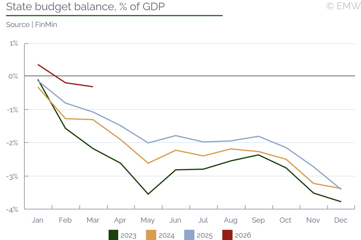 No major shift in fiscal policy in 2026, one-off windfalls to cover initial spending spree As mentioned above, the government left most of its fiscal policy commitments for implementation in 2027, which means there are few changes in policy in 2026. The biggest policy changes regard the removal of the renewable energy surcharge and a deal to raise public sector wages by 8.4%. As far as the surcharge is concerned, it will create an additional expense of CZK 17.1bn, which was supposed to be covered by the surcharge. Meanwhile, the government has shown itself as quite generous regarding public sector wages, though the impact has been mitigated by a decision taken by the previous government. What we refer to is non-teaching staff at schools, whose salaries will be now covered by local governments. This was a contentious issue with the previous government, as local governments protested against being burdened with additional expenses. Yet, the previous government argued that it had raised the share of nationally collected tax transferred to local governments, so they didn't have such a strong argument. In case, this is how the central government will need to cover only about half of the cost of higher public sector wages, rather than the full CZK 47-48bn projected for the general government. In all fairness, both of these expenses were covered by reducing defence spending from the initial budget bill, and cancelling a conditional expense related to the expansion of the Dukovany nuclear power plant. On the other hand, the new government is not doing anything about the much lower tax revenues from corporate taxes, which will be caused by the expiration of windfall tax. While there will be some residual revenue due in early 2026 (only on cash basis), the gap is more or less equivalent to the CZK 26bn increase in the state deficit target, which remains unaddressed.