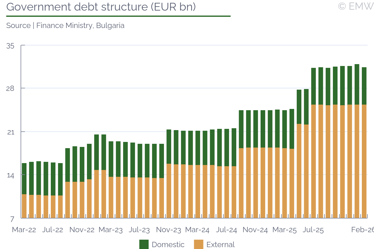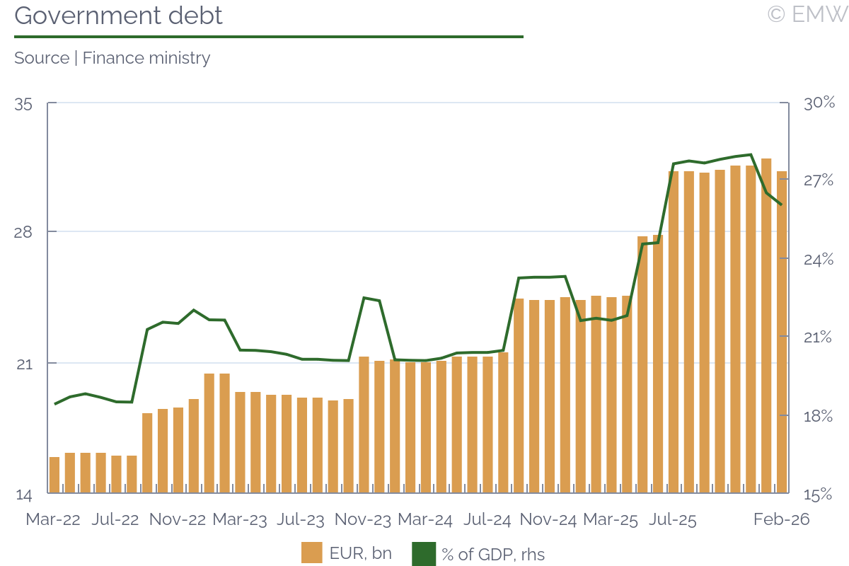 The new 2026 budget bill will bring only a modest fiscal loosening, despite some expectations, though some issues will remain. Given how the new ruling coalition took over the executive at the very end of 2025, it decided that there is no time for a major policy overhaul, which is why most policy commitments will be implemented as of 2027. This will be the watershed moment for fiscal policy, while 2026 will see policies largely unchanged. As a reminder, the 2026 budget set a deficit target at CZK 310bn (3.5% of GDP) at state government level, up from CZK 290.7bn (3.4% of GDP) in 2025. Meanwhile, the general government budget will see a deficit at 2.2% of GDP in 2026, up from 2% of GDP in 2025. While risks are technically on the downside, as GDP growth assumptions are optimistic, the 2026 budget will get an unexpected safety cushion, courtesy of the previous government. We refer to EU flows, as what the previous government did was to spend on EU-funded programmes in advance, with flows from the EU budget coming late. Thus, even though we see a non-negligible risk for a deterioration in the non-EU balance, it will be likely fully cushioned by the additional EU flows that were never received in 2025. As a reminder, the 2025 budget ended with a CZK 40.8bn deficit related to EU flows, so cash-based performance will likely turn out better than planned. We should emphasise that there isn't much the government can do, as EU rules do not allow these delayed payments to be included as revenue in the new budget. Risks to growth remain on the downside, mostly due to sluggish euro area growth Macroeconomic assumptions turned more optimistic since the first 2026 budget bill was presented, with GDP growth now expected at 2.4% in 2026, up from 2% in the original budget bill. In all fairness, this was largely fuelled by the domestic economy beating expectations in 2025, and projections now assume that household consumption will remain a strong driver of growth. There are also expectations of a solid recovery in investment, which is where uncertainty lies. We should note that the previous macroeconomic projections assumed euro area growth of 0.5%, while the current ones lower that to 0.3%. Thus, we see some downside risks to growth related to optimistic expectations. Risks are not excessive, however, as a tight labour market and a public sector wage hike are expected to push nominal wages upwards, so strong household consumption doesn't come out of nowhere. Factors also include a softer headline inflation, at 2.1%, which should also promote consumption. Thus, the odds are that if there are deviations, they will remain relatively manageable. Nevertheless, we continue to see downside risks as non-negligible, as recovery in Germany, a main export market, is far from guaranteed, and risks related to global supply chains remain significant.